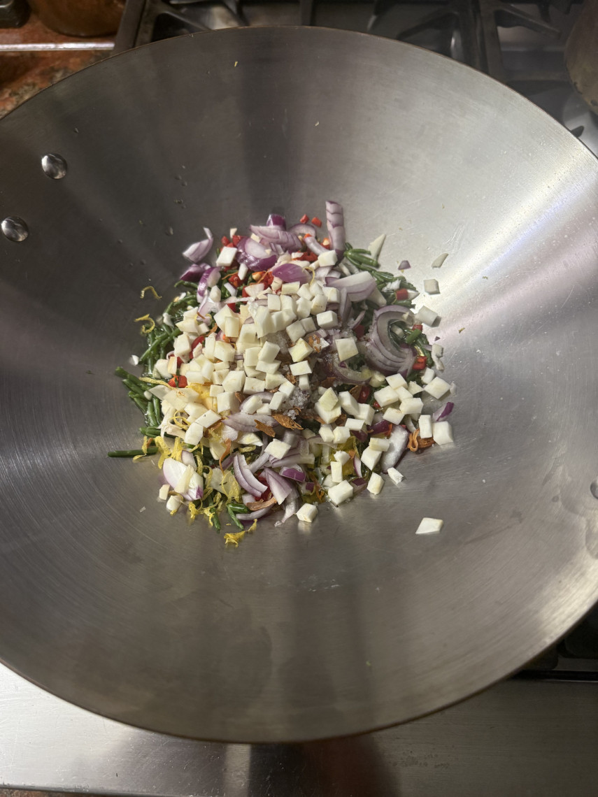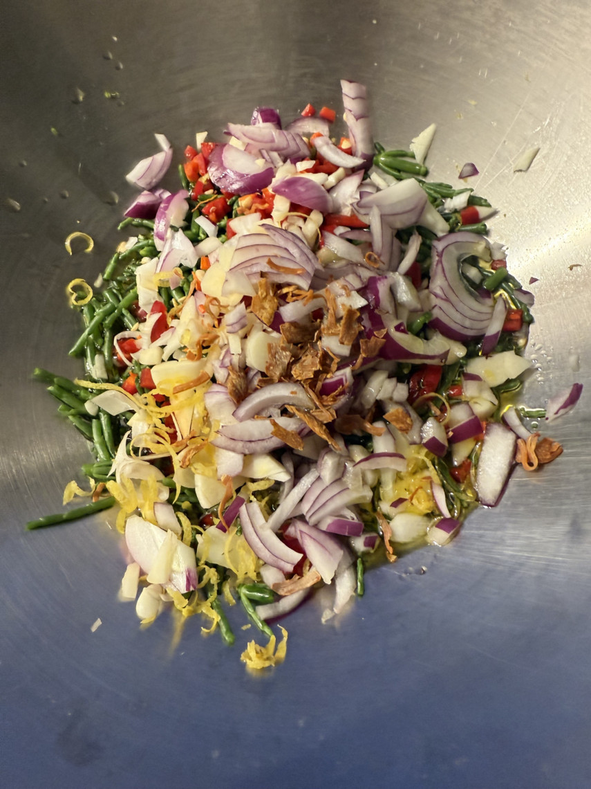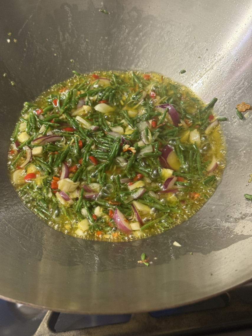 In einem Wok die kleingeschnittene Zwiebel, die 4 Knoblauchzehen, den klein geschnittenen Knollensellerie mit Macisblüten in Olivenöl zusammen mit den etwas klein geschnittenen Salicornes dünsten, mit Weißwein aufgießen und aufkochen lassen, dann die Muscheln hinzugeben, umrühren und mit Deckel dünsten. Muscheln, die sich nicht öffnen entfernen. 15 bis 20 Minuten köcheln lassen.