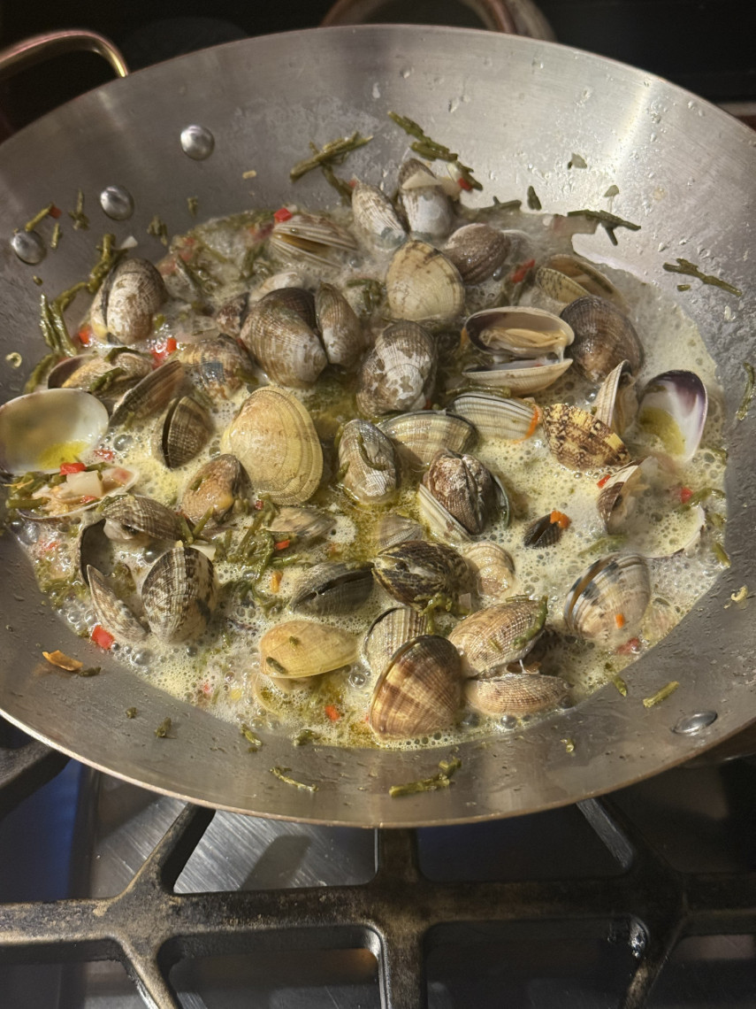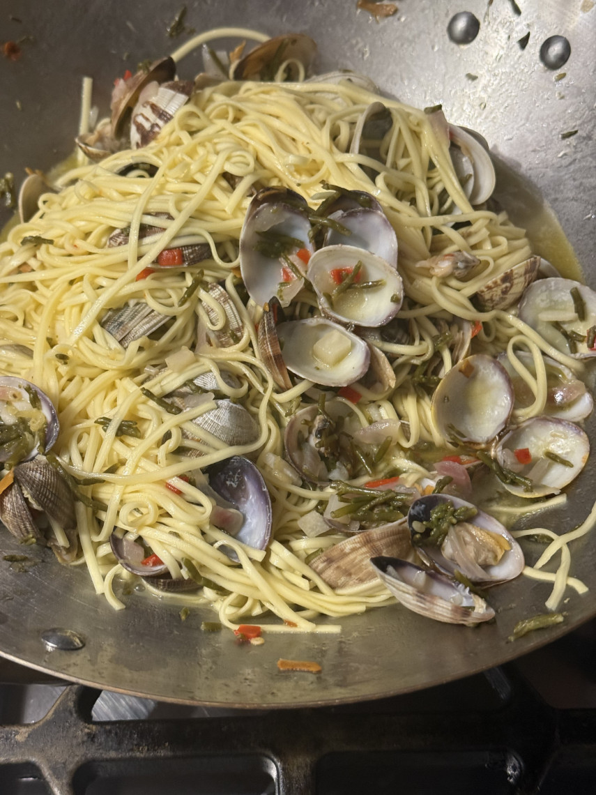 Zutaten für 2 Personen: 200 gr. Spaghetti, 80 ml Olivenöl, 1 klein geschnittene rote Zwiebel, 4 große kleingehackte Knoblauchzehen, 1 kg Venusmuscheln, 95 gr. etwas kein gehacktes Salicornes, ein wenig klein gewürfelter Knollensellerie, zisellierte Zitronenschale und Saft einer halben Zitrone, 1TL Macis (Muskatblüte), 150 ml Weißwein.