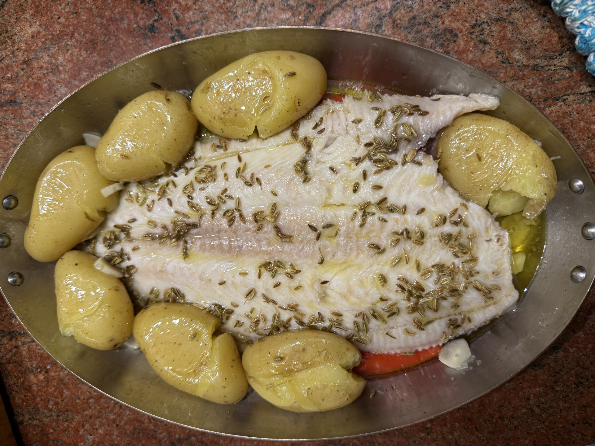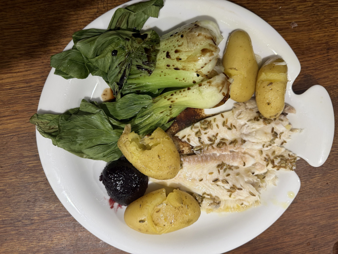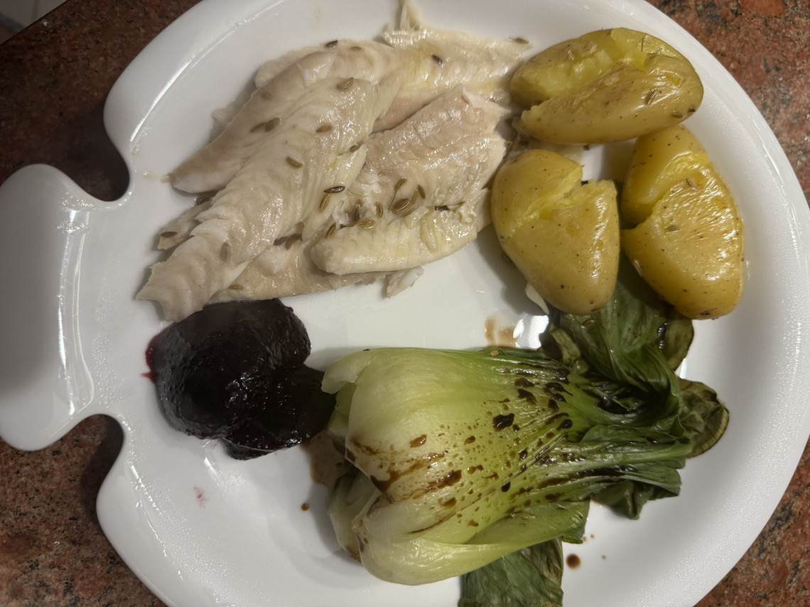 Zutaten für 2 Personen: Eine Seezunge, 520 gr, zwei Pack-Choi, ein paar Drillinge, 1 EL Gelee aus Feige und Johannisbeere, Olivenöl, Meersalz, Fenchelsaat, Knoblauch, etwas Zitronensaft.