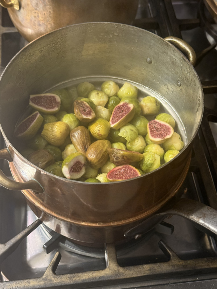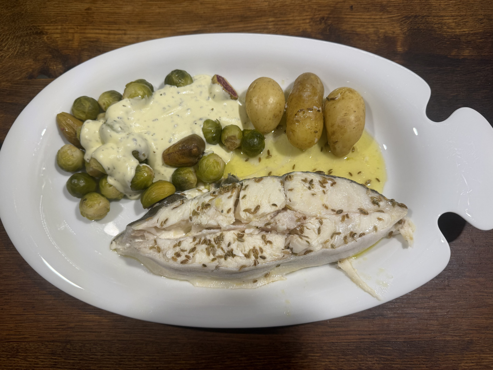 Zutaten und Zubereitung für 2 Personen: Zwei Heilbutt Steaks, 950 gr mit Olivenöl, Fenchelsaat und Meersalz in einer kleinen Pfanne mit Deckel garen, einmal wenden. Als Beilage gedämpfte Drillinge. Dazu 350 gr. Rosenkohl mit Feigen dämpfen und mit Dressing aus Joghurt, Olivenöl, Zitrone, Meersalz und Kräutern der Provence servieren.