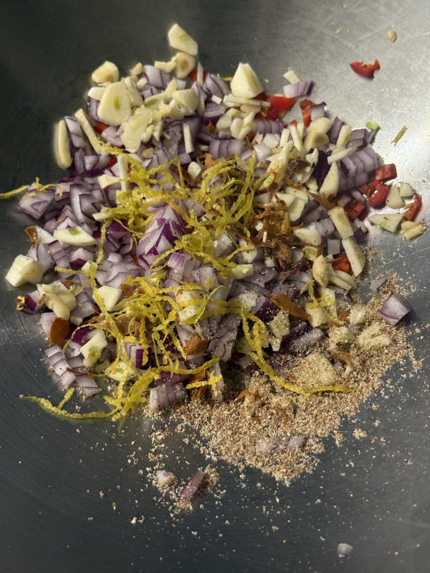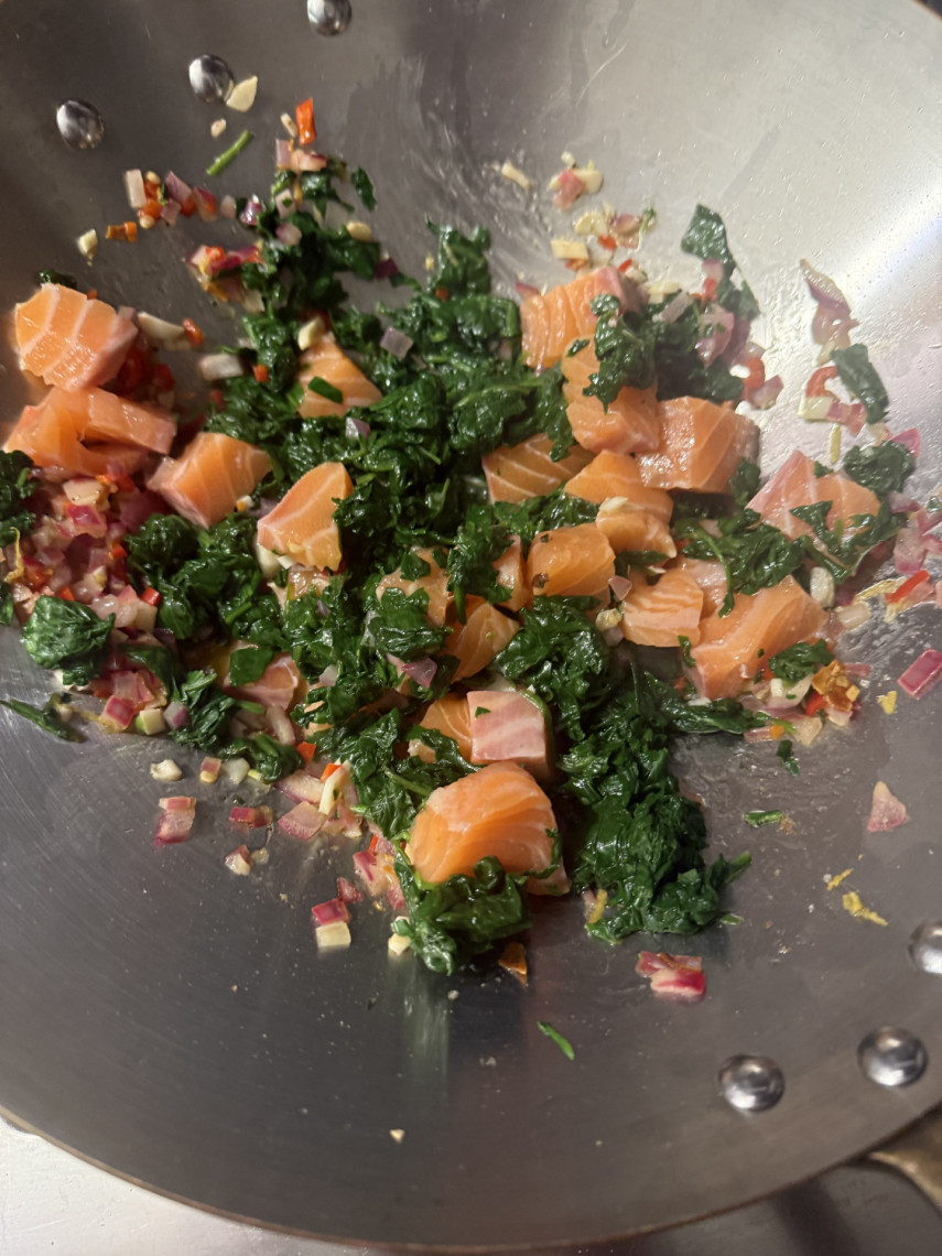 Zubereitung: Zwiebeln, Knoblauch, Peperoni und Zitronenzester in Olivenöl in einem Wok dünsten. Den Spinat abwaschen, blanchieren, abgeschrecken, mit der Hand ausgepressen und kreuz und quer klein schneiden, dann in den Wok geben. Den Lachs von der Haut befreien, gewürfelt hinzugeben und kurz garen. Mit den Gewürzen abschmecken. Eine Kelle Nudelwasser und die gekochte Nudeln hinzugeben, gut umrühren und servieren.