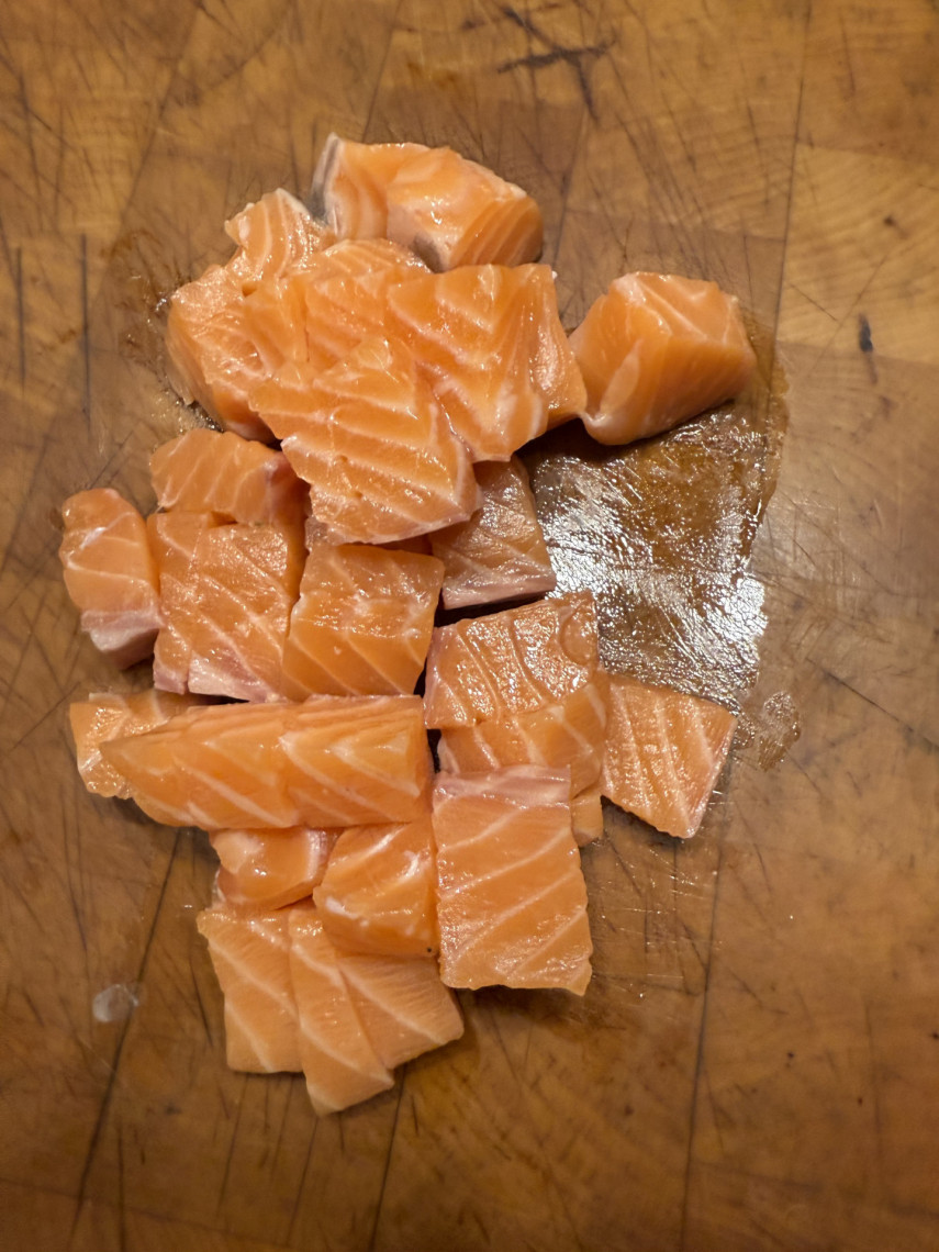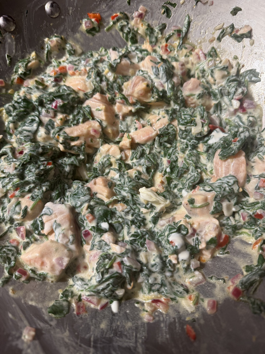 Zutaten für 3 Personen: 180 gr. Spaghetti, 300 gr. Lachsfilet, 250 gr. junger Blattspinat, eine kleine geschnittene Zwiebeln, 4 zerdrückte und klein gehackte Knoblauchzehen, 1 rote Peperoni, grobes Meersalz, Zester einer Zitronenschale, 50 ml Olivenöl, 150 gr. Crème fraîche, 1 TL Macisblüte, 2 MS Muskatnuss, Saft einer halben Zitrone.