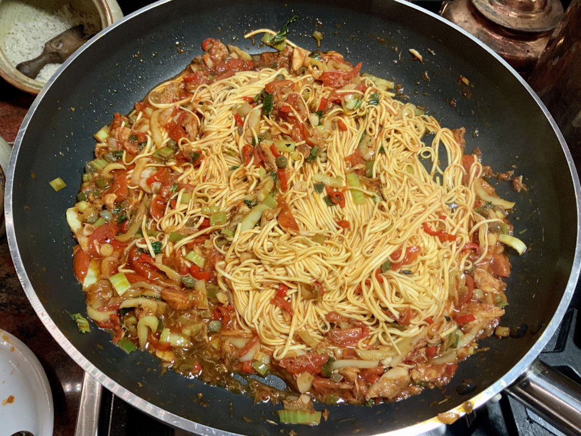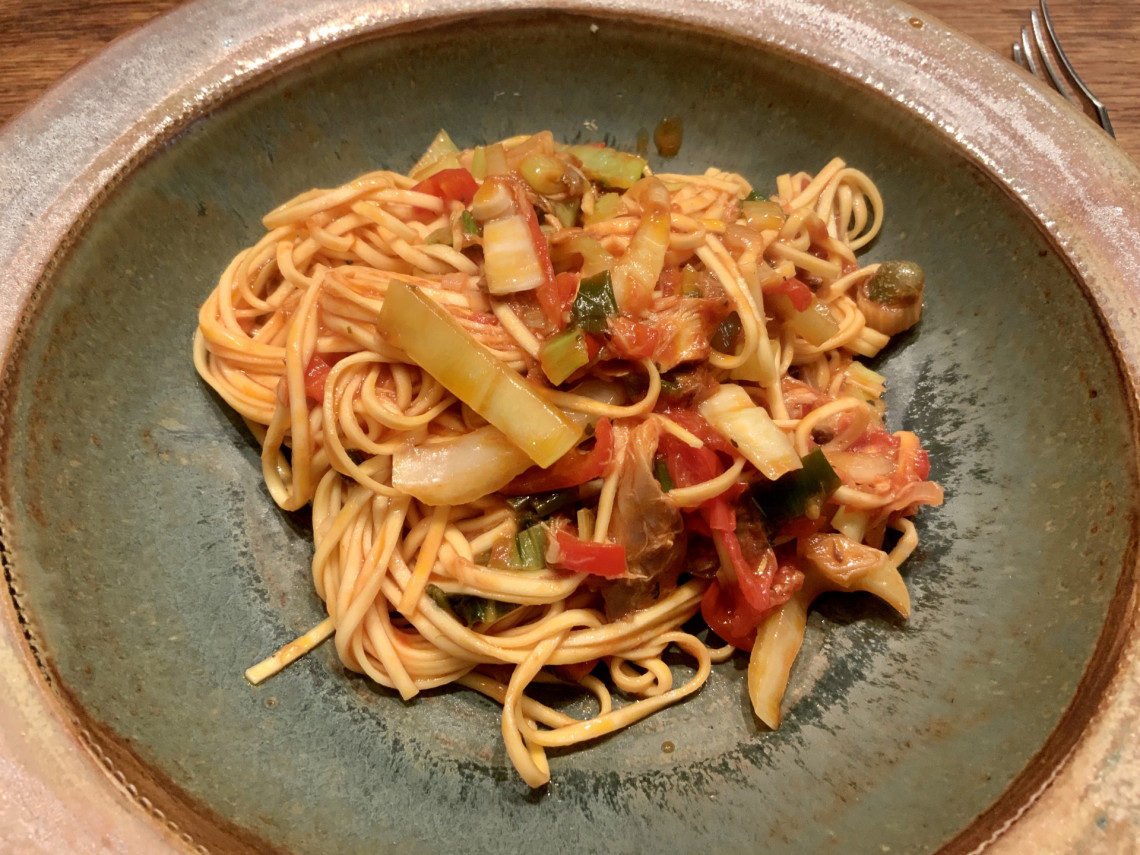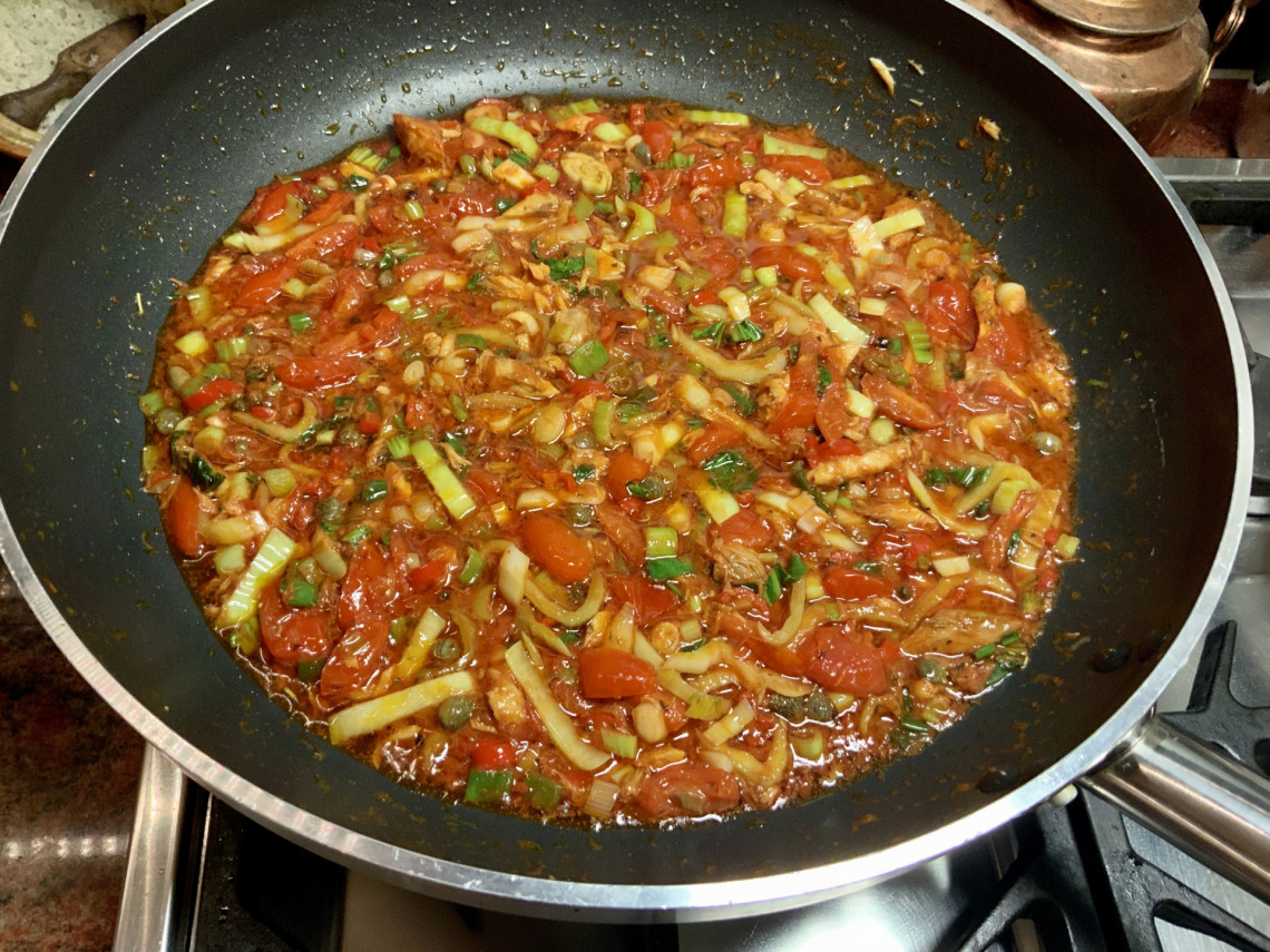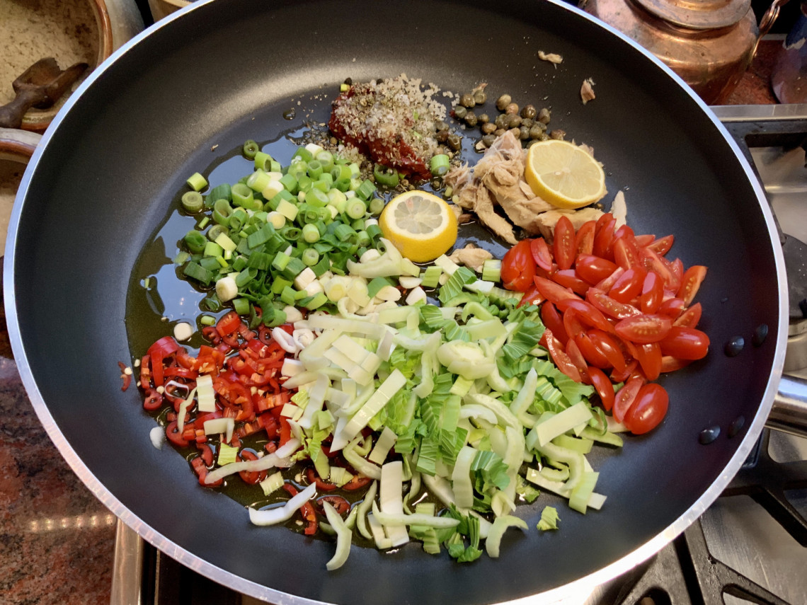 Zutaten: Spaghetti, Olivenöl, Thunfisch aus dem Glas, Peperoni, Frühlingszwiebeln, Fenchel, Kapern, Zitrone, Tomatenmark, Krischtomaten, Meersalz, Pfeffer.
