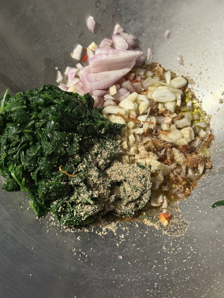 Zubereitung: Den Spinat abwaschen, blanchieren, abgeschrecken, mit der Hand ausgepressen und klein schneiden, dann mit den anderen Zutaten in den Wok geben und dünsten. Den Lachs von der Haut befreien, gewürfelt hinzugeben und kurz dünsten. Eine Kelle Nudelwasser und die gekochte Nudeln hinzugeben, gut umrühren oder mehrfach schwenken und servieren.