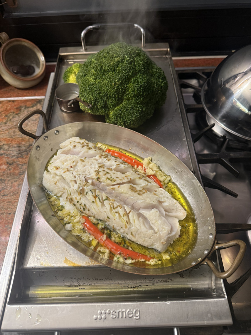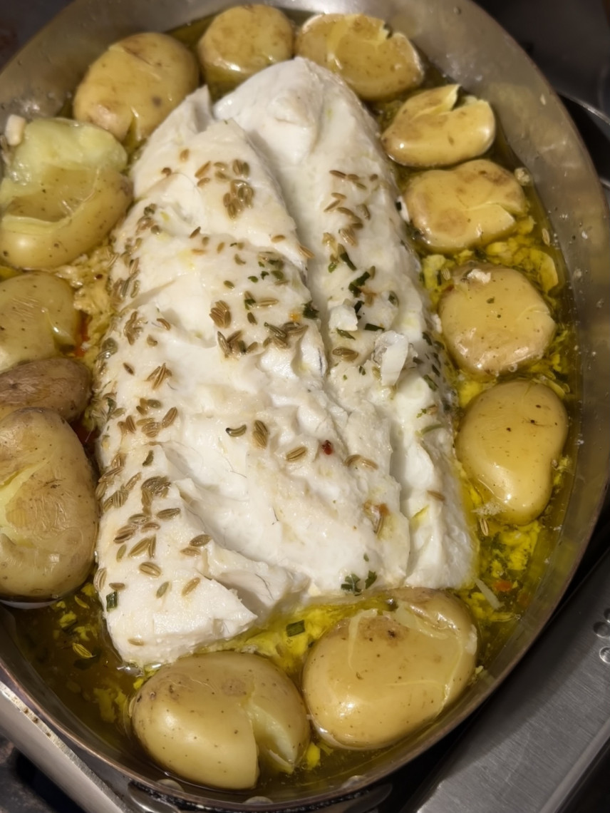 Zutaten: 600 gr. Seelachsfilet Loin, ein Broccoli 774 gr., Drillinge, 70 ml Olivenöl, 130 gr. Joghurt, Saft einer halben Zitrone, Kräuter der Provence, Fenchelsaat, Meersalz, 4 Knoblauchzehen, eine Peperoni.