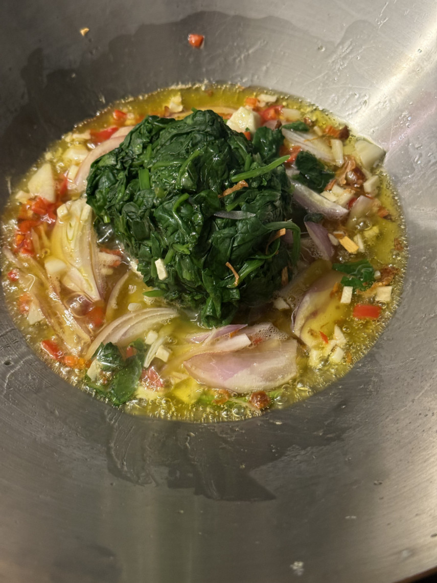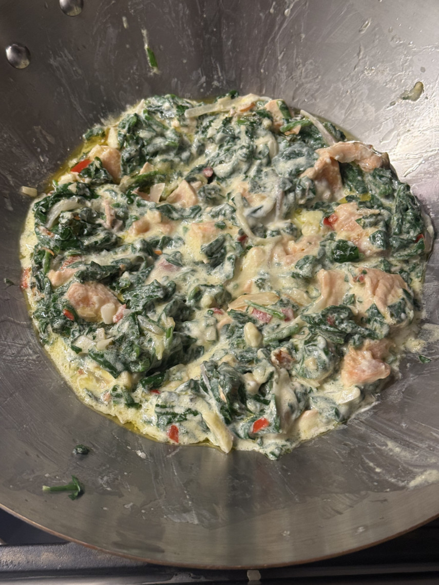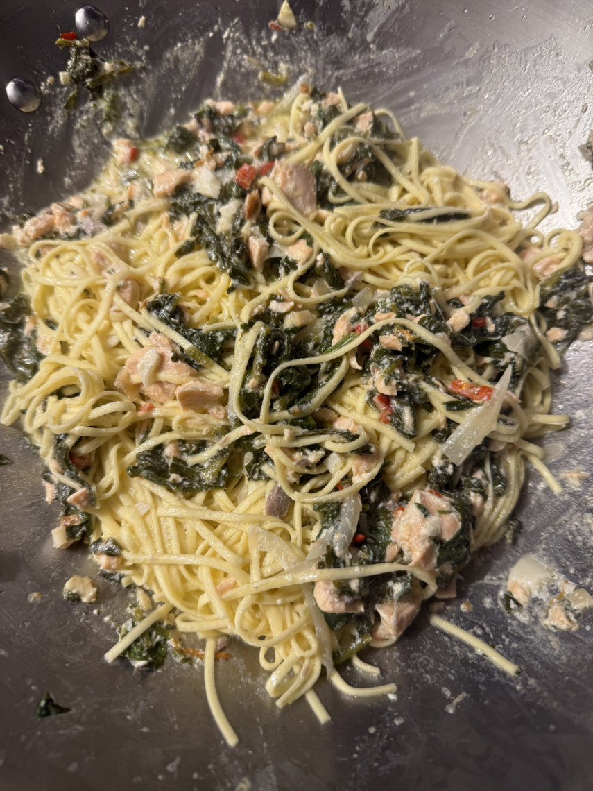 Zubereitung: Den Spinat abwaschen, blanchieren, abgeschrecken, mit der Hand ausgepressen und klein schneiden, dann mit den anderen Zutaten in den Wok geben und dünsten. Den Lachs von der Haut befreien, gewürfelt hinzugeben und kurz dünsten. Eine Kelle Nudelwasser und die gekochte Nudeln hinzugeben, gut umrühren oder mehrfach schwenken und servieren.