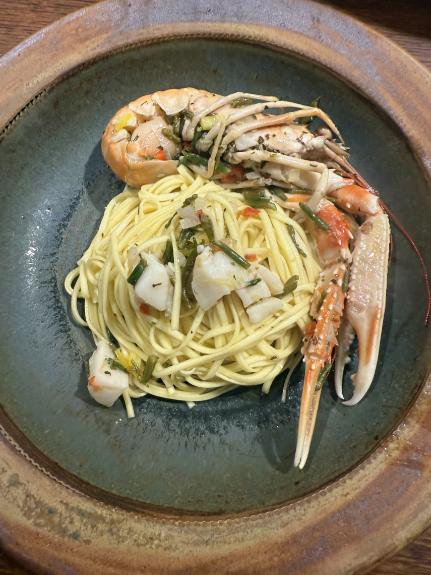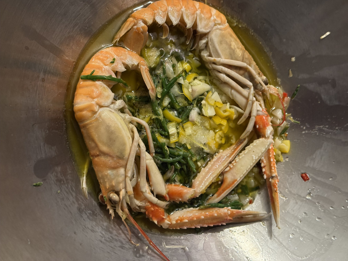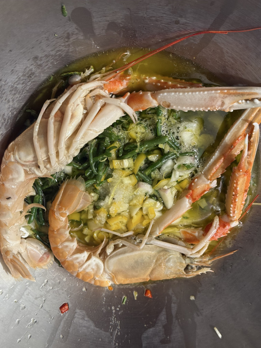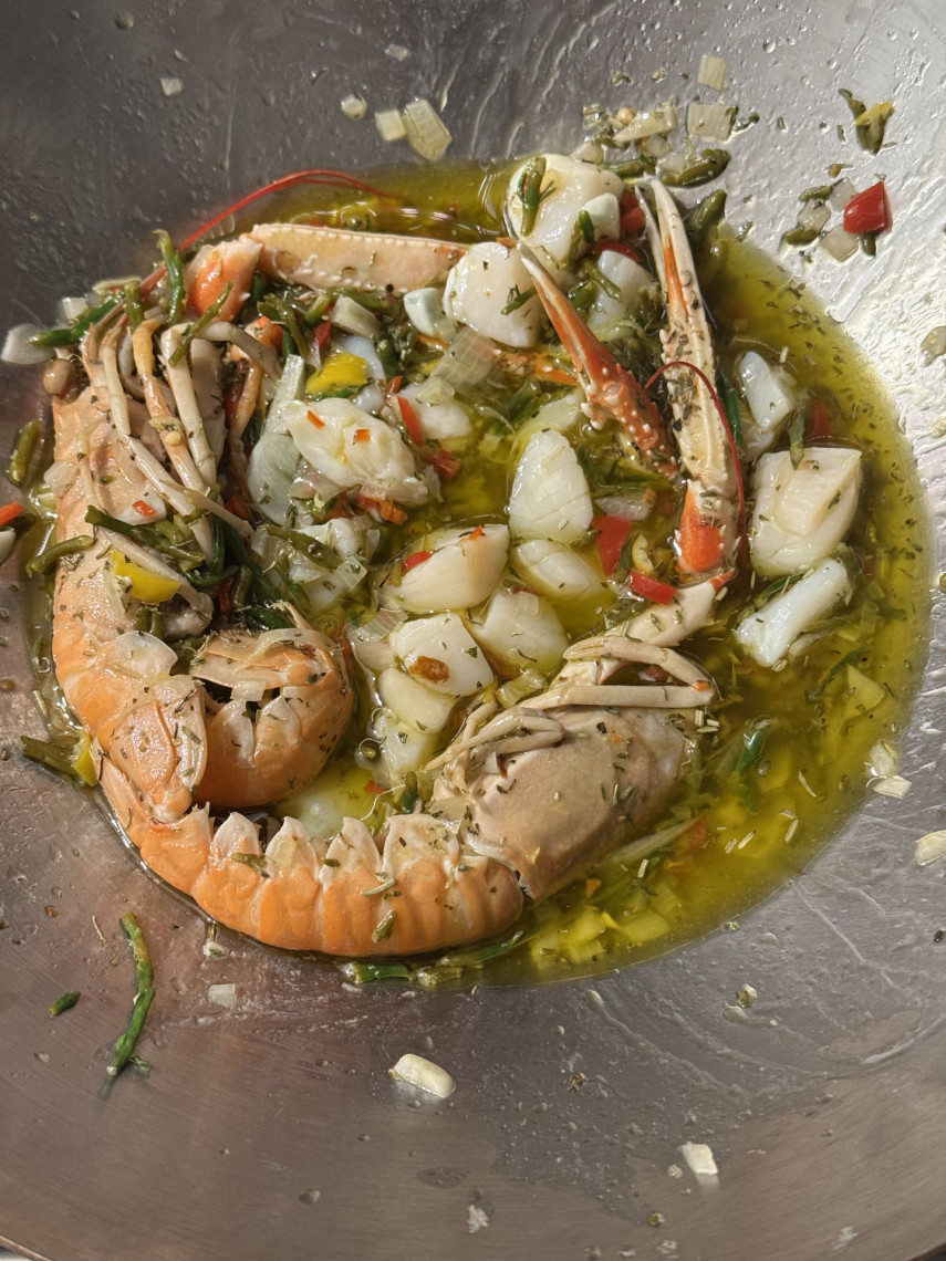 Zubereitung: Alle Zutaten bis auf das Kammmuschelfleisch in einem Wok oder einer Pfanne mit Deckel garen, die Zangen der Kaisergranate mit einer Zange brechen, zum Schluss das Kammmuschelfleisch hinzugeben und weitere 5 Minuten garen, Die gekochten Nudeln mit einer Kelle Nudelwasser hinzugeben, gut umrühren oder mehrfach schwenken und dann servieren.