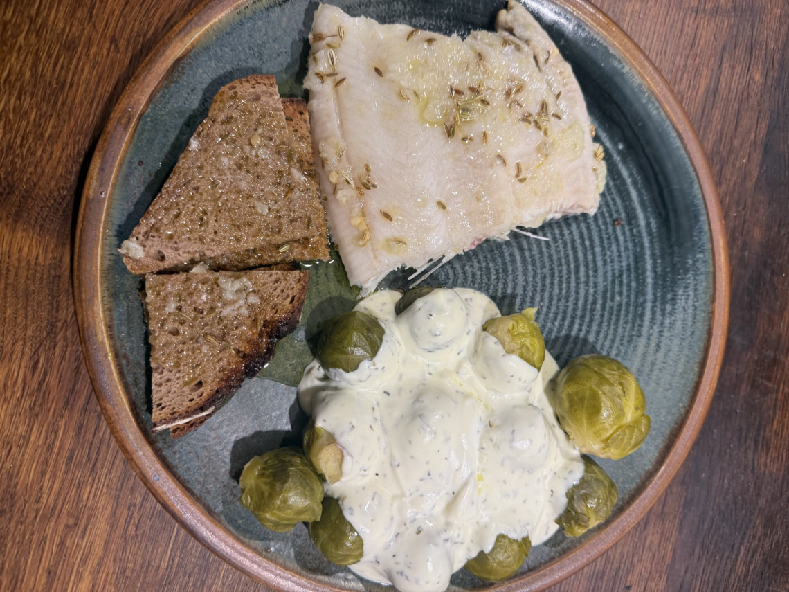 Zutaten für zwei Personen: Eine Seezungen, eine halbe frische Knoblauchknolle, Olivenöl, Rosenkohl, eine Peperoni, Joghurt, Olivenöl, Meersalz, Kräuter der Provence, Fenchelsaat, zwei Scheiben getoastetes Roggenbrot.