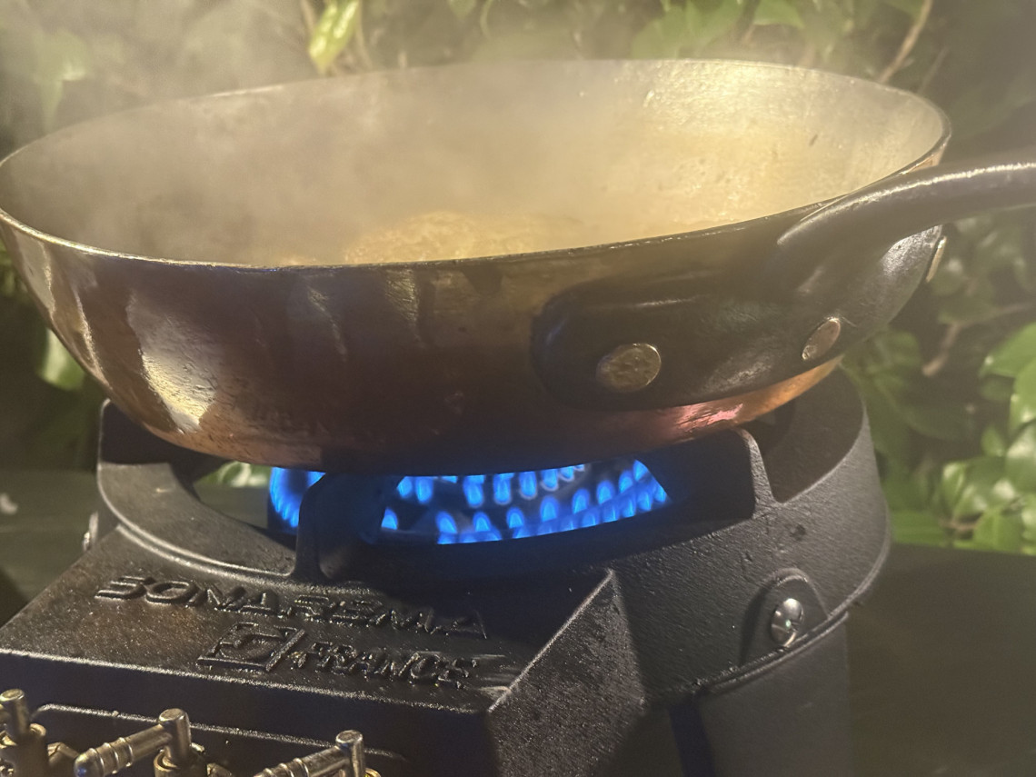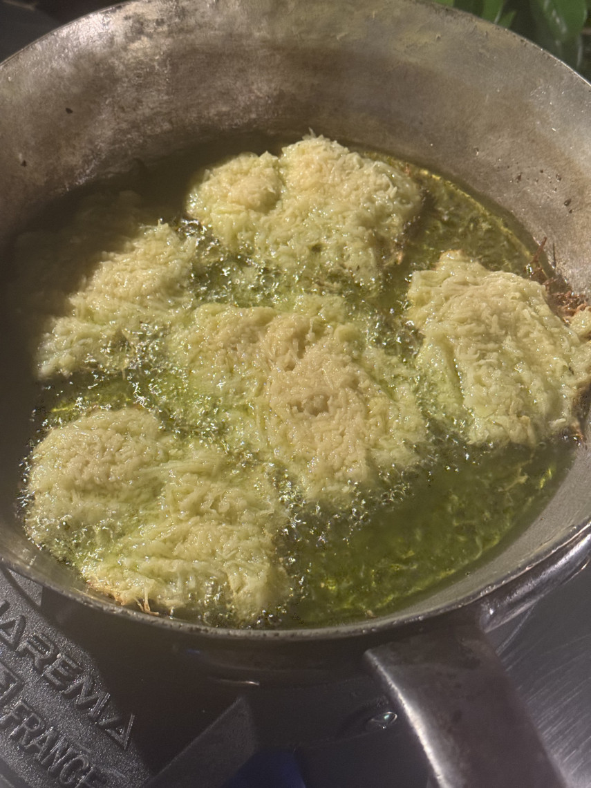 Zubereitung: Kartoffeln klein reiben (mittlere Schnittgröße), in einem Sieb abtropfen lassen, die Stärke (Bodensatz) der Kartoffelmasse wieder hinzufügen und mit Ei und Zwiebeln vermischen. Hier in einer großen massiven Kupferpfanne portionsweise in Olivenöl von beiden Seiten goldbraun garen. Servieren mit Räucherlachs, Apfelmus, Dijonsenf und Meerettich. Salat als Beilage.