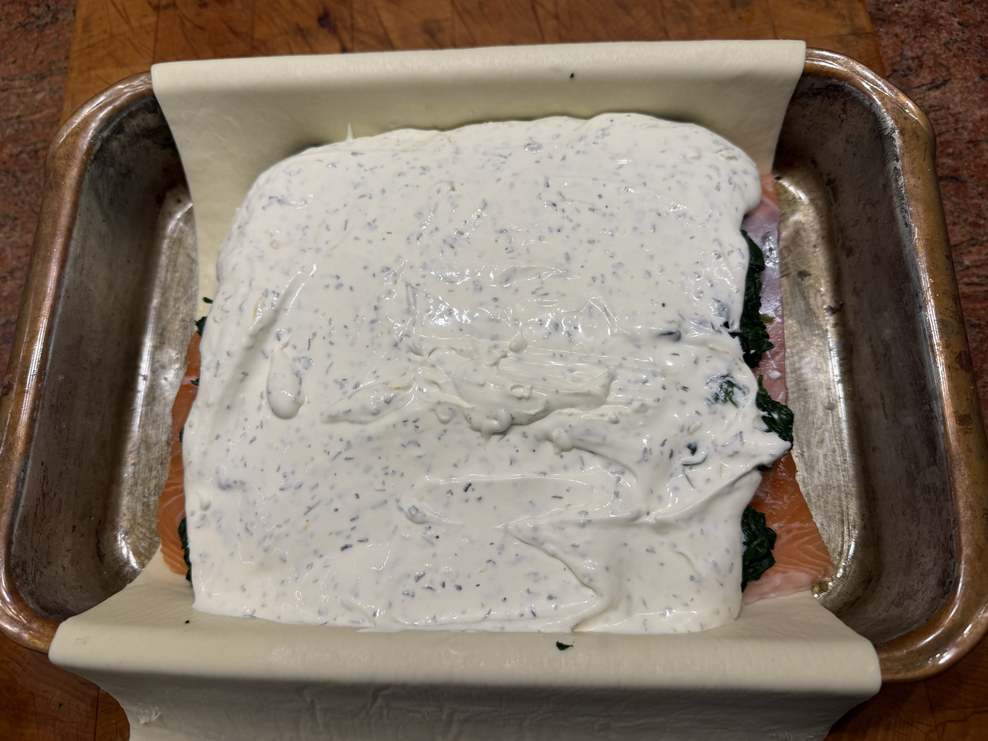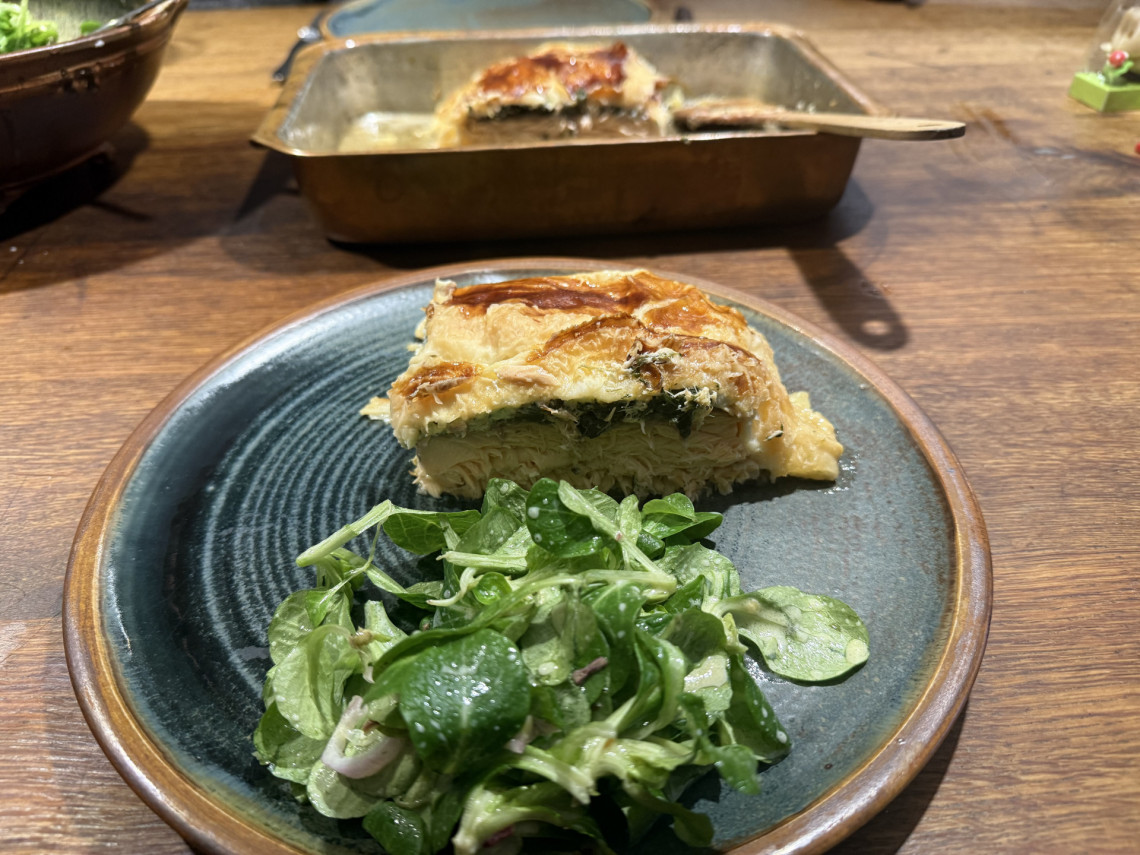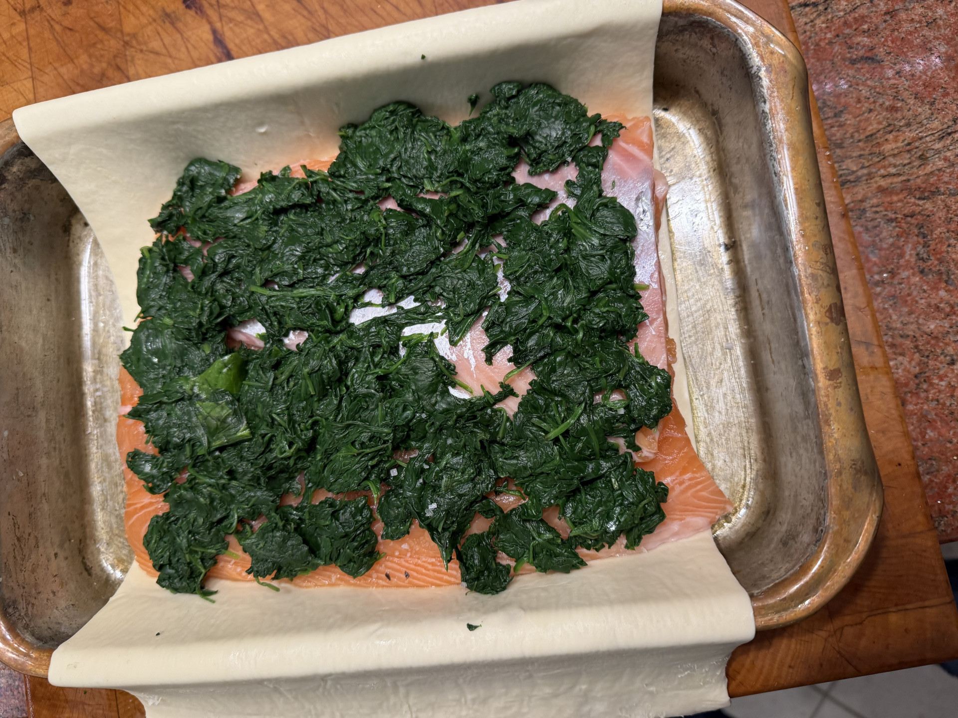 Zubereitung: Ganze Lachsseite enthäuten und entgräten und so zerteilen, dass ein rechteckiger Block entsteht. Den Lachs oben mit dem blanchierten Spinat und Crème fraîche (mit Kräutern, Meersalz, zisellierter Zitronenschale und Zitronensaft) in einen Blätterteig einschlagen. Das Eigelb mit einem Gumipinsel oben aufstreichen. Die Schnittkanten des Blätterteigs nicht verkneten, sonst geht der Blätterteit nicht auf. Im Backofen 60 Minuten bei 180°C. garen (auf einem Backblech oder wie hier in einer Auflaufform aus Kupfer).