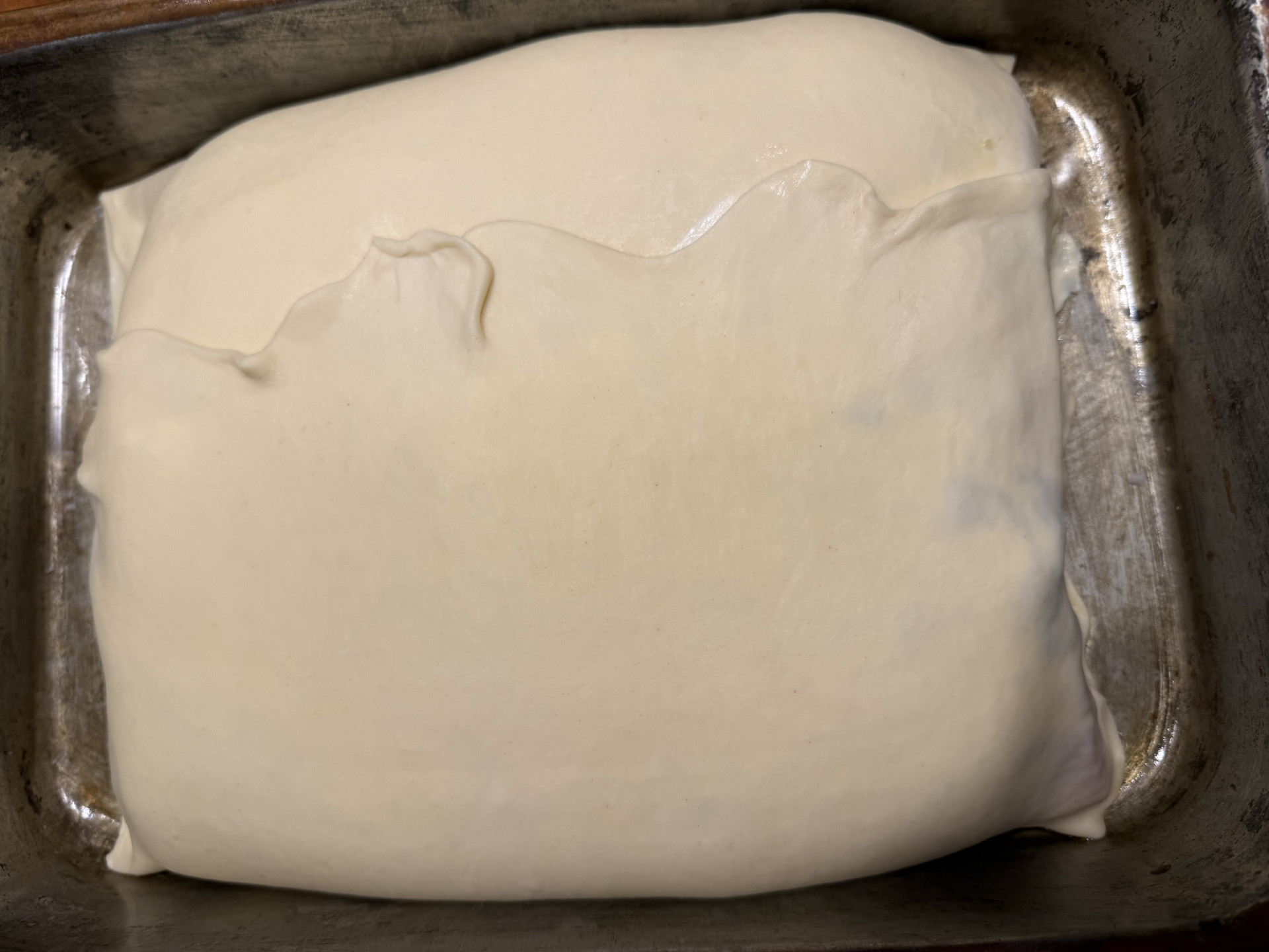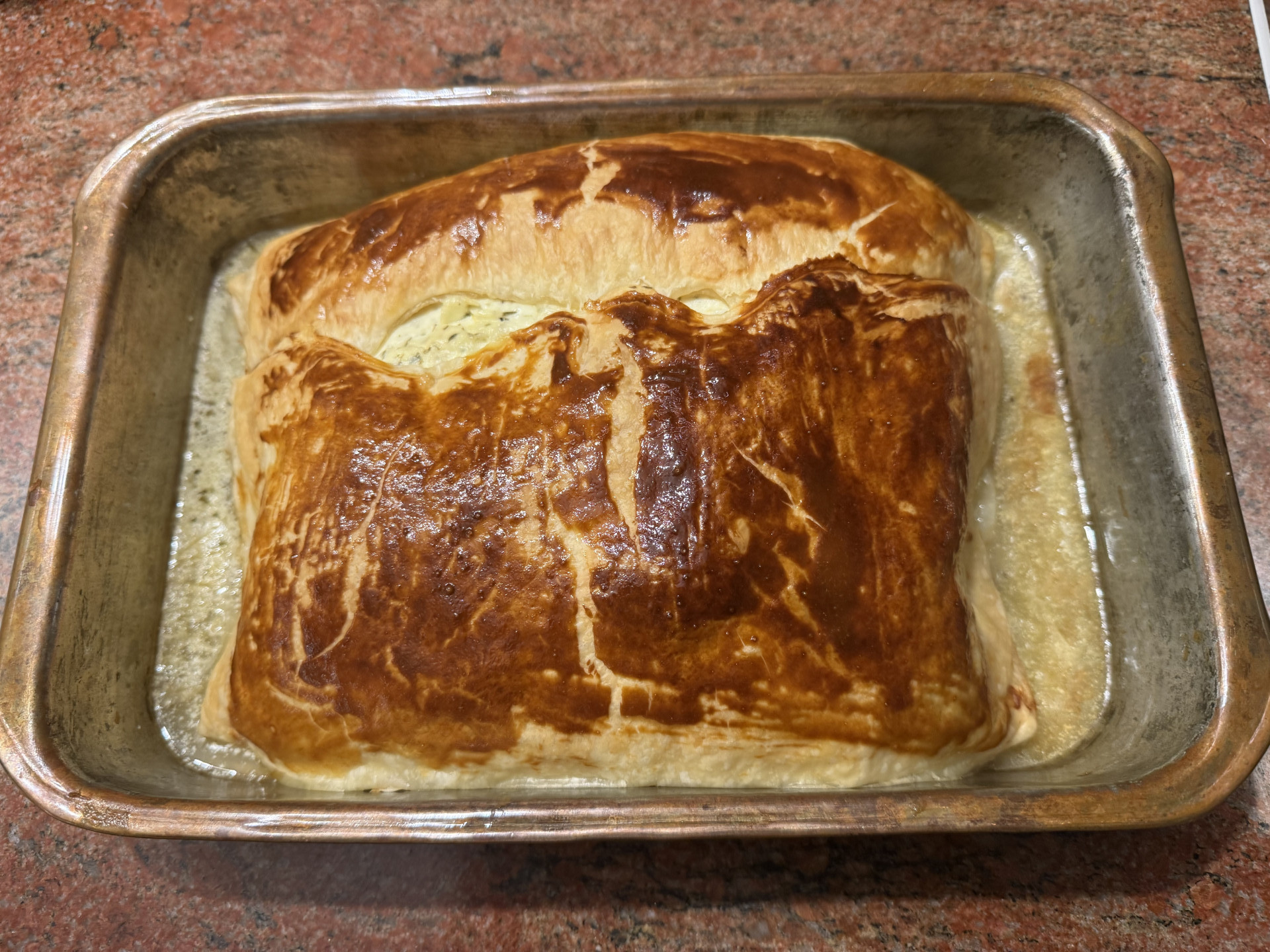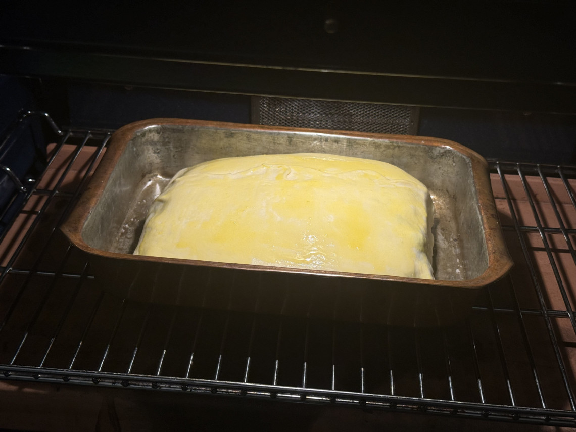Zubereitung: Ganze Lachsseite enthäuten und entgräten und so zerteilen, dass ein rechteckiger Block entsteht. Den Lachs oben mit dem blanchierten Spinat und Crème fraîche (mit Kräutern, Meersalz, zisellierter Zitronenschale und Zitronensaft) in einen Blätterteig einschlagen. Das Eigelb mit einem Gumipinsel oben aufstreichen. Die Schnittkanten des Blätterteigs nicht verkneten, sonst geht der Blätterteit nicht auf. Im Backofen 60 Minuten bei 180°C. garen (auf einem Backblech oder wie hier in einer Auflaufform aus Kupfer).
