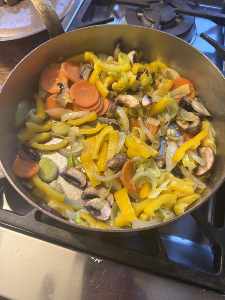 Klein geschnittene Paprika, Champignons und Zwiebeln mit Olivenöl in der Pfanne dünsten (ohne Deckel), mit Salz und Pfeffer würzen.