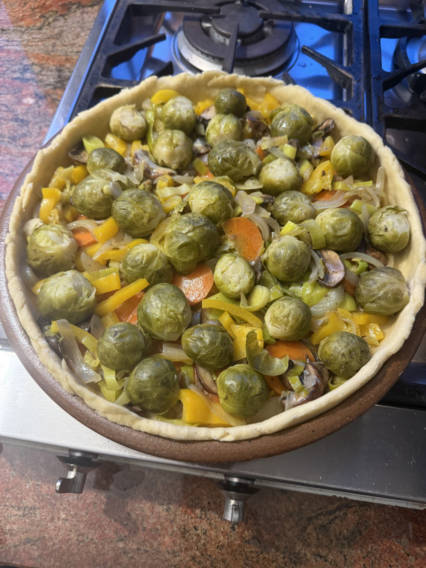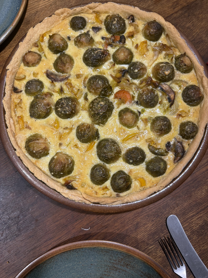 Mürbe-Hefeteig, Olivenöl, 2 Zwiebeln, eine gelbe Paprika, 6 Champignons, 300 gr Rosenkohl, eine Möhre, 1/2 Stange Lauch, 3 Eier, 150gr Crème fraîche und 70 ml Sahne, Meersalz und schwarzer Pfeffer.