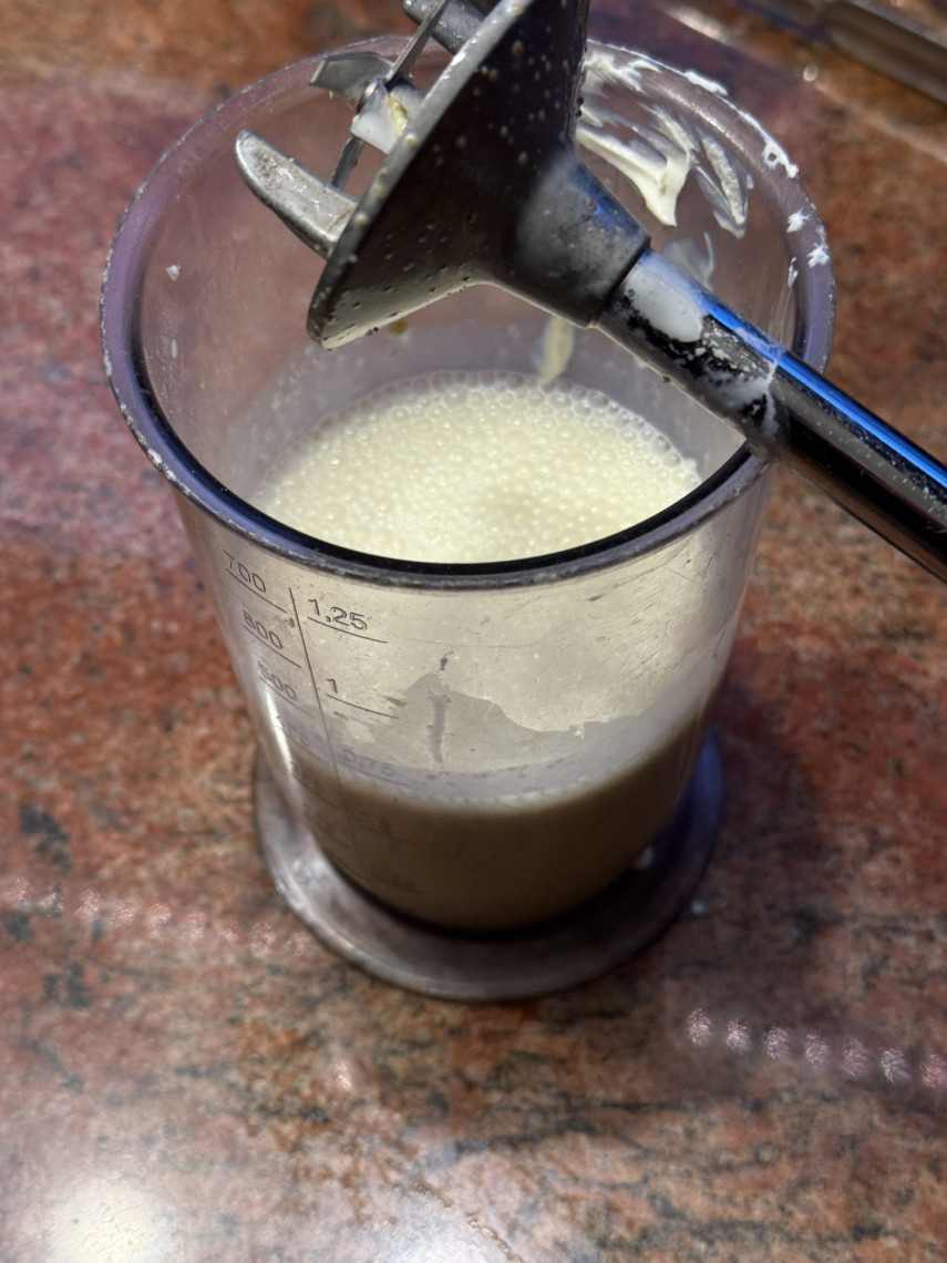 Für die Sauce 2 – 3 Eier mit 150 gr. Crème fraîche und der Sahne verquirlen, kräftig abschmecken (Salz, Pfeffer, Kräuter).