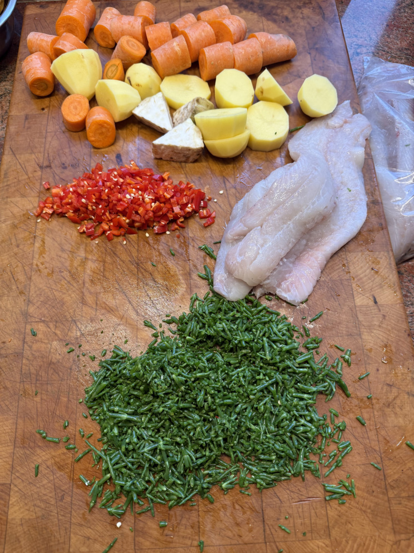 Brennwerte: Insges. 1687 kcal, 2840 g, Seelachs 1144 kcal, Zwiebeln 35 kcal, Salicornes 51 kcal, Kartoffel 325 kcal, Möhren 120 kcal, Sellerie 12 kcal, Peperoni 25 kcal, 60 kcal/100g.