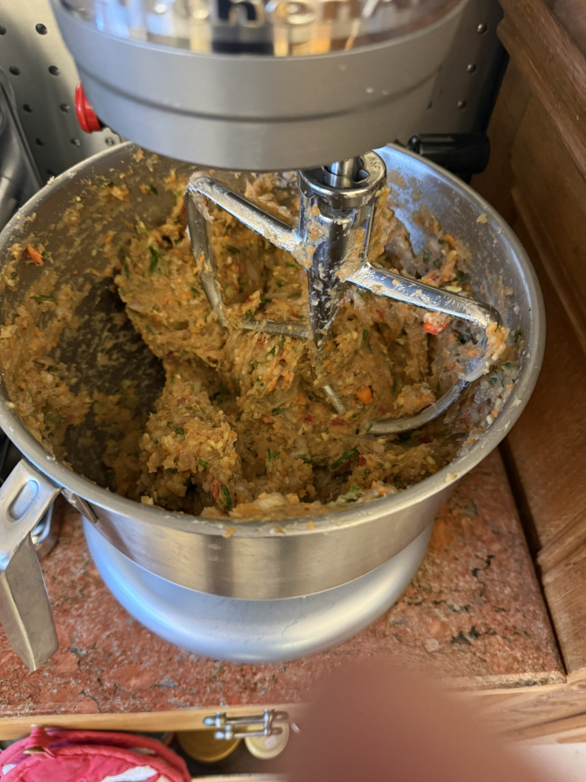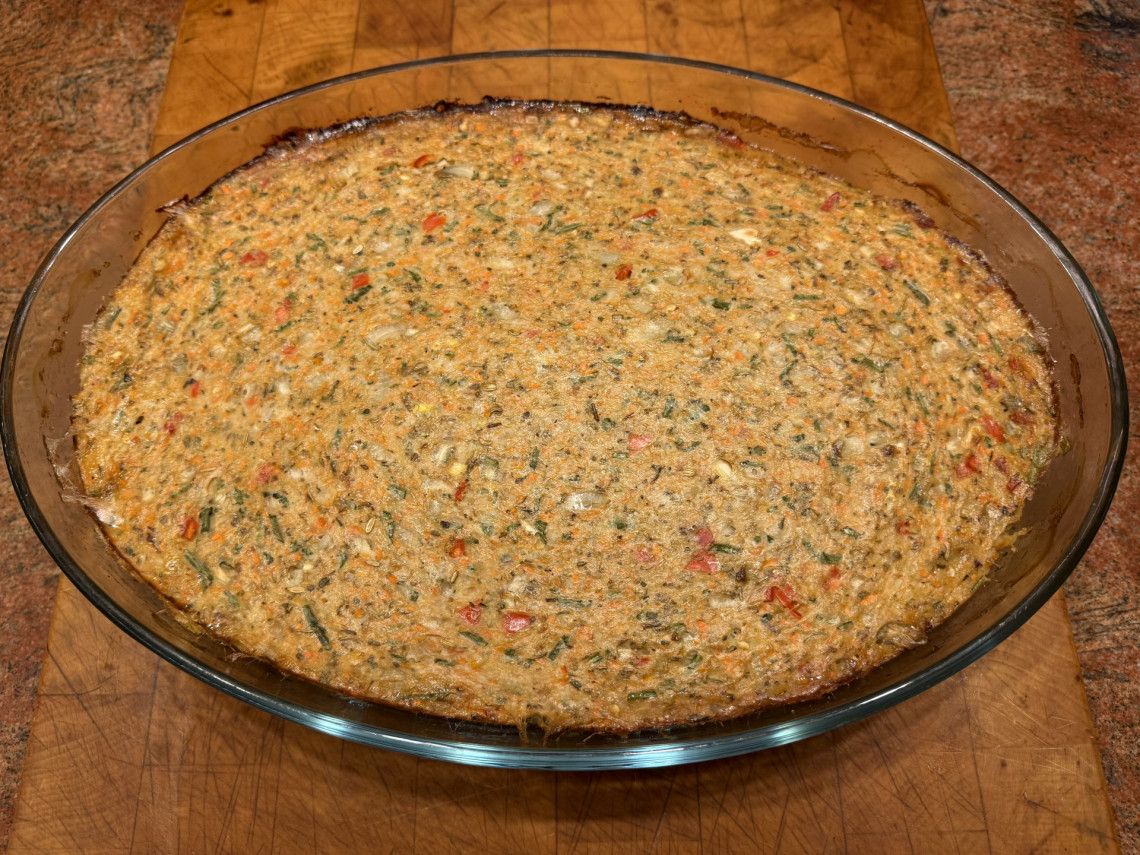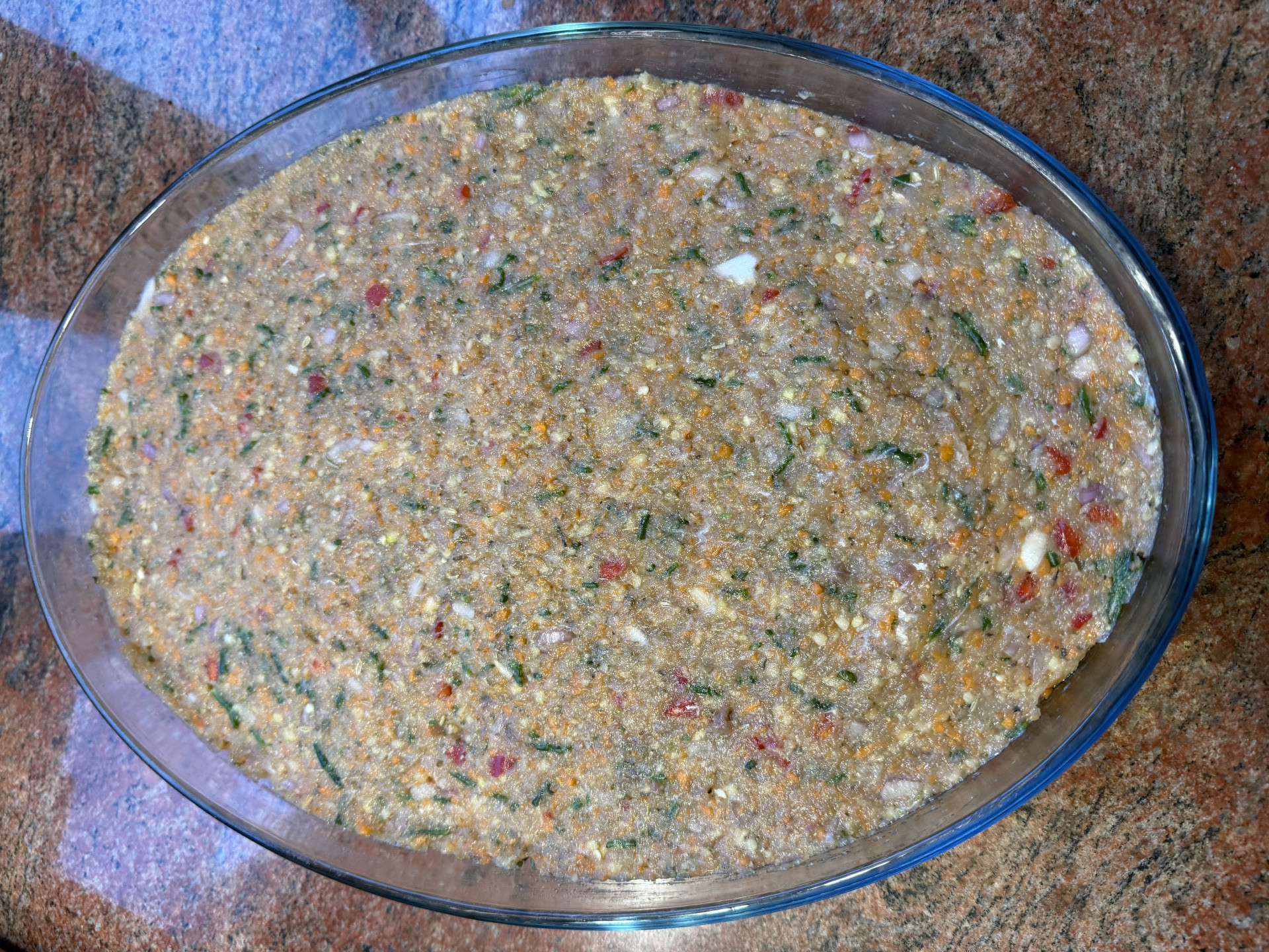 Zubereitung: Die entgräteten Fischfilets, die Möhren,den Sellerie und die Kartoffeln durch einen Fleischwolf drehen. Zwiebel und Peperoni klein schneiden. Alle Zutaten gründlich in einem 6 Liter Rührwerk (Kitchen Aid) vermengen und in eine Auflaufform die zuvor mit Olivenöl eingestrichen wurde geben und glatt streichen. Im Backofen zwei Stunden bei 170 Grad Umluft garen.
