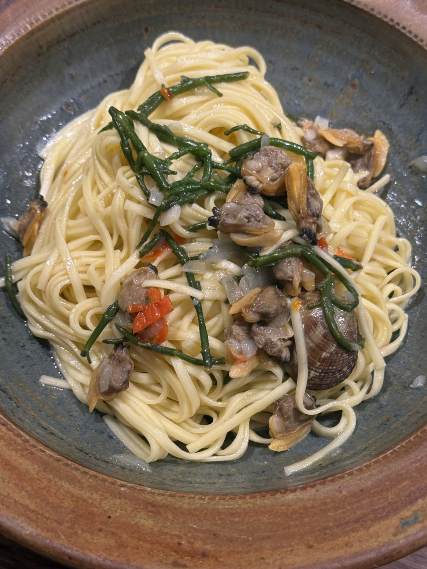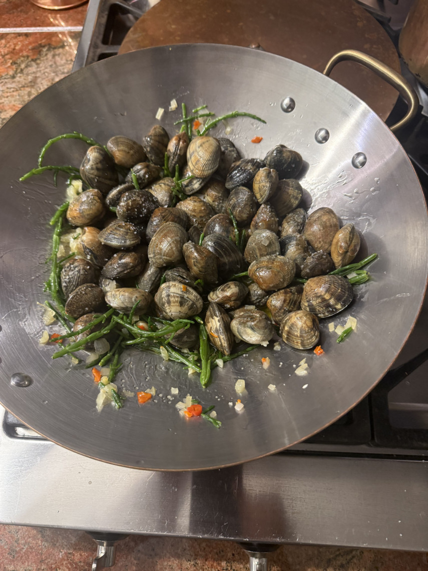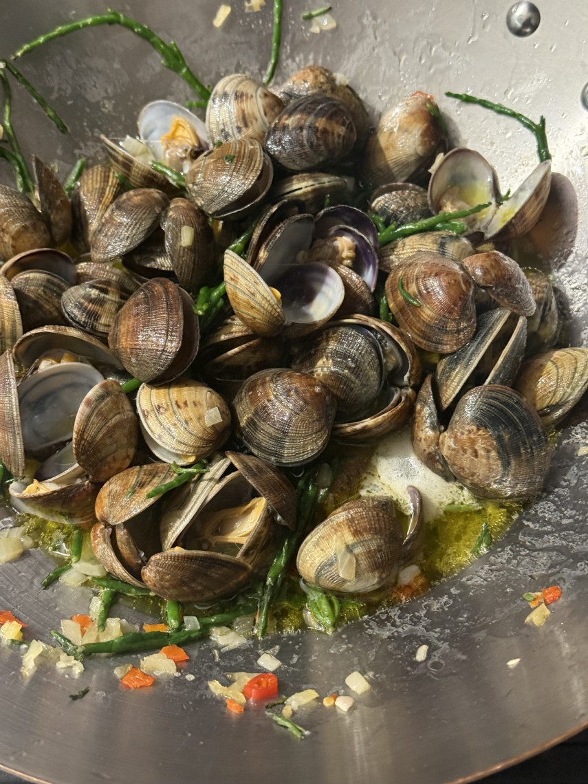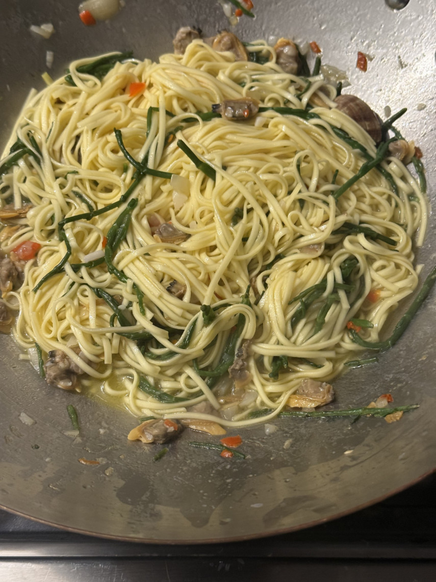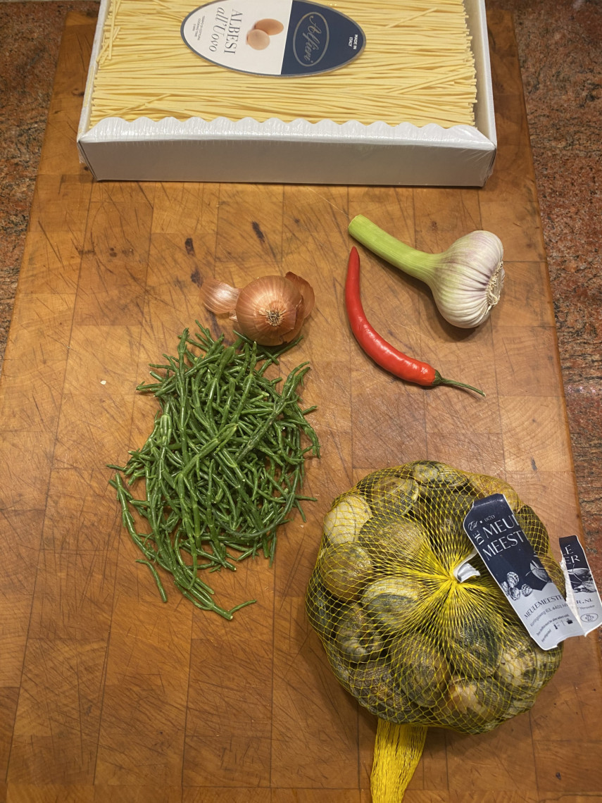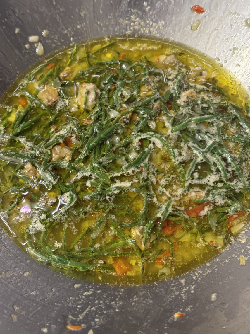 Zutaten für 2 Personen: 195 gr. Spaghetti, 1 kg Venusmuscheln, 70 ml Olivenöl, 125 ml Weißwein, 1 klein geschnittene rote Zwiebeln, 45 gr. Salicornes, 5 große kleingehackte Knoblauchzehen, 1 klein geschnittene Peperoni