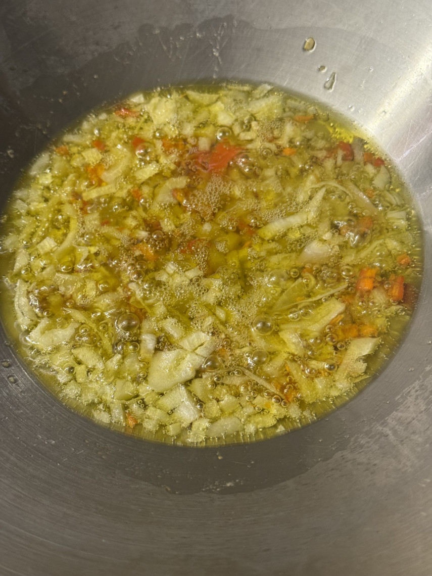 In einem Wok die Zutaten in Olivenöl dünsten, erst den Weißwein, dann die Muscheln hinzugeben und mit Deckel dünsten. Muscheln, die sich im Dampf nicht öffnen entfernen. Das Muschelfleisch mit einer Pinzette entnehmen und die Muschelschalen entfernen.