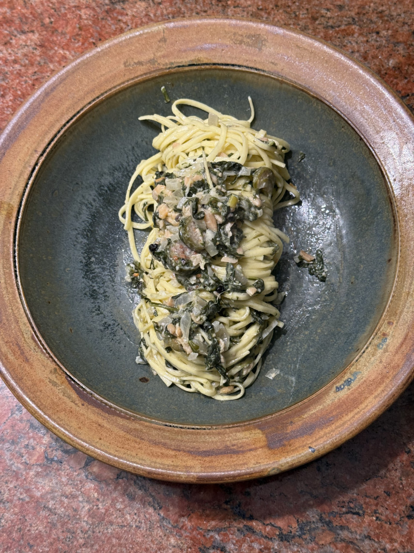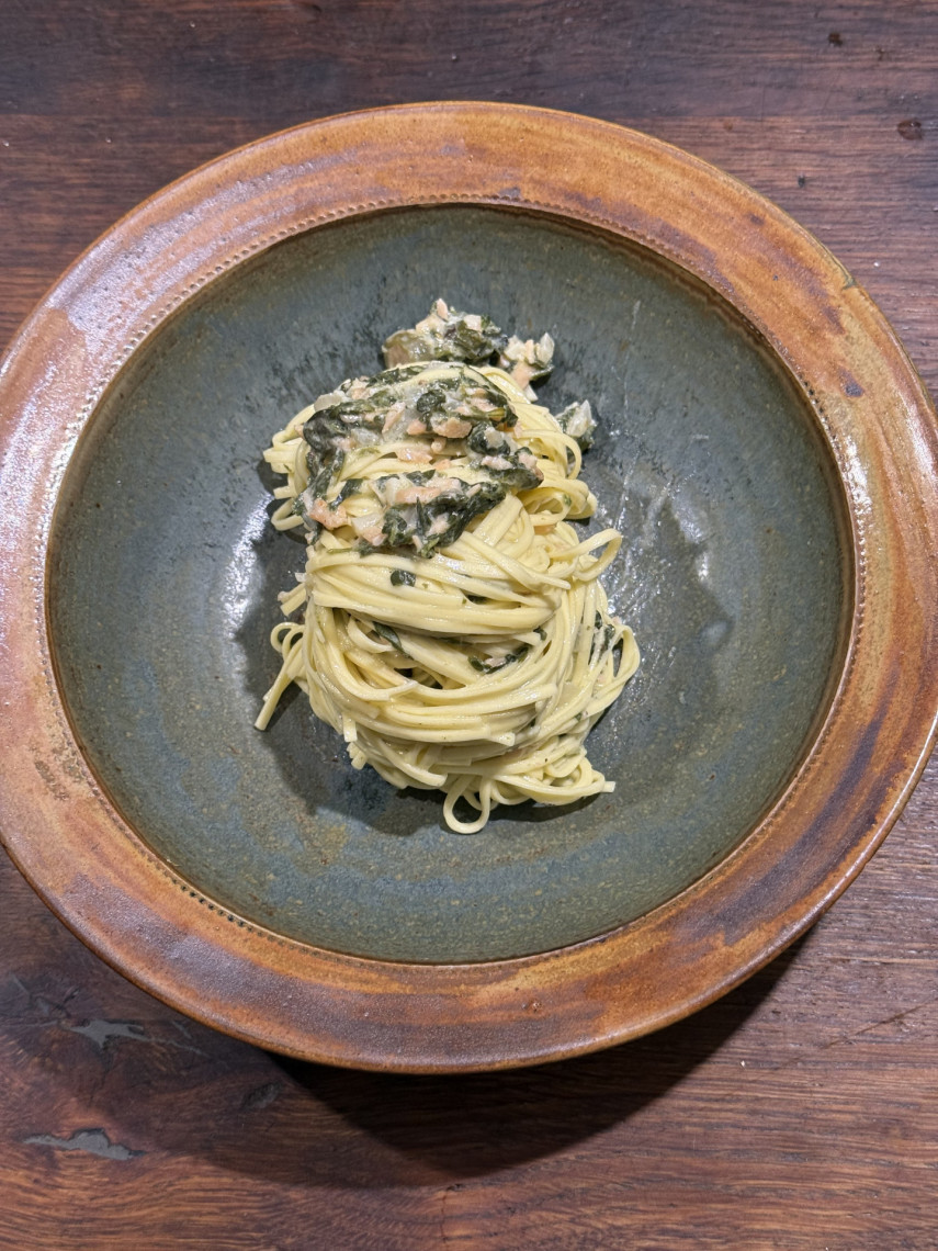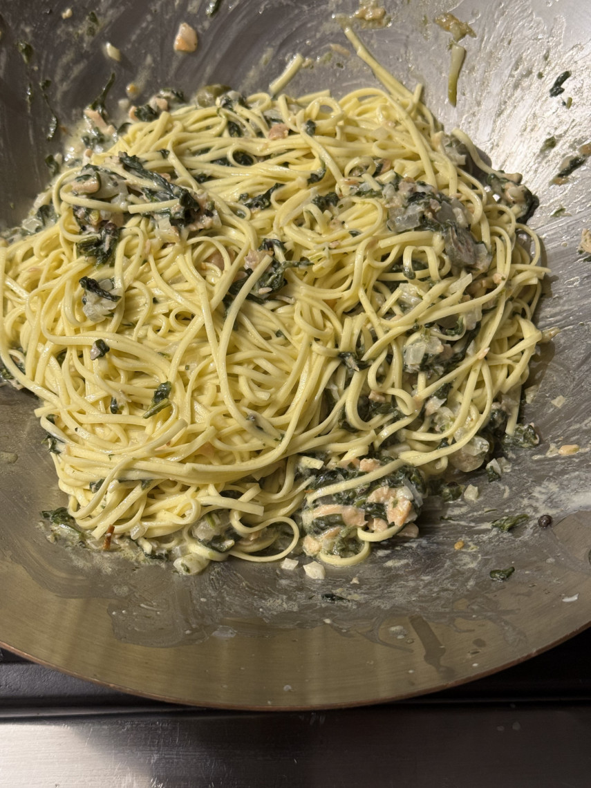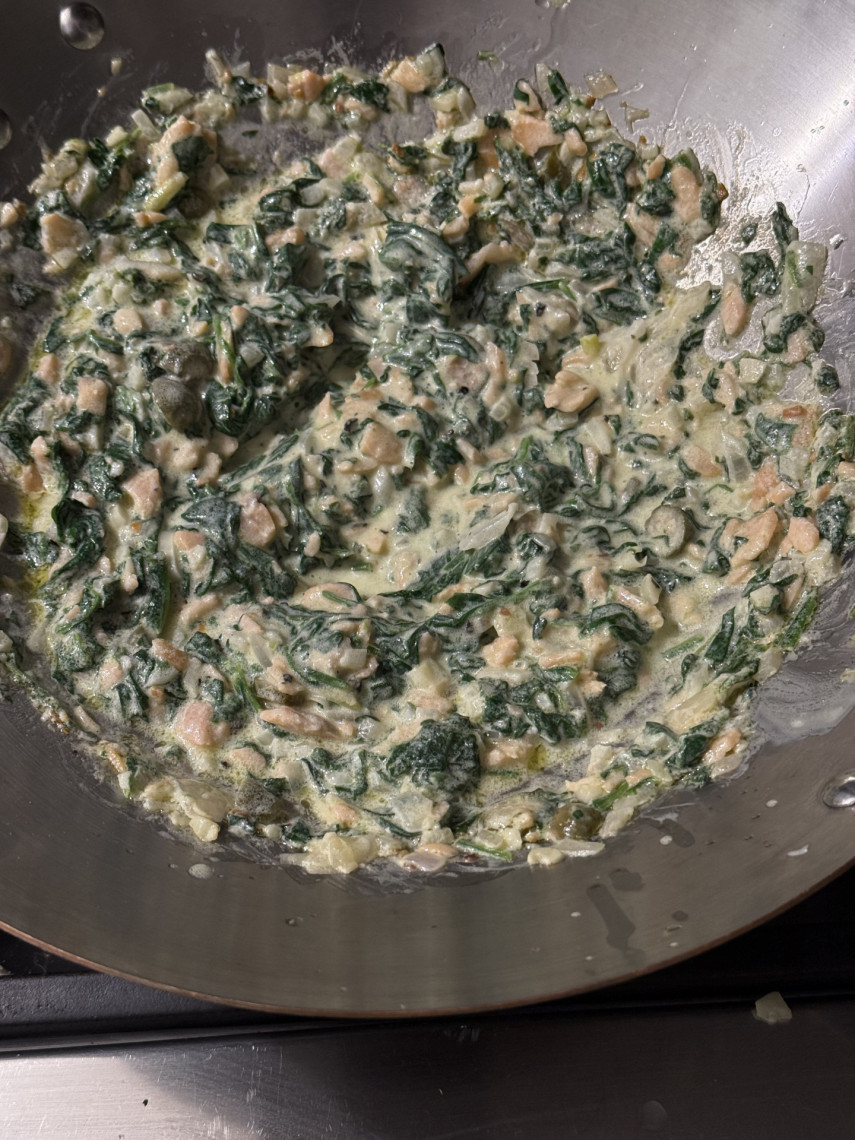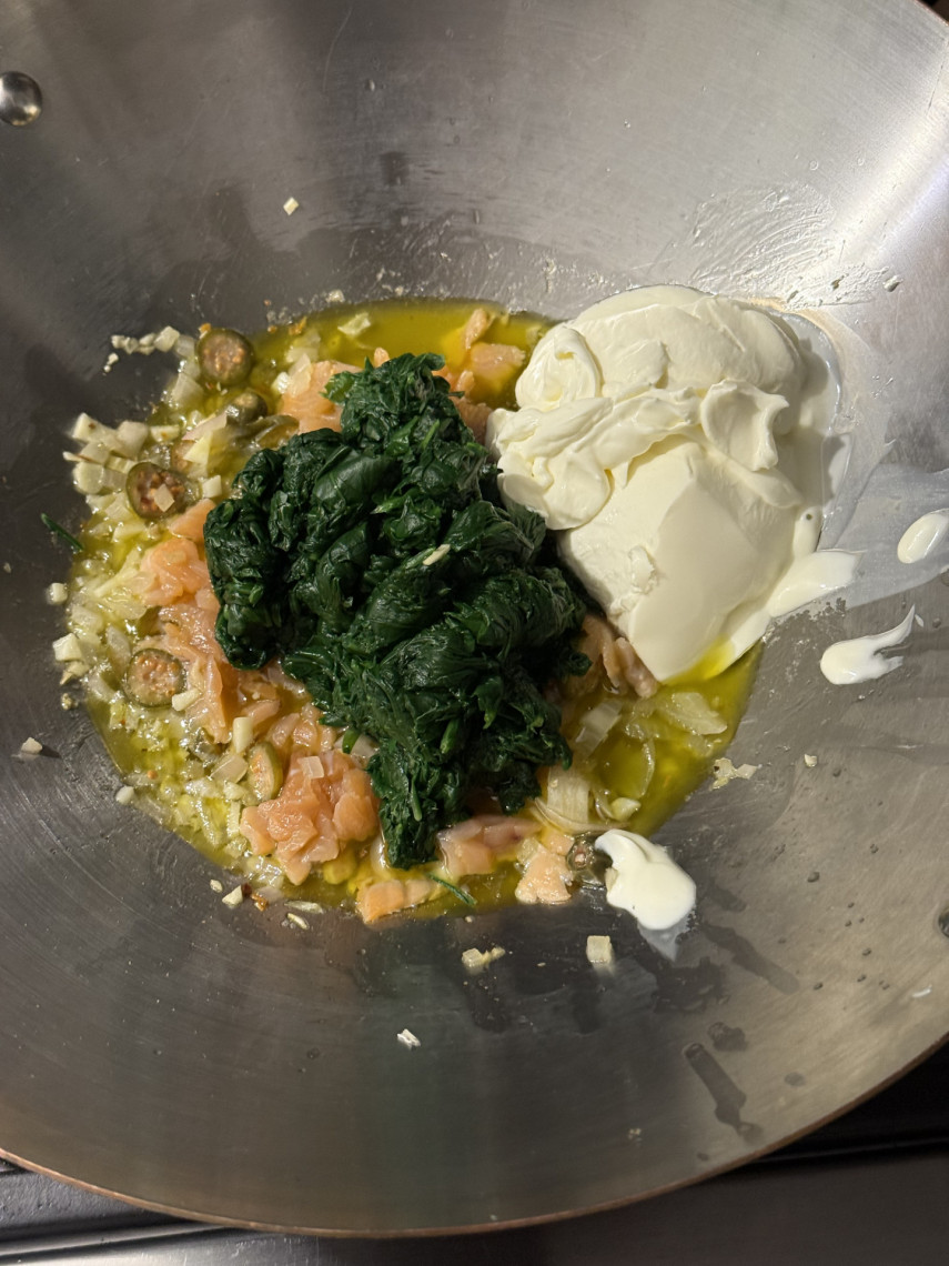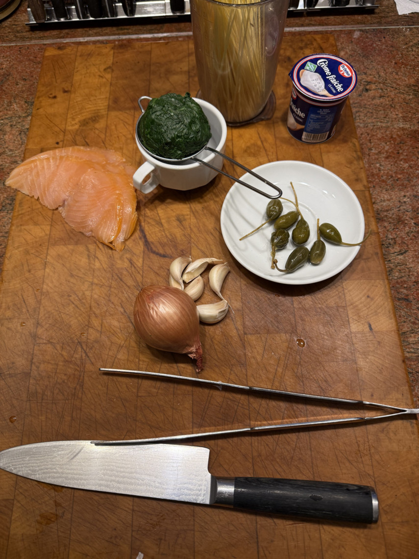 Zutaten für 2 Personen: 190 gr. Spaghetti, 120 gr. Räucherachs, 200 gr. junger Blattspinat, eine kleine geschnittene rote Zwiebel, 7 Kapernäpfel in Scheiben geschnitten, 5 klein gehackte Knoblauchzehen, Saft einer halben Zitrone, 1 TL fermentierter Pfeffer, 3 MS Macisblüte, 4-5 EL Olivenöl, 150 gr. Crème fraîche, grobes Meersalz.