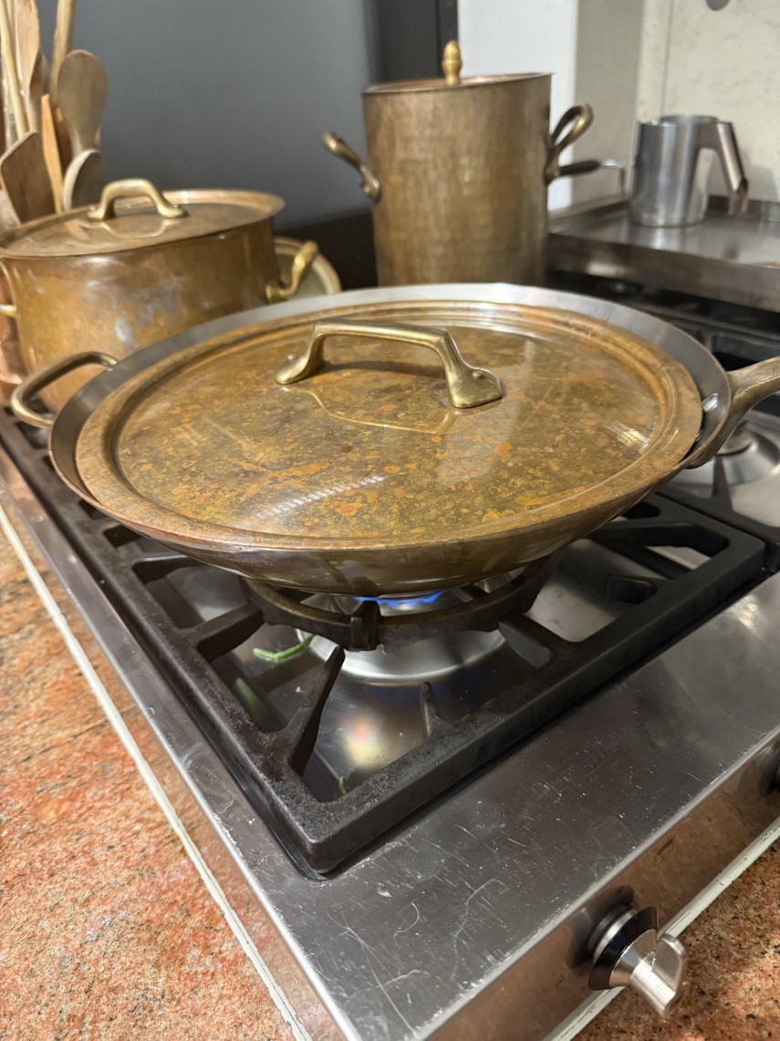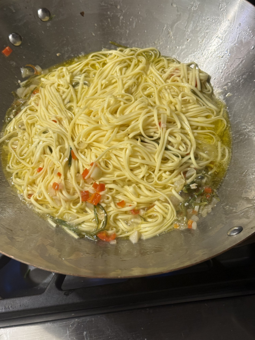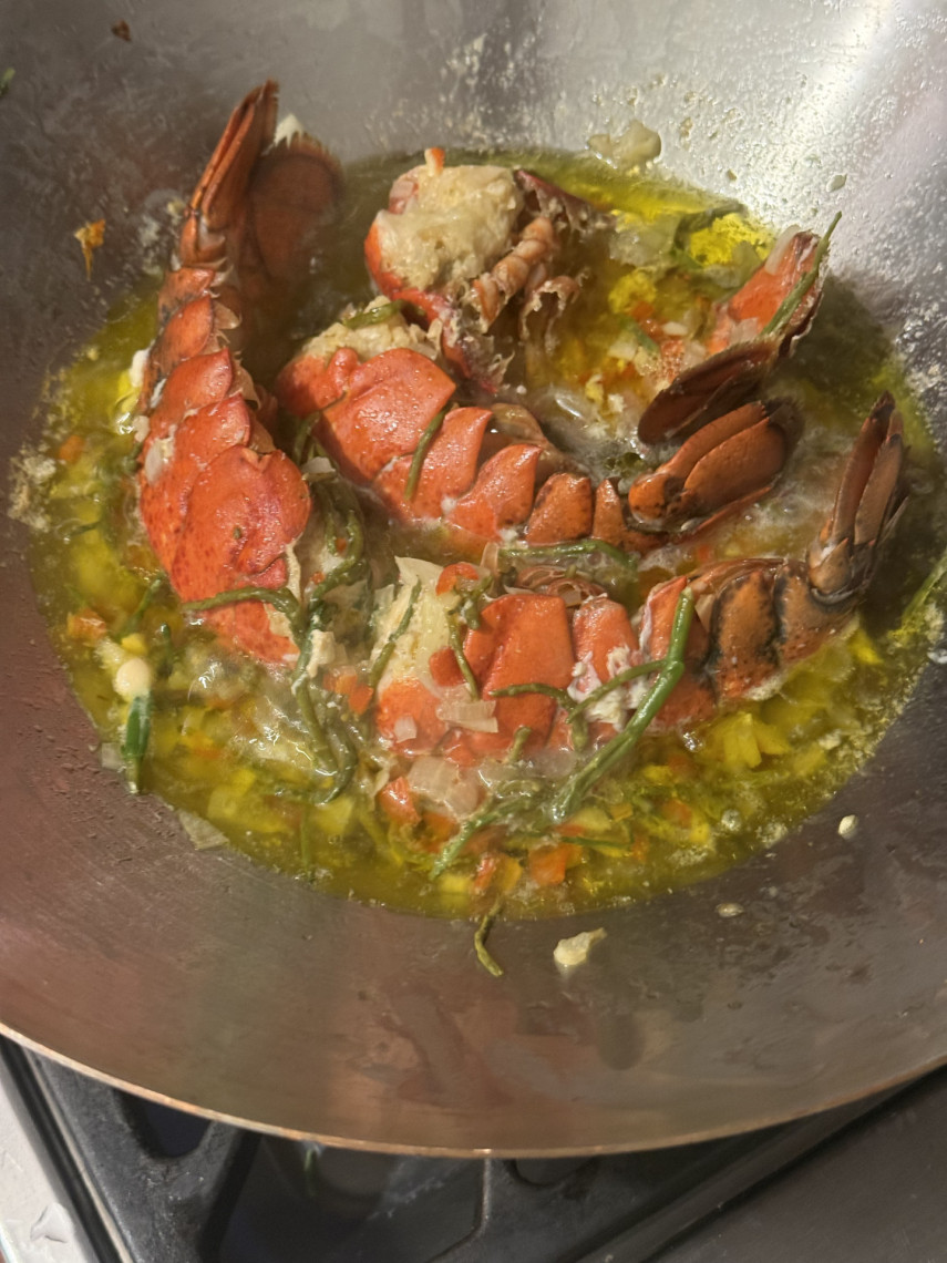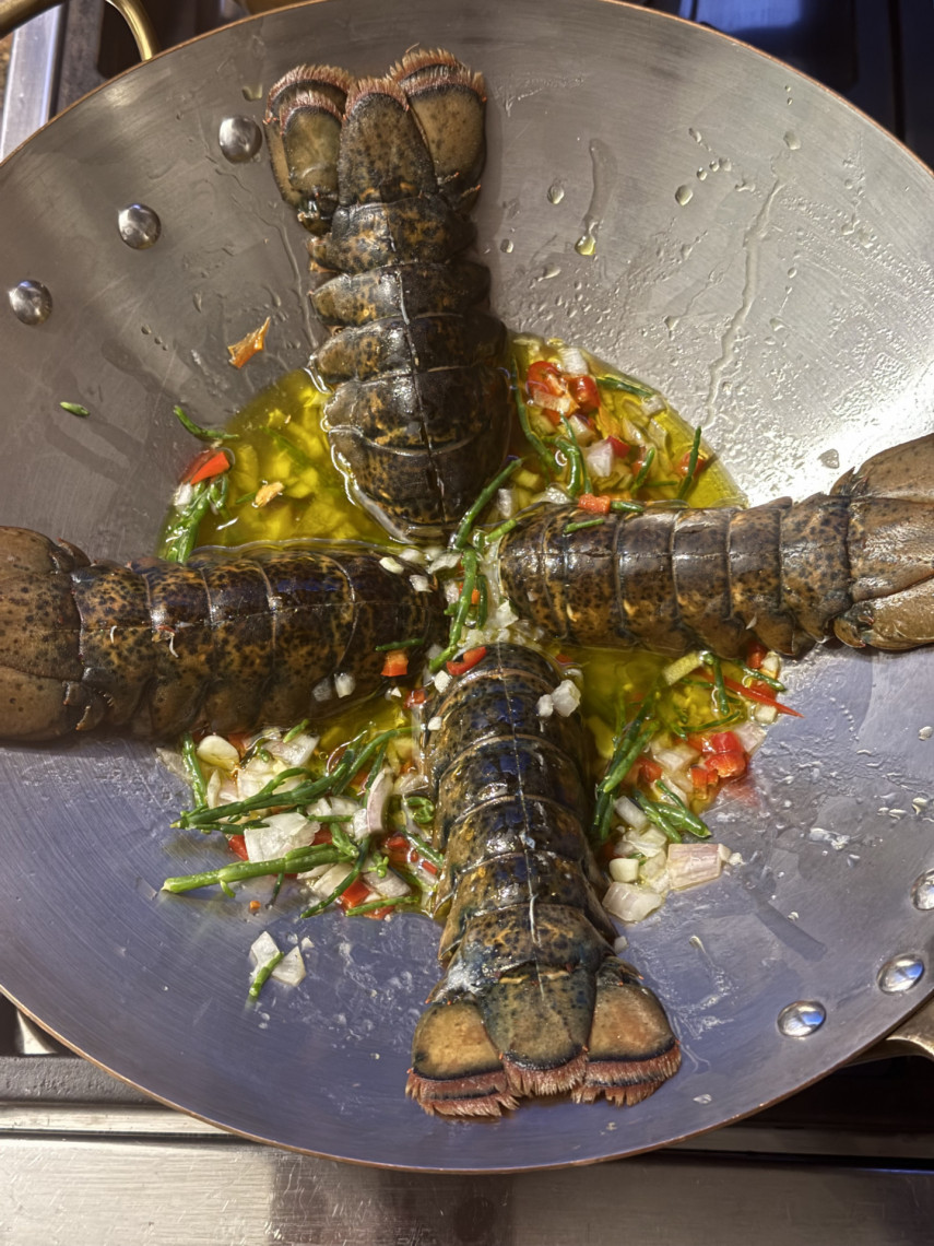 Spaghetti mit Hummerschwänzen: Man kann es in einer Pfanne oder wie hier in einem Kupfer-Wok garen, auf jeden Fall mit Deckel. Der Aufwand ist gering, die Zubereitung ist einfach, die Zubereitungszeit liegt bei 45 Minuten. Auf dem Bauch liegend garen die Hummerschwänze im Wok ohne zu wenden hervorragend.