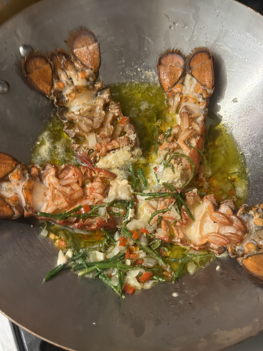 Zubereitung: Die TK-Hummerschwänze in warmem Wasser in einer Gastroschale auftauen (ca. 30 Minuten). Alle Zutaten in einen Wok oder eine Pfanne legen, die Hummerschwänze mit einer Schere auf dem Rücken längst zerschneiden und mit dem Bauch auf den Pfannenboden legen. Alles zusammen mit Deckel 30 Minuten bei kleiner Hitze garen.