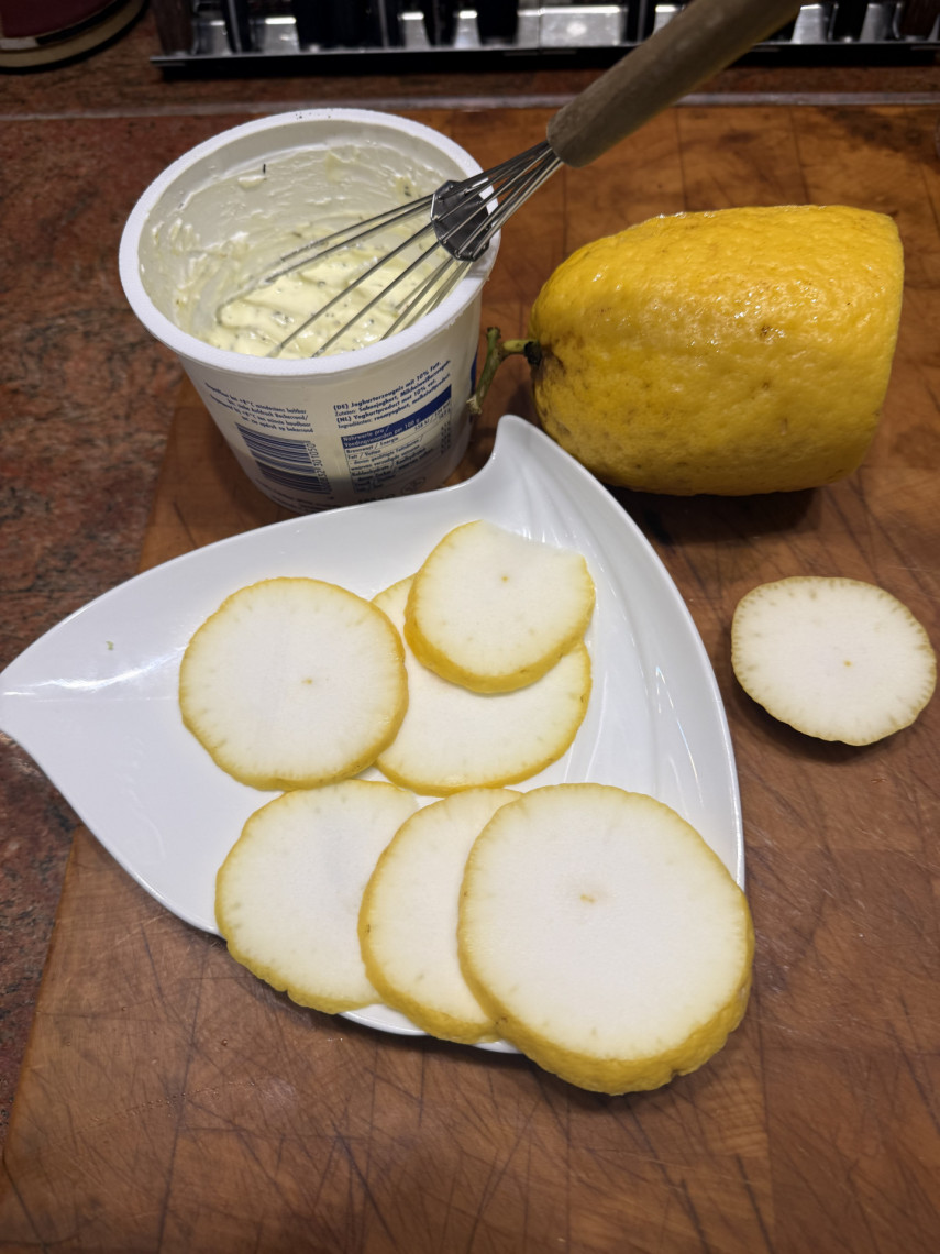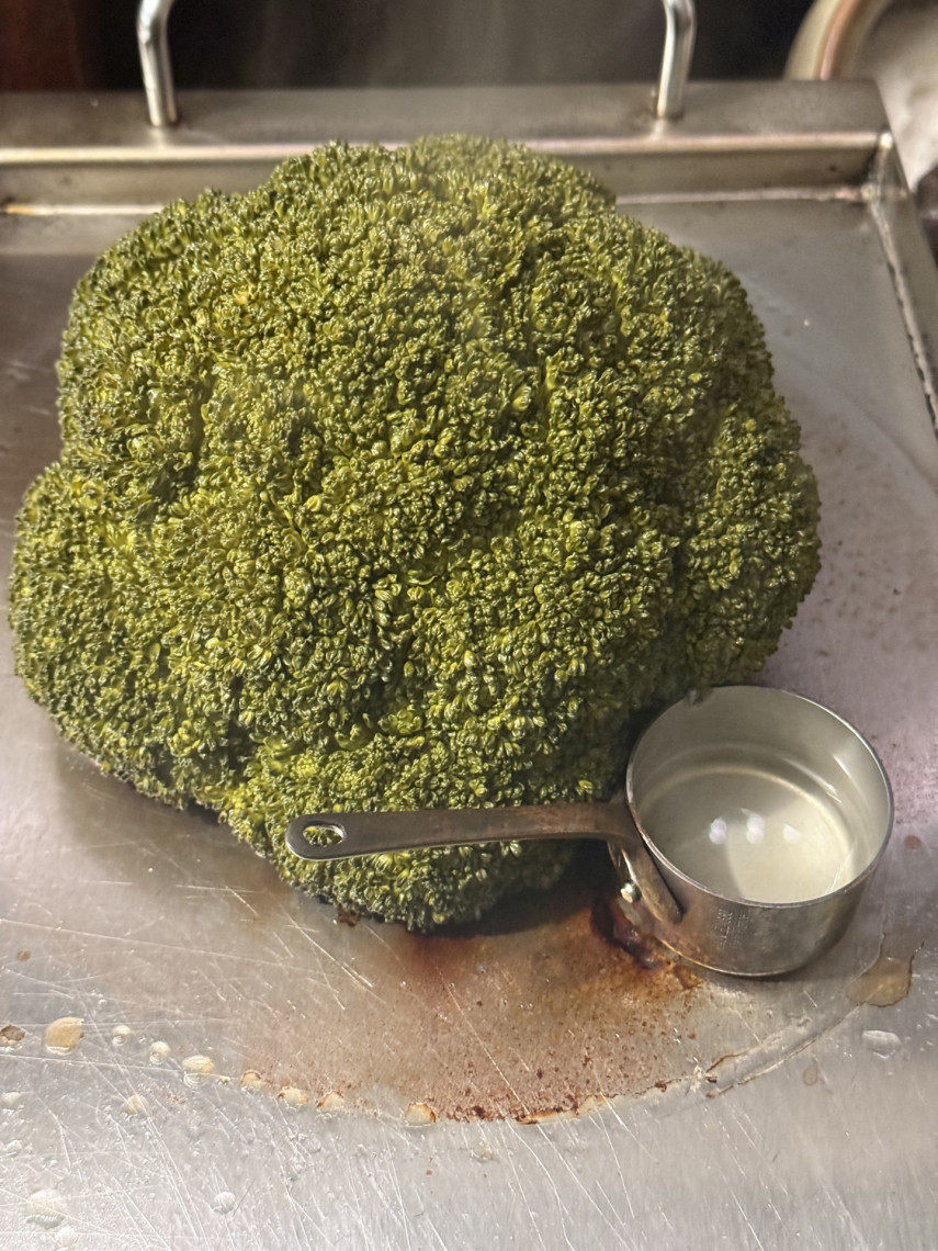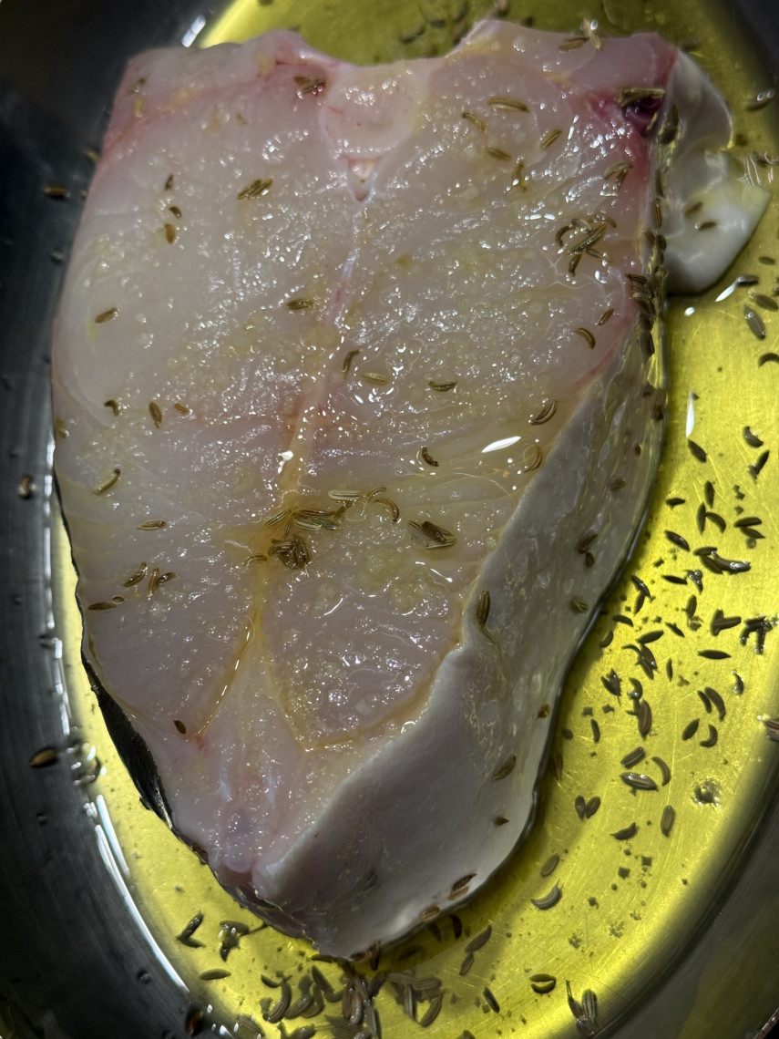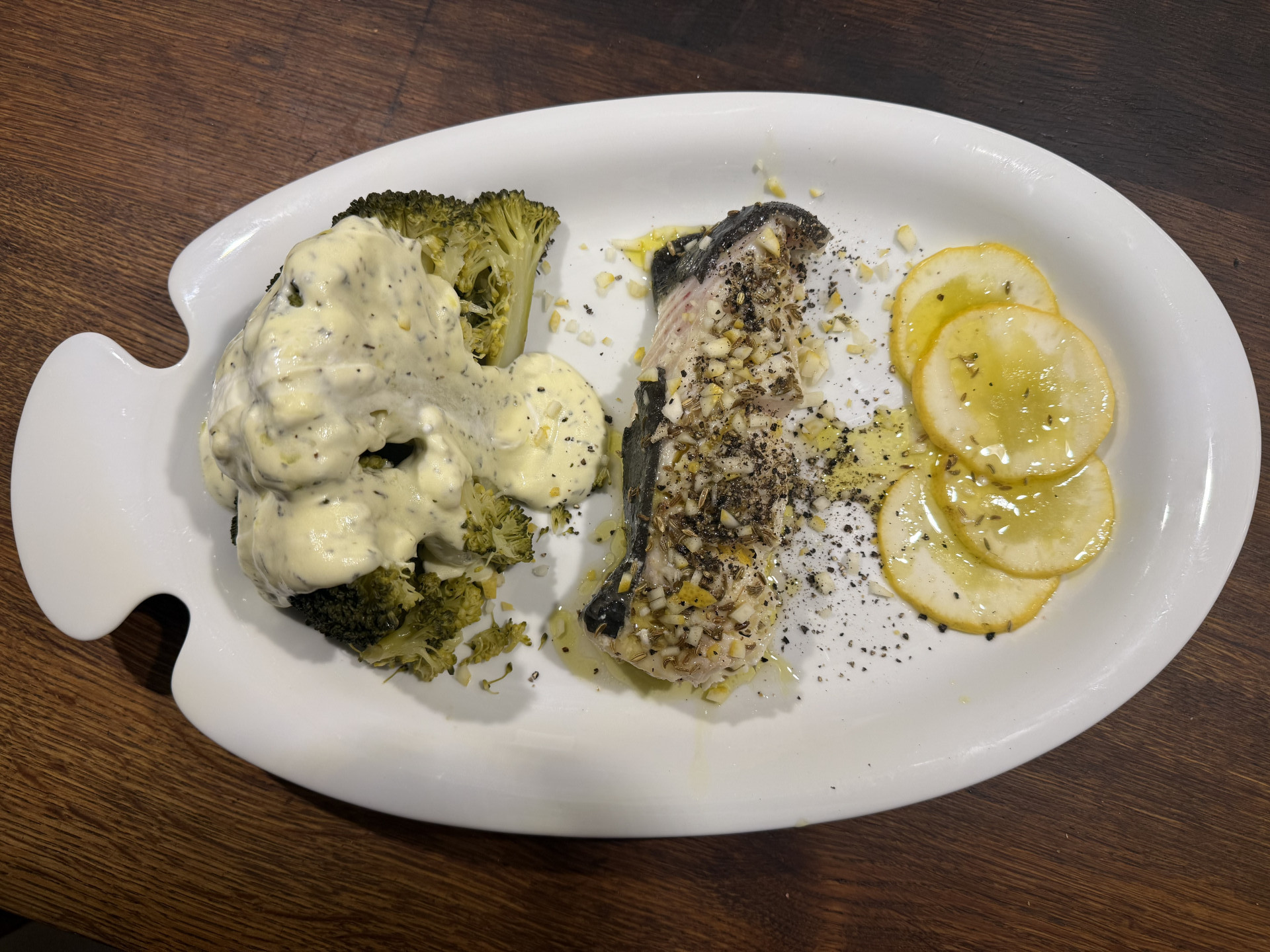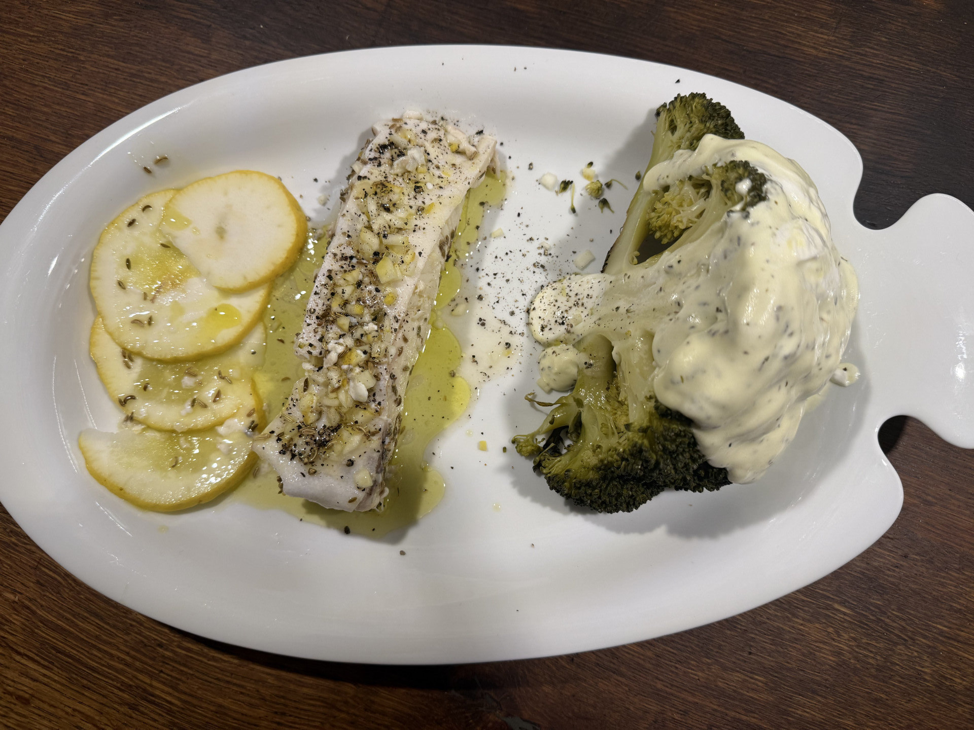 Zutaten und Zubereitung für 2 Personen: Ein Heilbutt Steak, 700 gr mit Olivenöl, Fenchelsaat und Meersalz in einer kleinen Pfanne mit Deckel garen, einmal wenden. Als Beilage Cedri-Zitrone. Einen Brokkoli auf dem Teppanyaki mit einer kleinen Wasserschale unter der Dampfglocke 45 Minuten garen; servieren mit einer Sauce aus Joghurt, Olivenöl, Meersalz, Kräuter der Provence und Zitronenensaft.