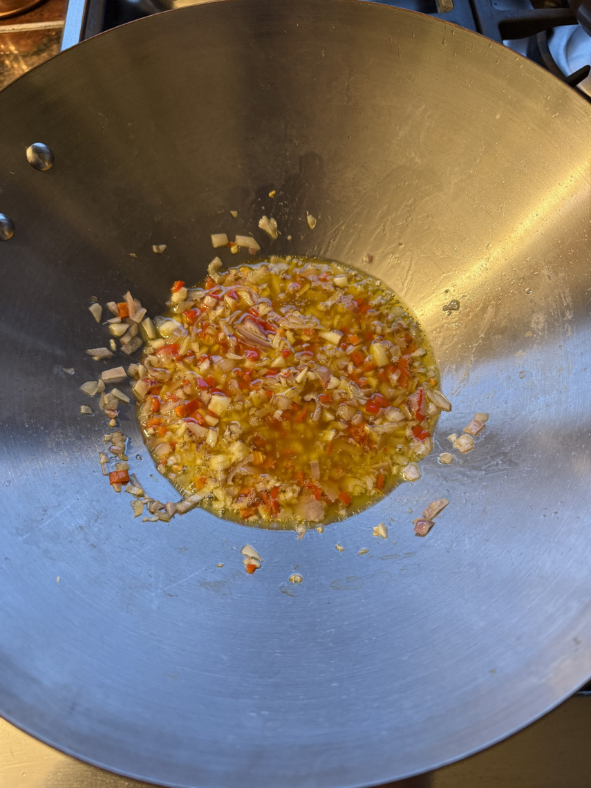 Zutaten für 2 Personen: 200 gr. Spaghetti, 50 ml Olivenöl, 2 Peperoni, eine Schalotte, 5 große kleingehackte Knoblauchzehen, 12 geviertelte Jakobsmuscheln (315 gr), 300 gr. Spinat, 1/2 TL Muskatblüte (Macis), Meersalz, Saft einer halben Zitrone, eine klein gehackte dünne Scheibe Cedri-Zitrone.