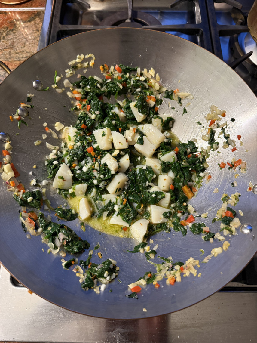 Zubereitung: Den Spinat blanchieren, abschrecken, auspressen und klein schneiden. Die Jacobsmuscheln vierteln. Klein geschnittene Schalotte, Peperoni und Knoblauch in Olivenöl in einem Wok dünsten, Jakobsmuscheln und Spinat mit der Cedri-Zitrone hinzugeben und umrühren, mit Macis und Meersalz abschmecken und mit Deckel erhitzen bis die Jakobsmuscheln gar sind. Die gekochten Spaghetti mit einer halben Kelle Nudelwasser hinzugeben und servieren.