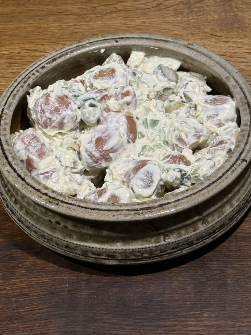 Zutaten: 1 kg rote Kartoffeln, 1/2 Bund Frühlingszwiebeln, 6-8 eingelegte Gewürzgürkchen, 125 gr. griechischer Joghurt, 60 ml Olivenöl, 1 EL weißer Balsamico, 1 TL Dijonsenf, grobes Meersalz.