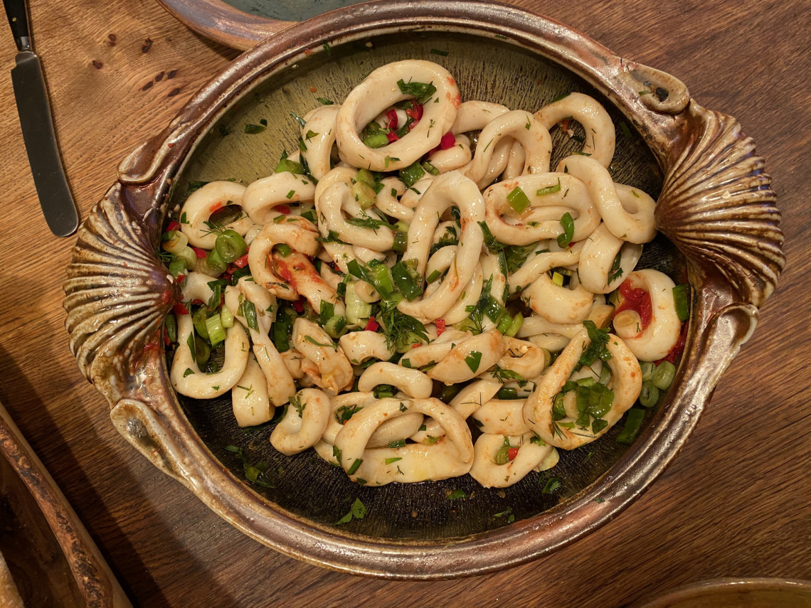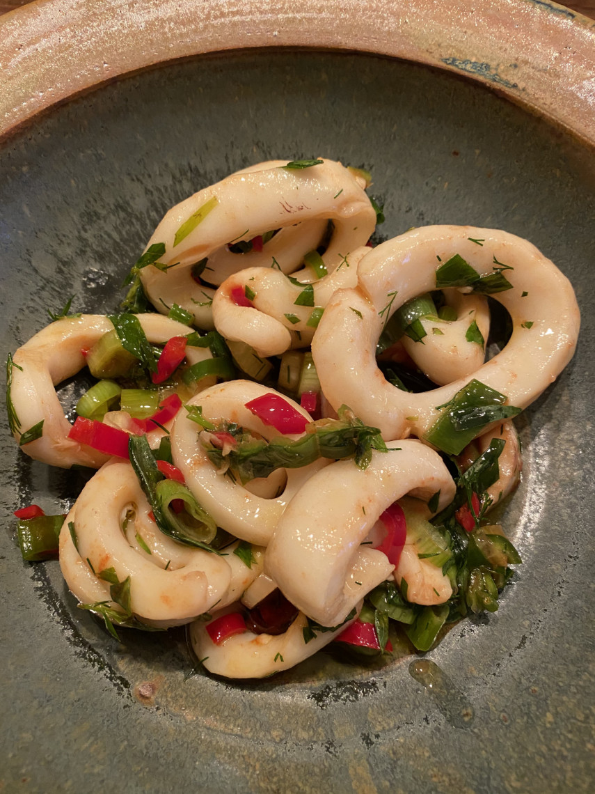 Zutaten: TK-Tintenfischring, Frühlingszwiebeln, Dill, Peperoni, Meersalz, Olivenöl, Aceto balsamico.