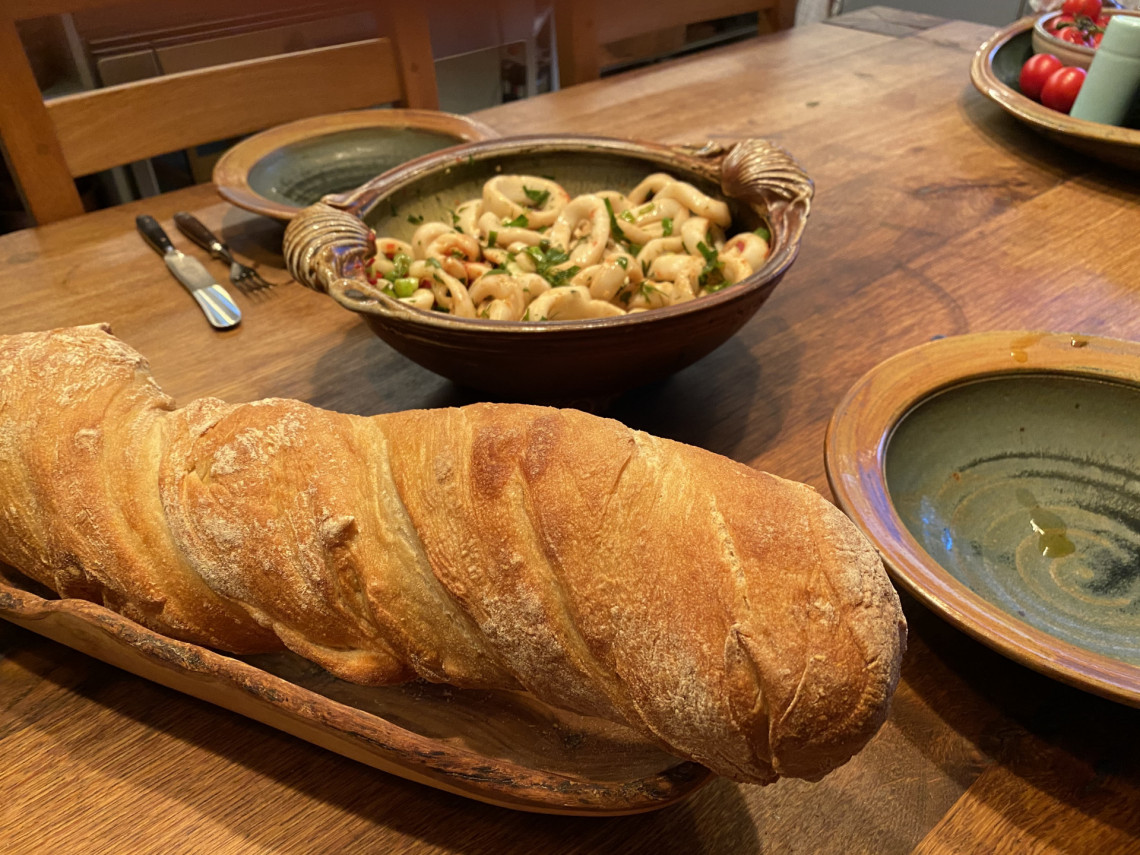 Zubereitung: Tintenfischringe in ohne Salz 20 Minuten kochen, dann abschrecken und trockentupfen. Dressing mit Olivenöl, Aceto Balsamico, Meersalz, Frühlingszwiebeln und Peperoni mit den Tintenfischringen vermengen und servieren mit Baguette.