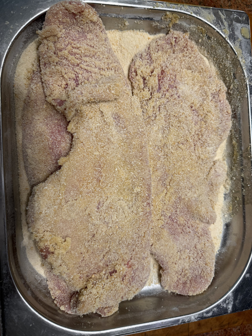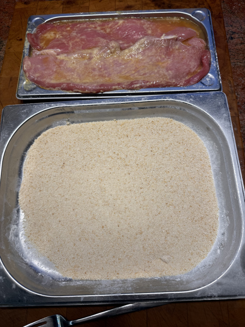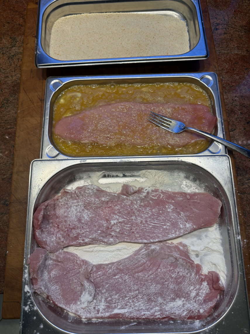Zubereitung: 3 Schalen mit Paniermehl, Mehl, 3 geschlagenen Eiern und einer passenden Pfanne mit 200 ml Olivenöl. Als Beilage gedämpfter Blumenkohl mit Joghurt-Olivenöl Sauce mit Zitrone, Meersalz und Kräuter der Provence.