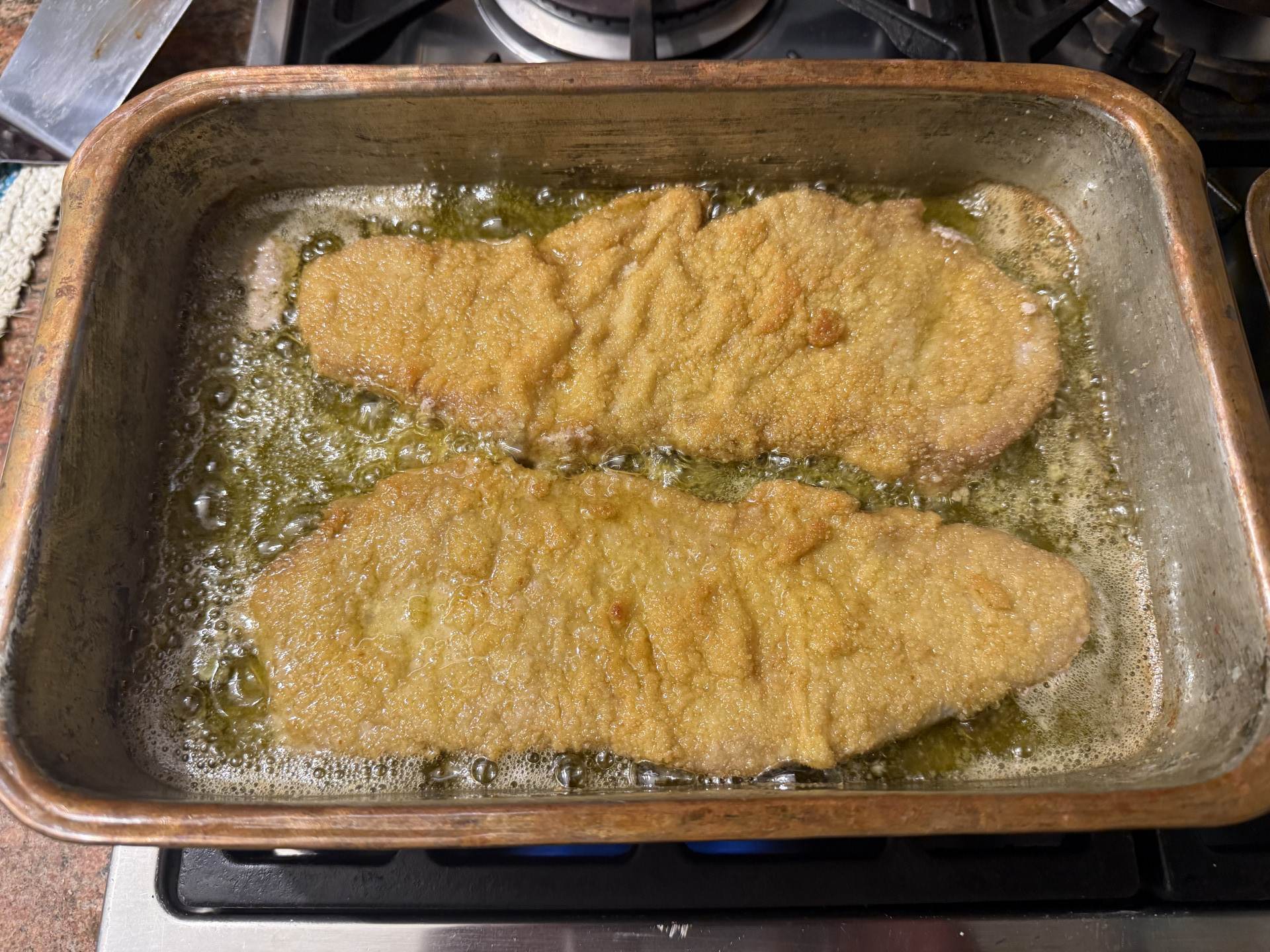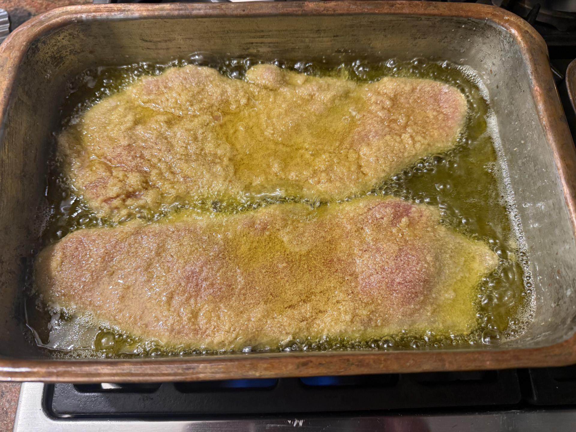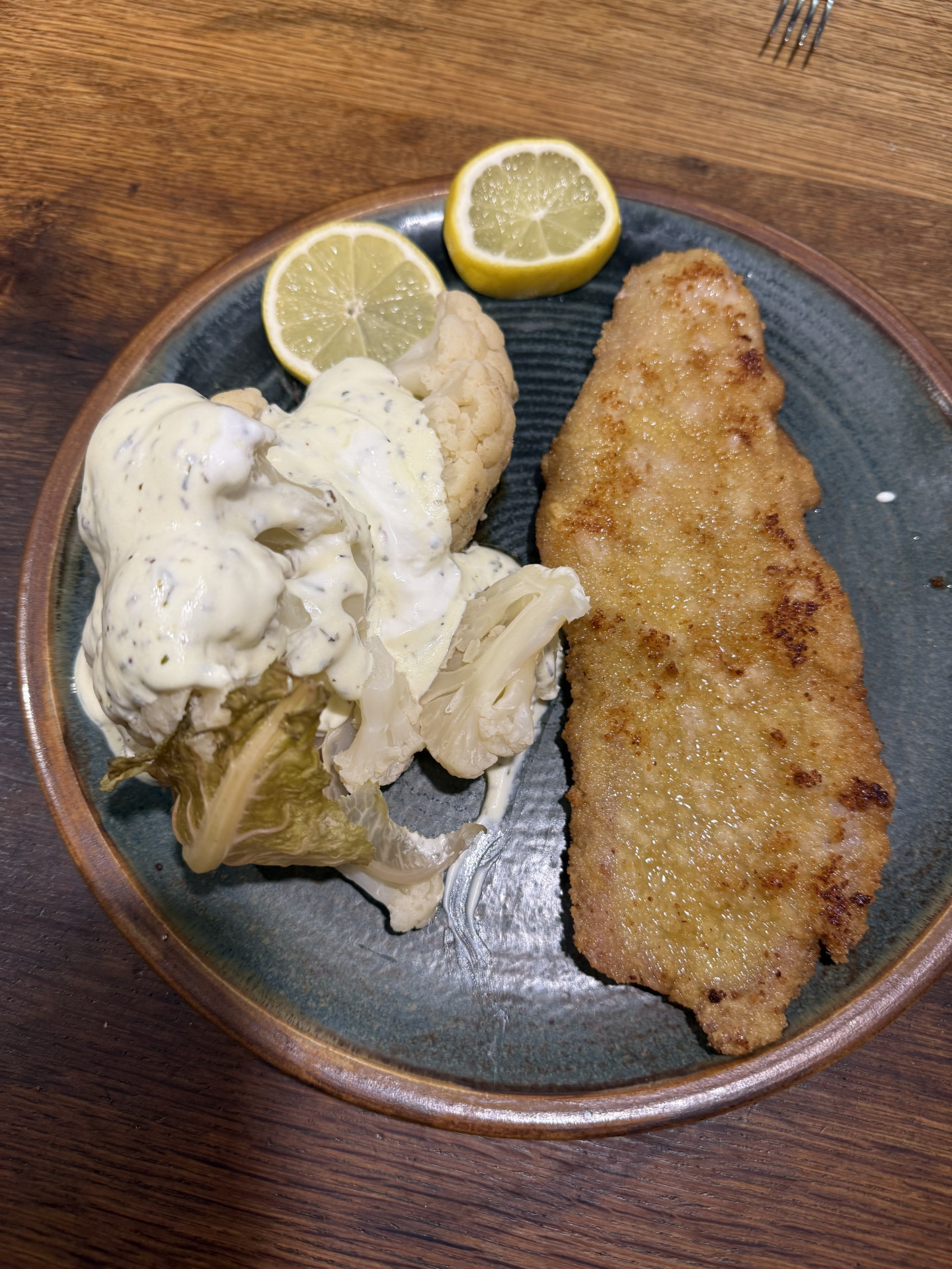 Zubereitung: 3 Schalen mit Paniermehl, Mehl, 3 geschlagenen Eiern und einer passenden Pfanne mit 200 ml Olivenöl. Als Beilage gedämpfter Blumenkohl mit Joghurt-Olivenöl Sauce mit Zitrone, Meersalz und Kräuter der Provence.