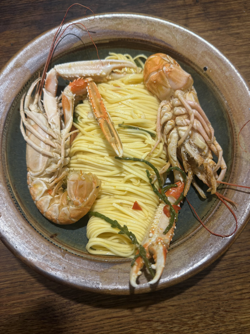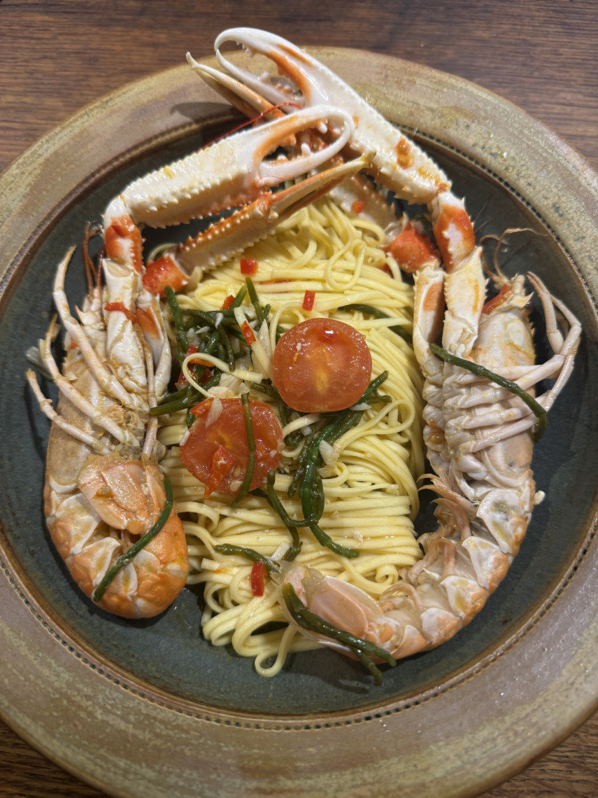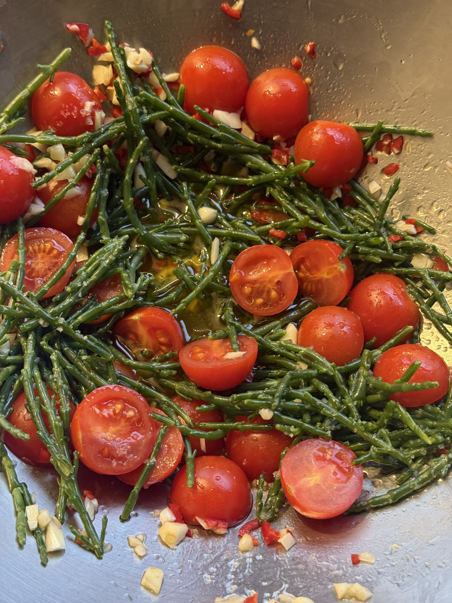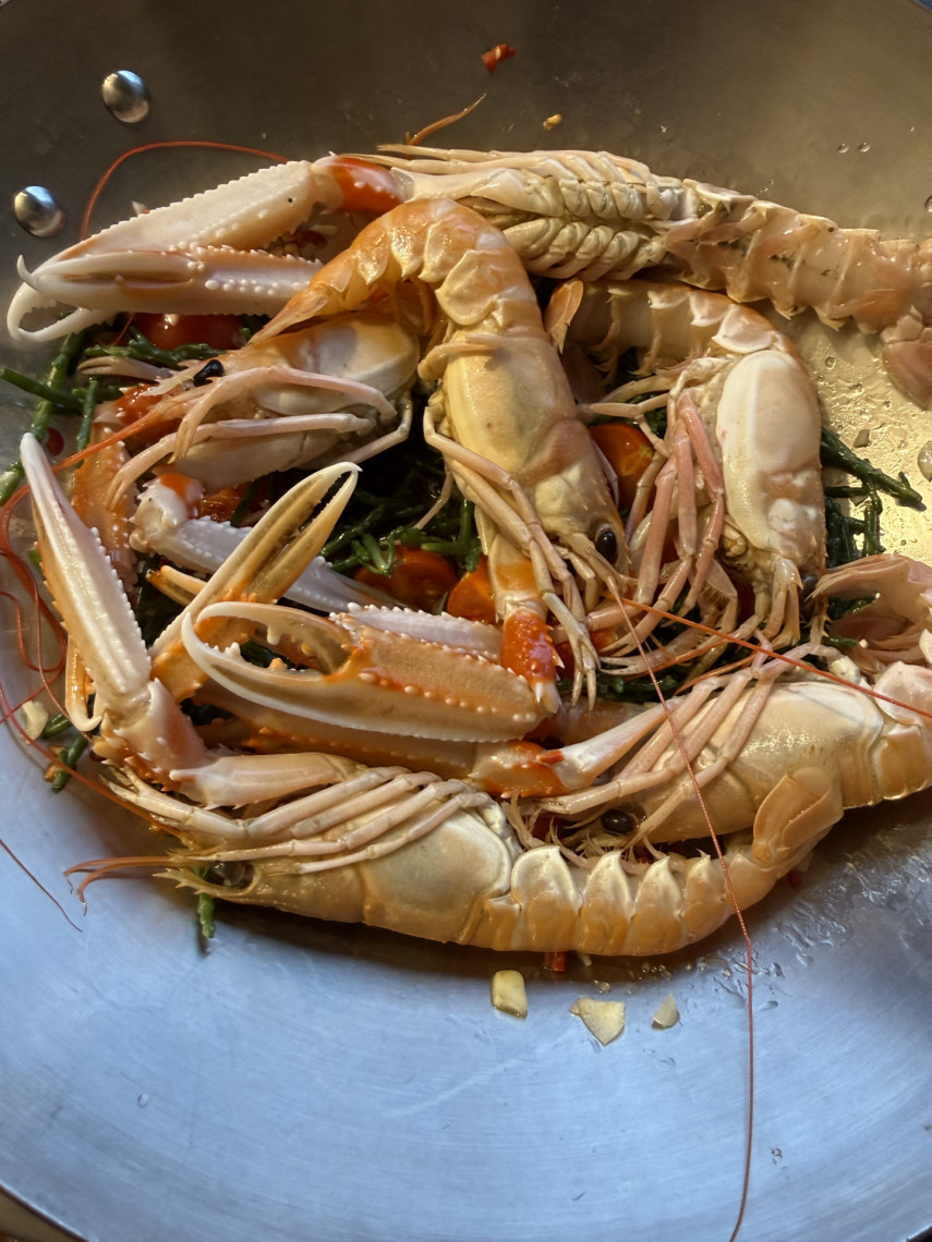 Zutaten für 2 Personen: 195 gr. Spaghetti, 6 Scampis oder Kaisergranate (575 gr.), 85 gr. klein geschnittenes Salicorne, 1 zerdrückte und klein gehackte Knoblauchknolle, 1 kleingewürfelte Peperoni, wenig grobes Meersalz, Saft einer halben Zitrone, Saft von 12 kleinen Tomaten, 70 ml Olivenöl.
