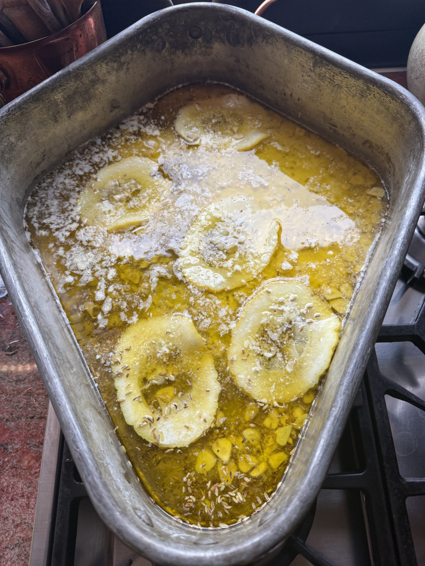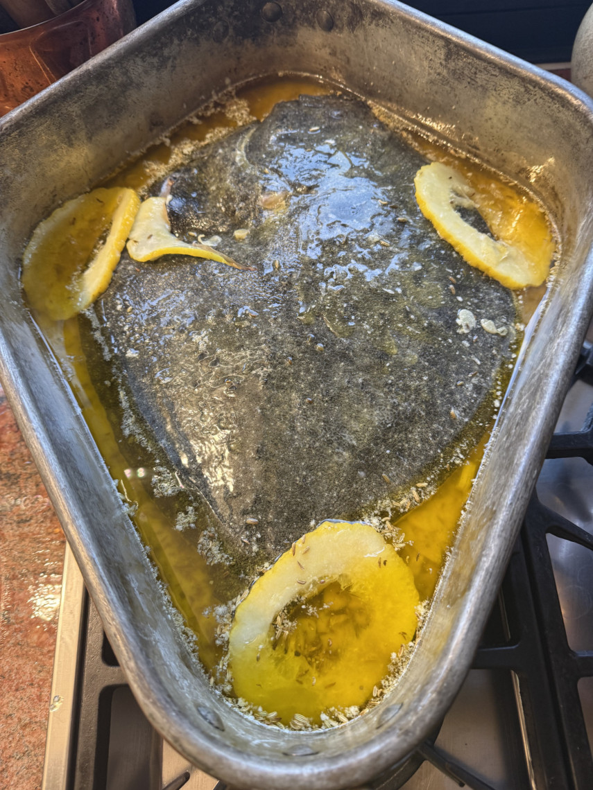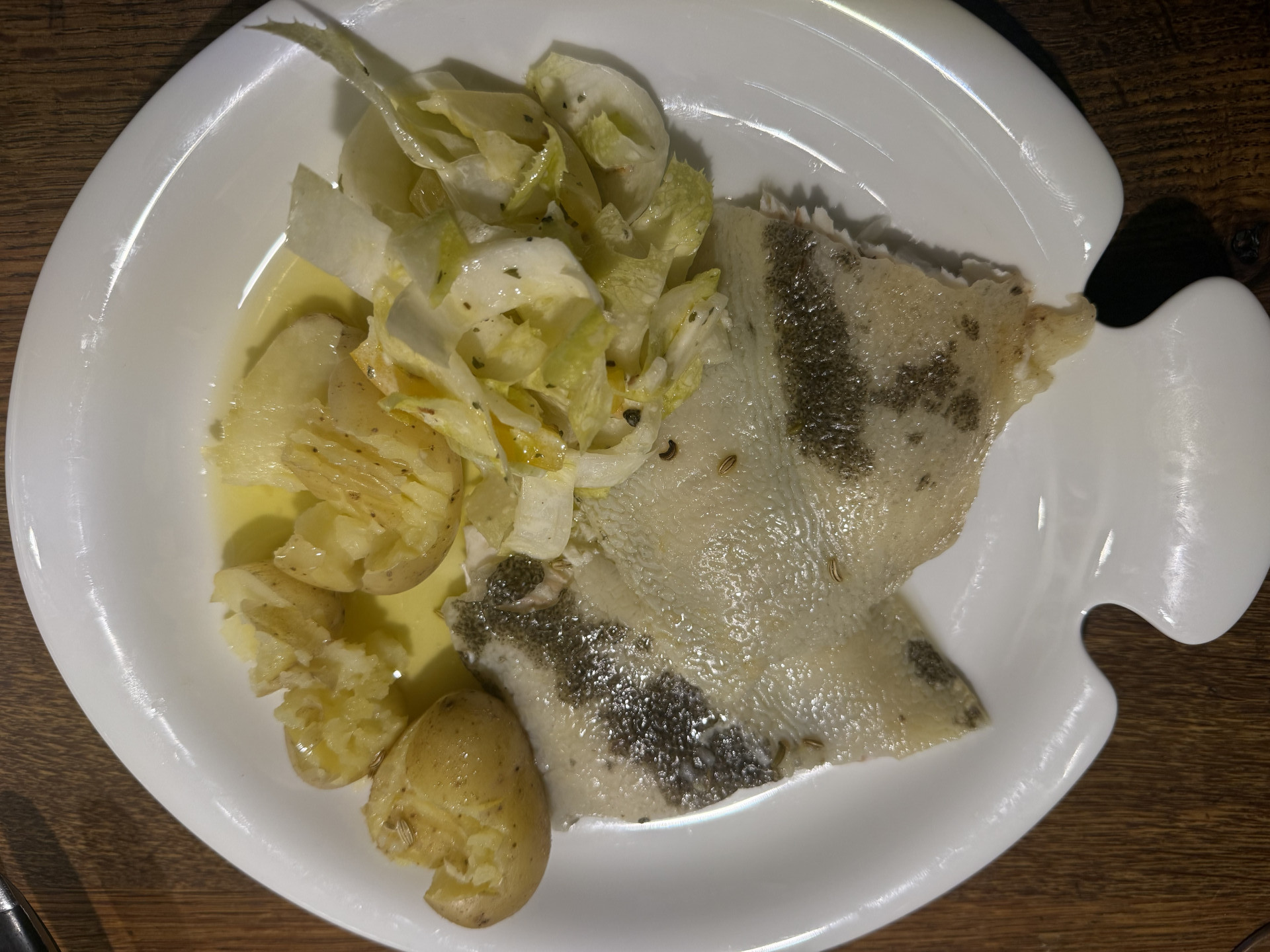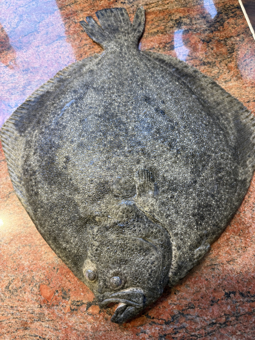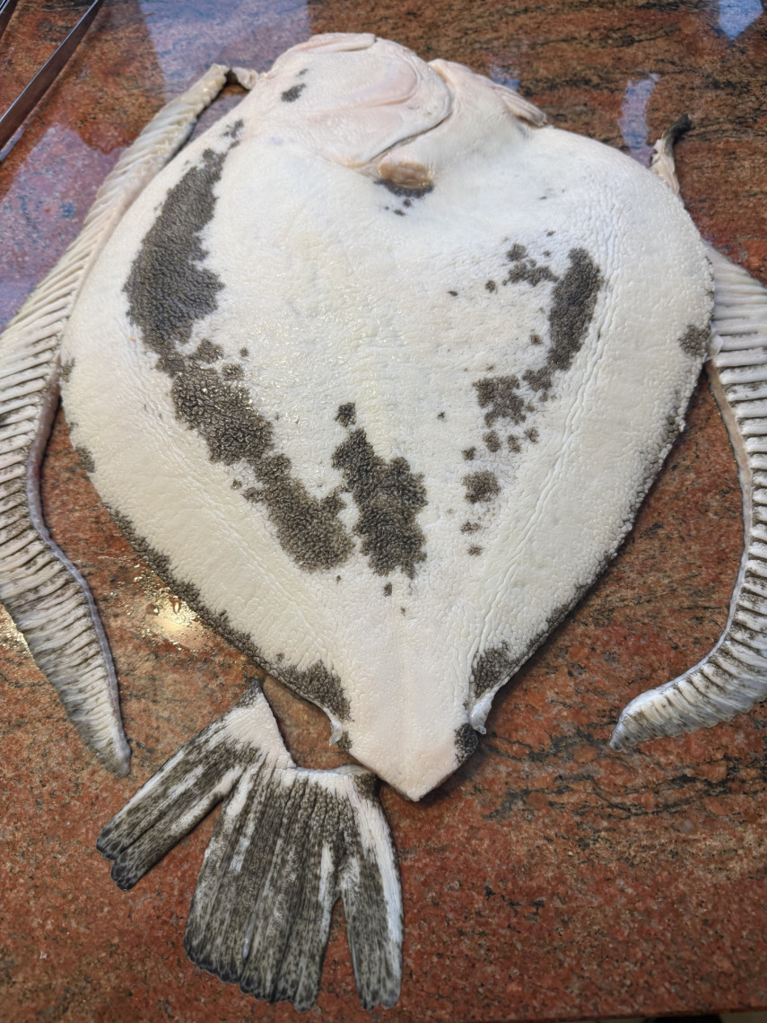Zutaten: Ein großer Steinbutt (hier 3,4 kg aus Aquakultur), 750 gr. Butter, 100 ml Olivenöl, 2 EL Meersalz, 2 Knoblauchknollen, 5 Scheiben Cedri-Zitrone, 3 rote Peperoni, Drillinge, Chicorée Salat, Aceto bianco, Kräuter der Provence .