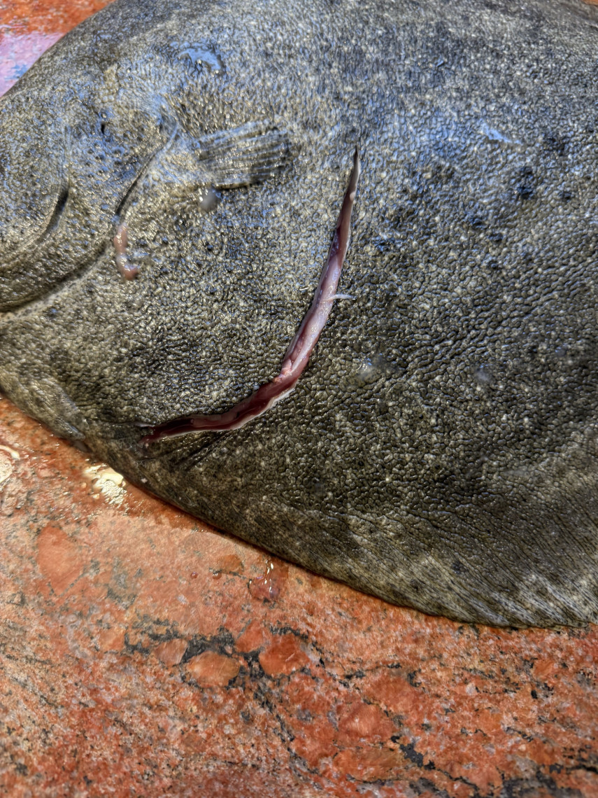 Vorbereitung: Bogenförmiger Schnitt mit einer Schere von der Oberseite zwischen Filet und Bauchraum vom Rand (Rand stehen lassen) bis in Höhe der Seitenflosse. Alternativ mit einem spitzen scharfen Messer den Butt durchstechen und bogenförmig in gleicher Form einschneiden. Innereien mit der Hand entnehmen und mit einer Schere kopfseitig abschneiden. Flossensaum und Schwanz mit einer Schere abschneiden. Butt gründlich waschen und trockentupfen.