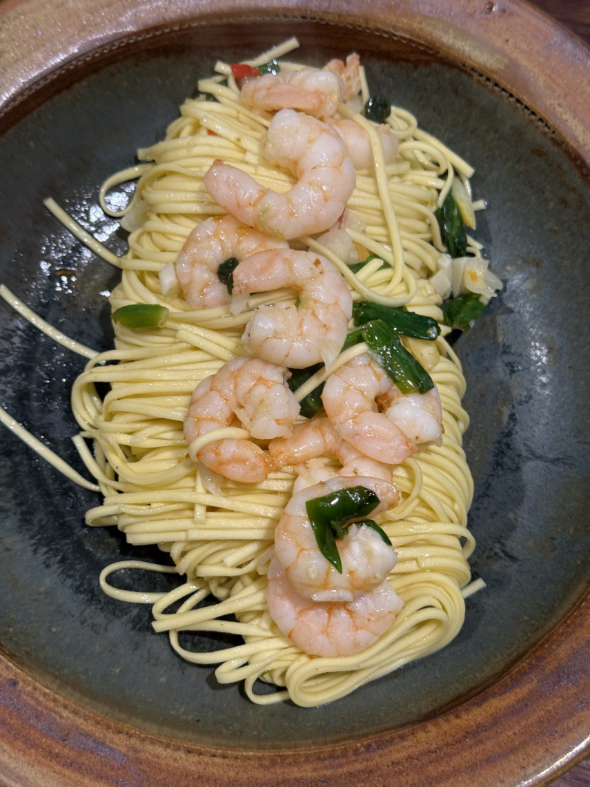 Spaghetti mit White Tiger Garnelen, Knoblauch und Baerlauch.