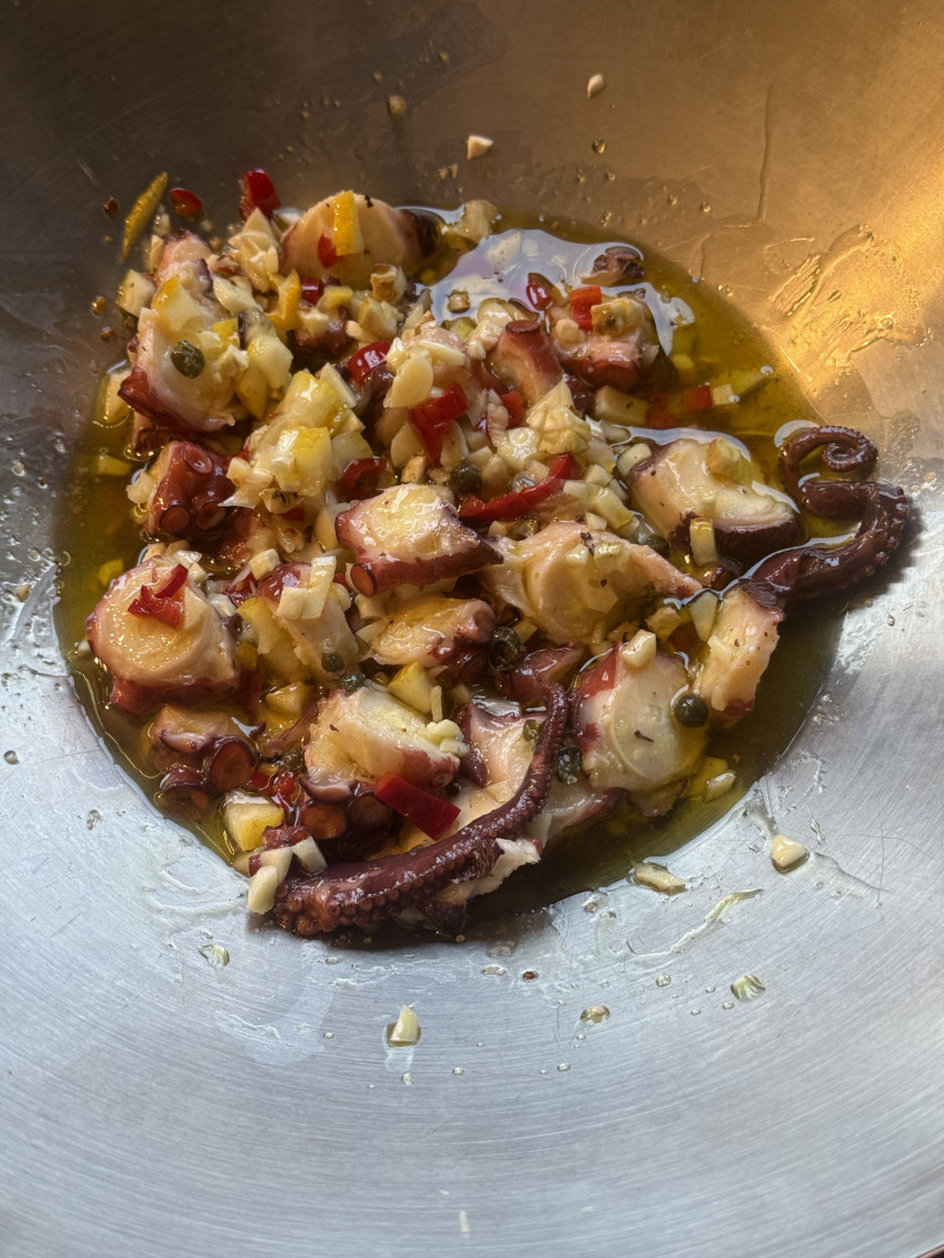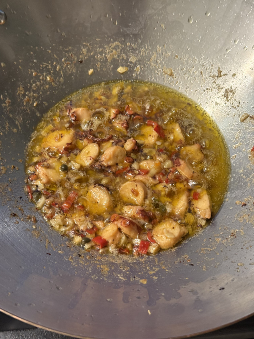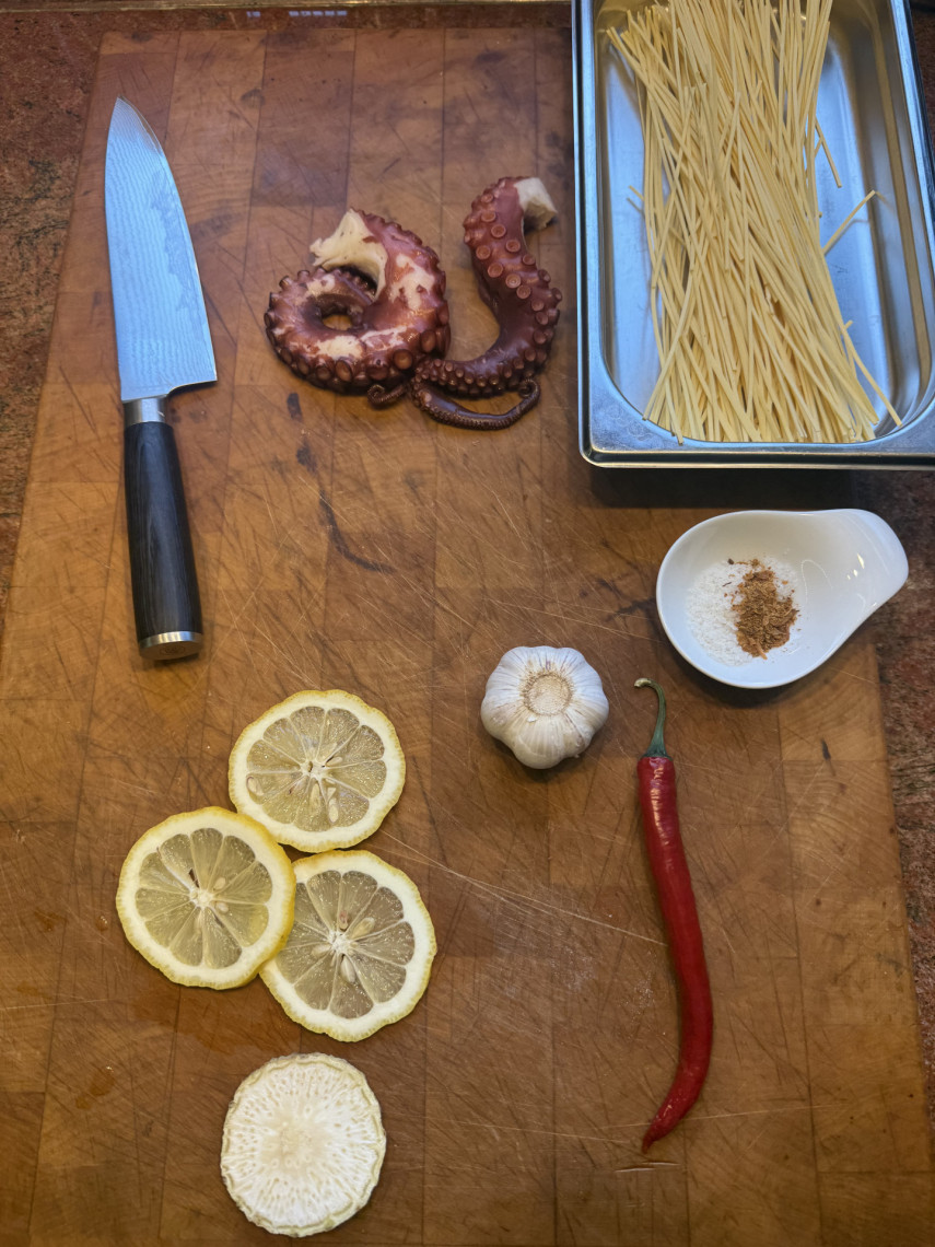 Zutaten für 1 Person: 90 gr. Spaghetti, 200 gr. Pulpoarme (TK-Ware, vorgekocht), 1 klein gehackte Knoblauchknolle, eine halbe dünne Scheibe klein gewürfelter Knollensellerie, 1 kleingewürfelte Peperoni, drei Scheiben kleine gehackte Amalfi-Zitronen, 1 EL grobes Meersalz, 40 ml Olivenöl, 1 TL Fenchelsaat, 1/2 TL Macis Blüte.