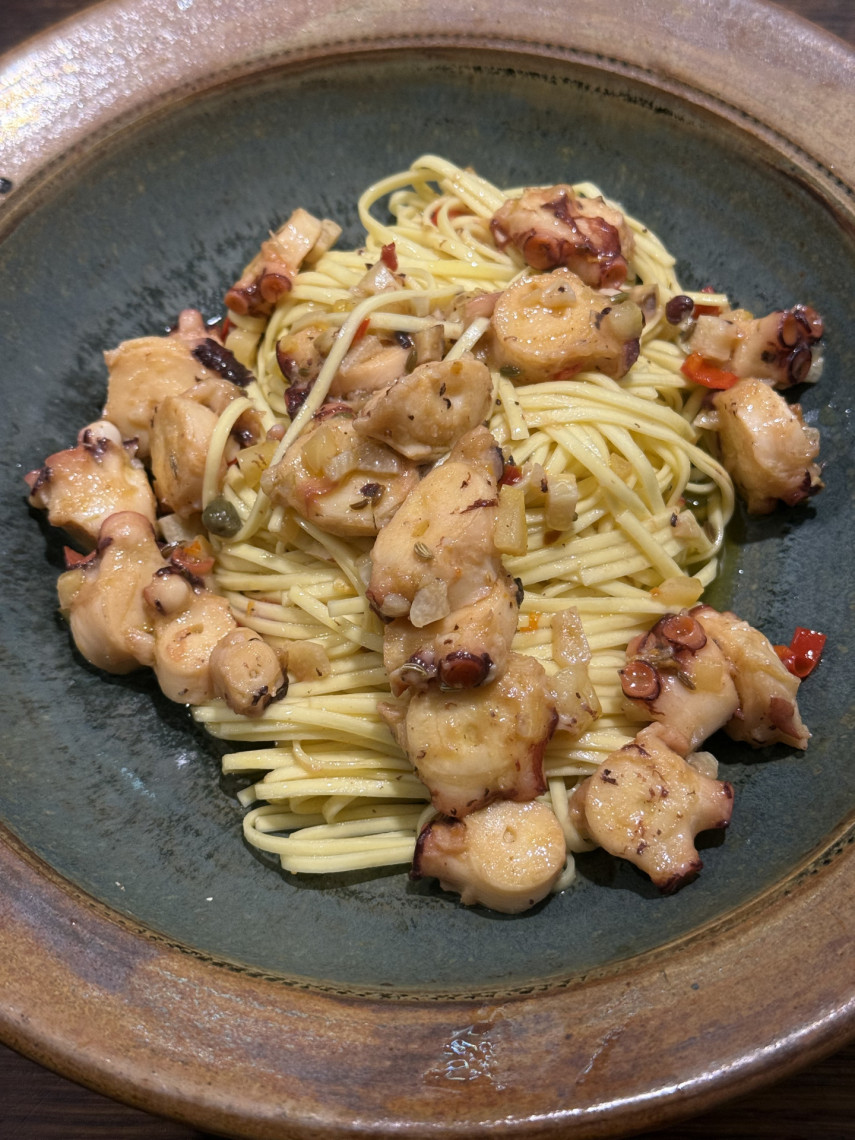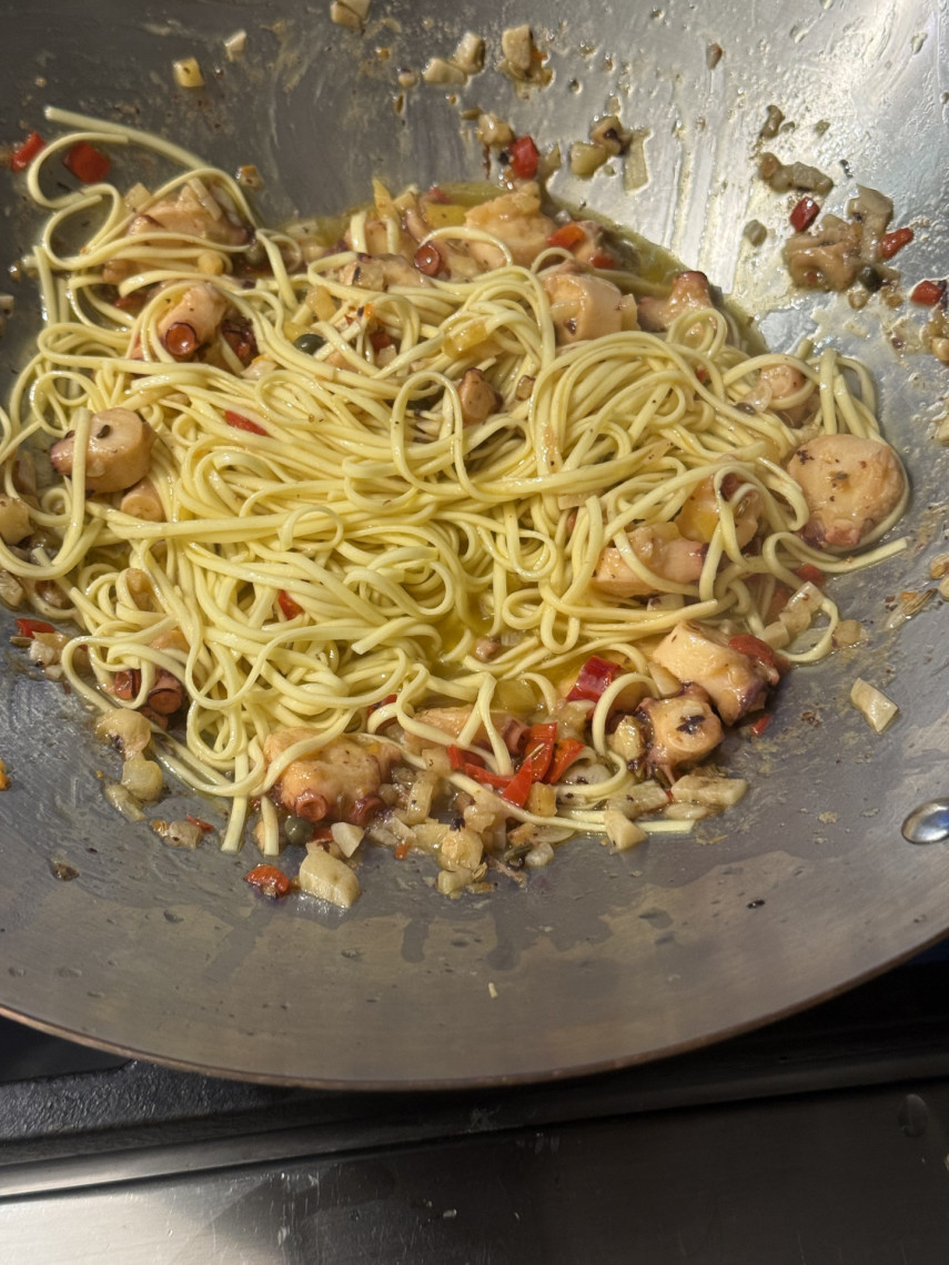 Spagetti mit Pulpo in Olivenöl und Knoblauch.