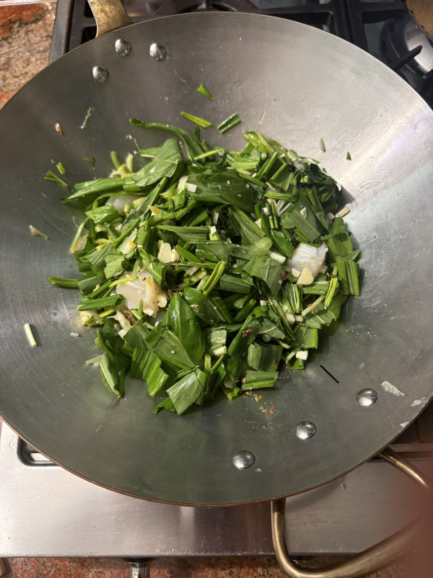 Zutaten für 2 Personen: 166 gr. Spaghetti, 200 gr. Baerlauch, 7 Jakobsmuscheln (160 gr.),1 klein gehackte Knoblauchknolle, eine Scheibe klein gewürfelter Knollensellerie, drei Scheiben klein gehackte Amalfi-Zitronen, 1 EL grobes Meersalz, 70 ml Olivenöl, 1/2 TL Macis Blüte.