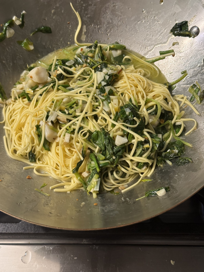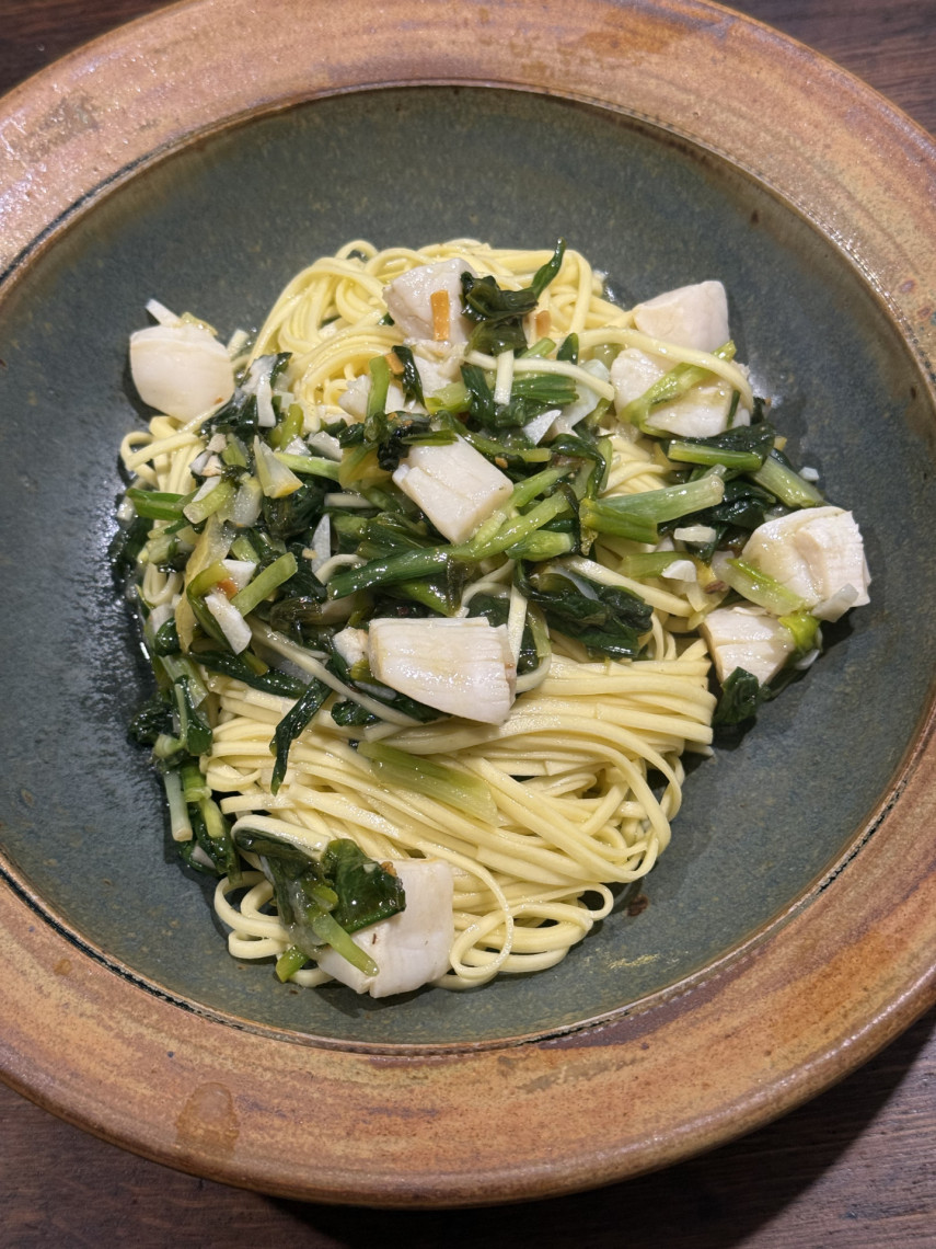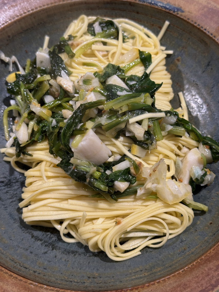 Spaghett mit Baerlauch und Jakobsmuscheln.