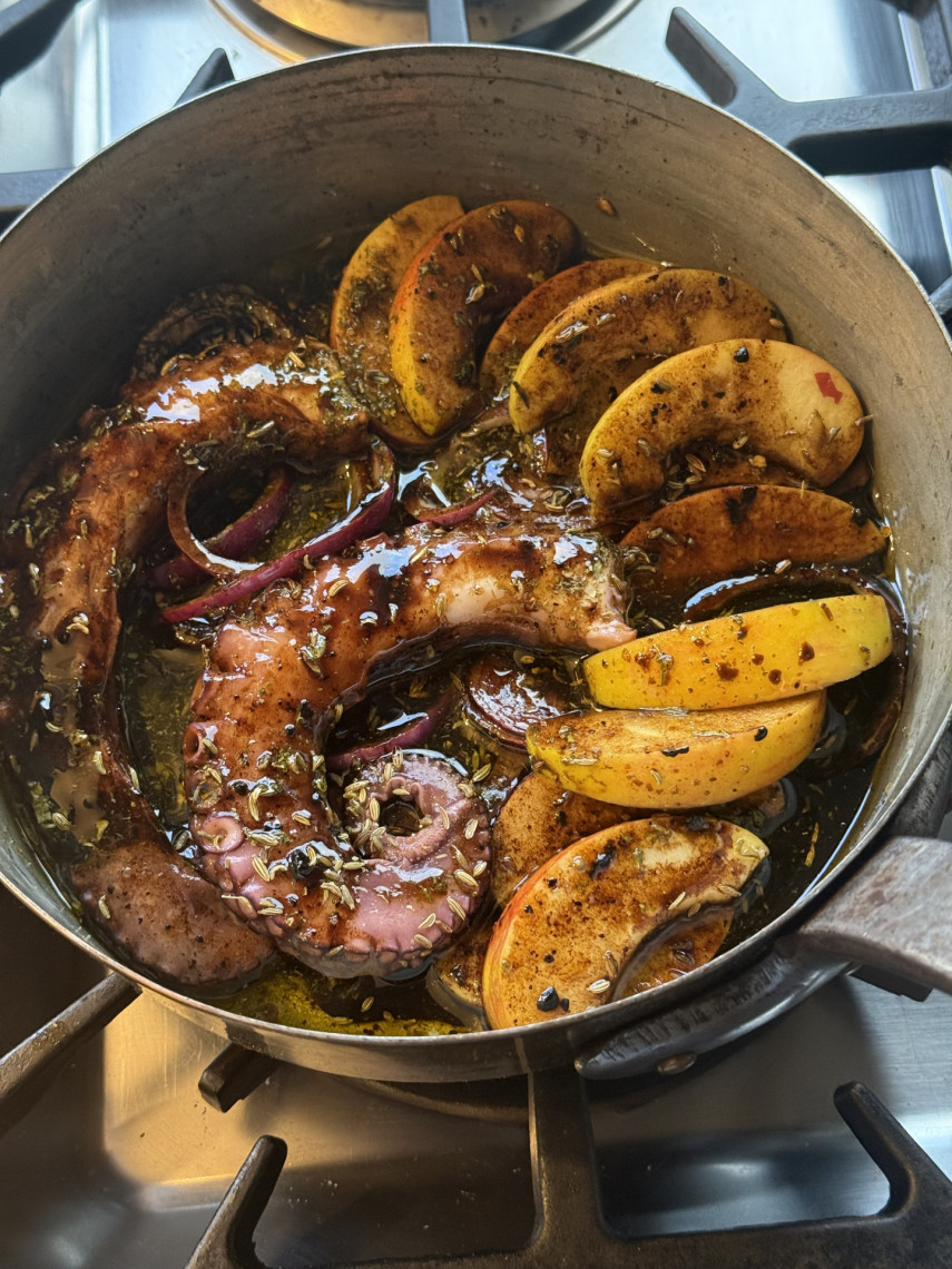 Zubereitung: Pulpo in lauwarmen Wasser auftauen und mit allen Zutaten ca. 20 bis 45 Minuten bei geschlossenem Deckel dünsten, zum Schluss den Deckel abnehmen und die Sauce reduzieren lassen. Zwiebeln, Äpfel und dunkler Aceta sollen karamelisieren. Servieren mit Salat und Brot oder Baguette.
