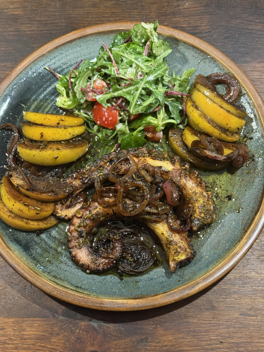 Zutaten für eine Person: 200 gr. bzw. 2 Pulpoarme, Kühlware, vorgegart, eine rote Zwiebel in Scheiben, 1 saurer Apfel mit Schale ohne Kerngehäuse in Schpalten geschnitten, 5 EL Olivenöl, 5 EL dunkler Aceto balsamico, Fenchelsaat, Kräutermischung „Café de Paris“, Meersalz, etwas Saft einer Zitrone.