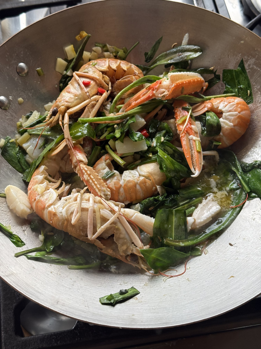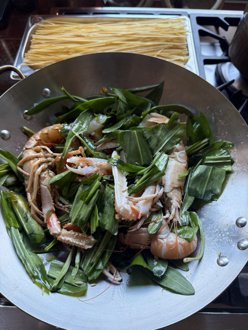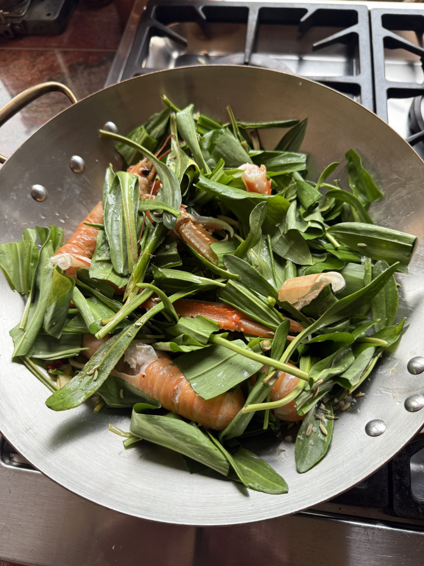 Zubereitung: Klein gehackten Knoblauch, Cedri-Zitrone, klein geschnittene Stengel vom Baerlauch und Peperoni in 70 ml Olivenöl im Wok mit Deckel 5 Minuten garen. Kaisergranate mit dem Kopf in den Sud legen und den Kopf zerdrücken, die Scheren mit einer Schere aufbrechen.