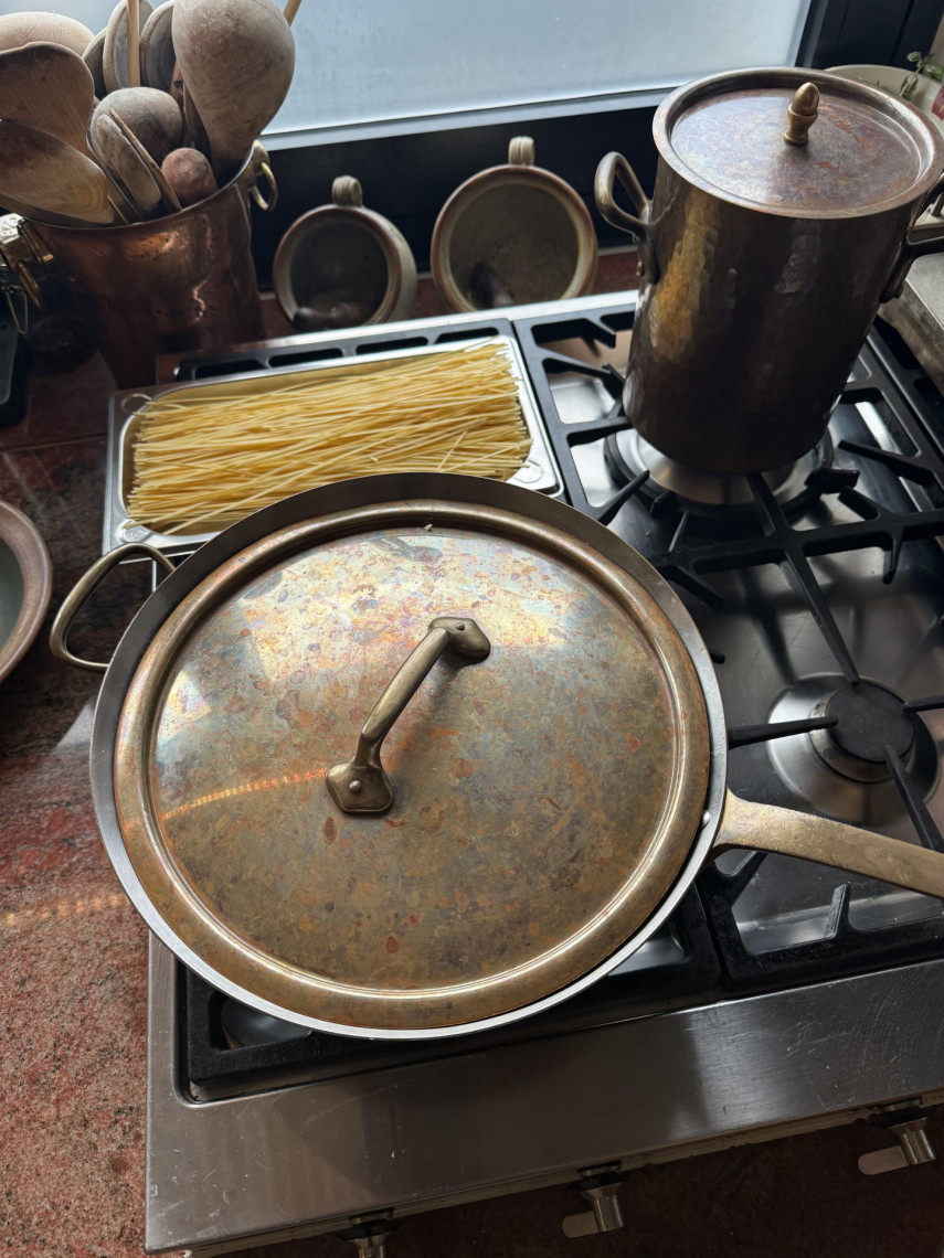 Zutaten für 2- Personen: 195 gr. Spaghetti, 4 Scampi oder Kaisergranate (495 gr.), 9 geviertelte Jakobsmuscheln (230 gr.), 55 gr. in Stücke geschnittenes Baerlauch, 60 gr. Strand-Astern (Lamsoor), 1~klein gehackte Knoblauchknolle,1 kleingewürfelte Peperoni, ein Scheibe kleine gehackte Cedri-Zitrone, 1 EL grobes Meersalz, 70 ml Olivenöl, 1/2 TL Fenchelsaat.