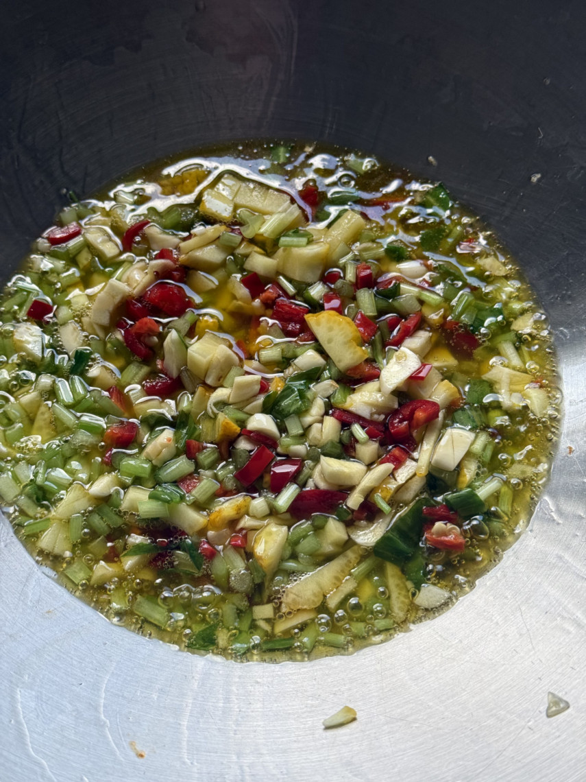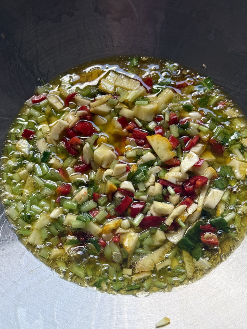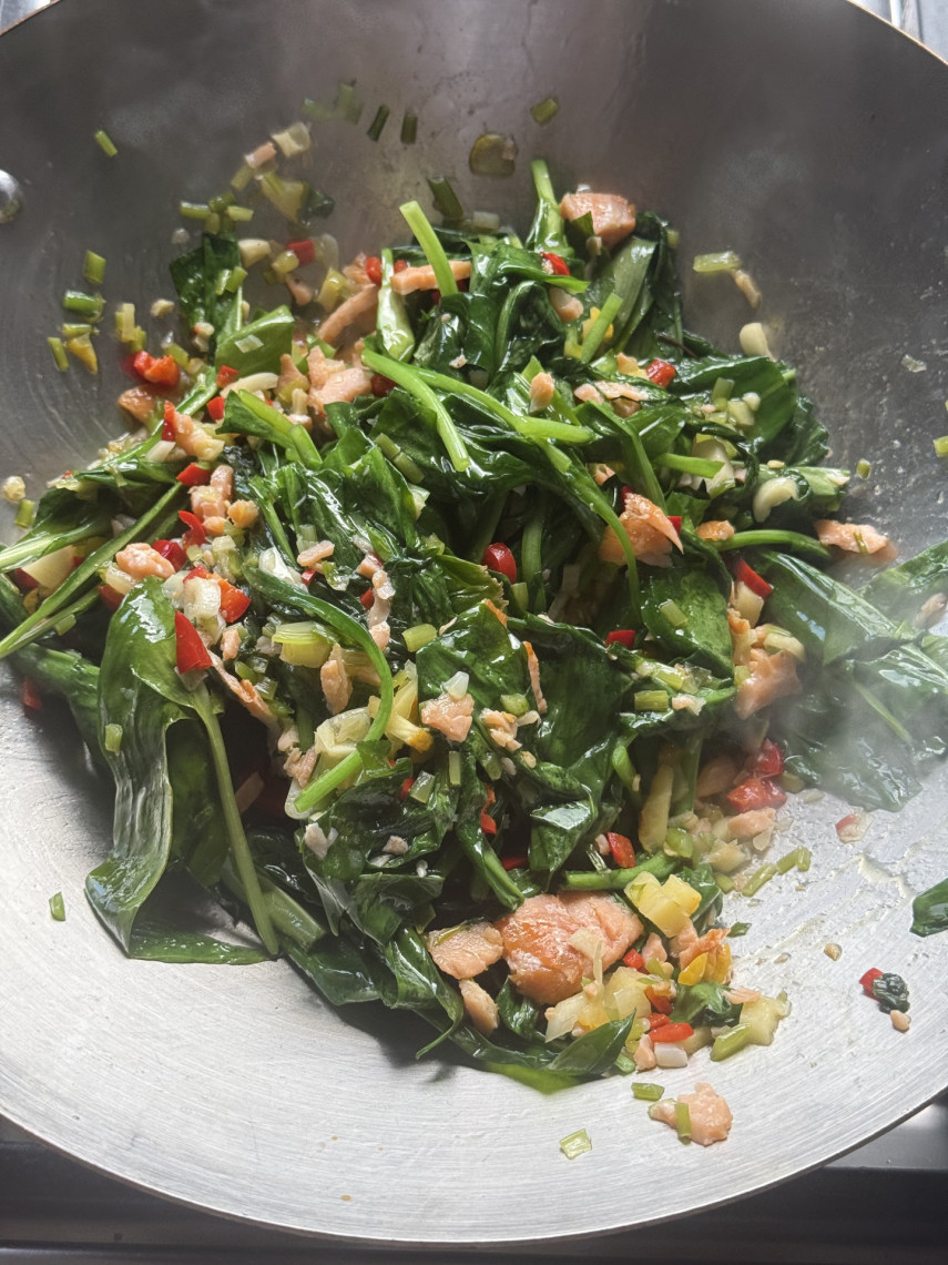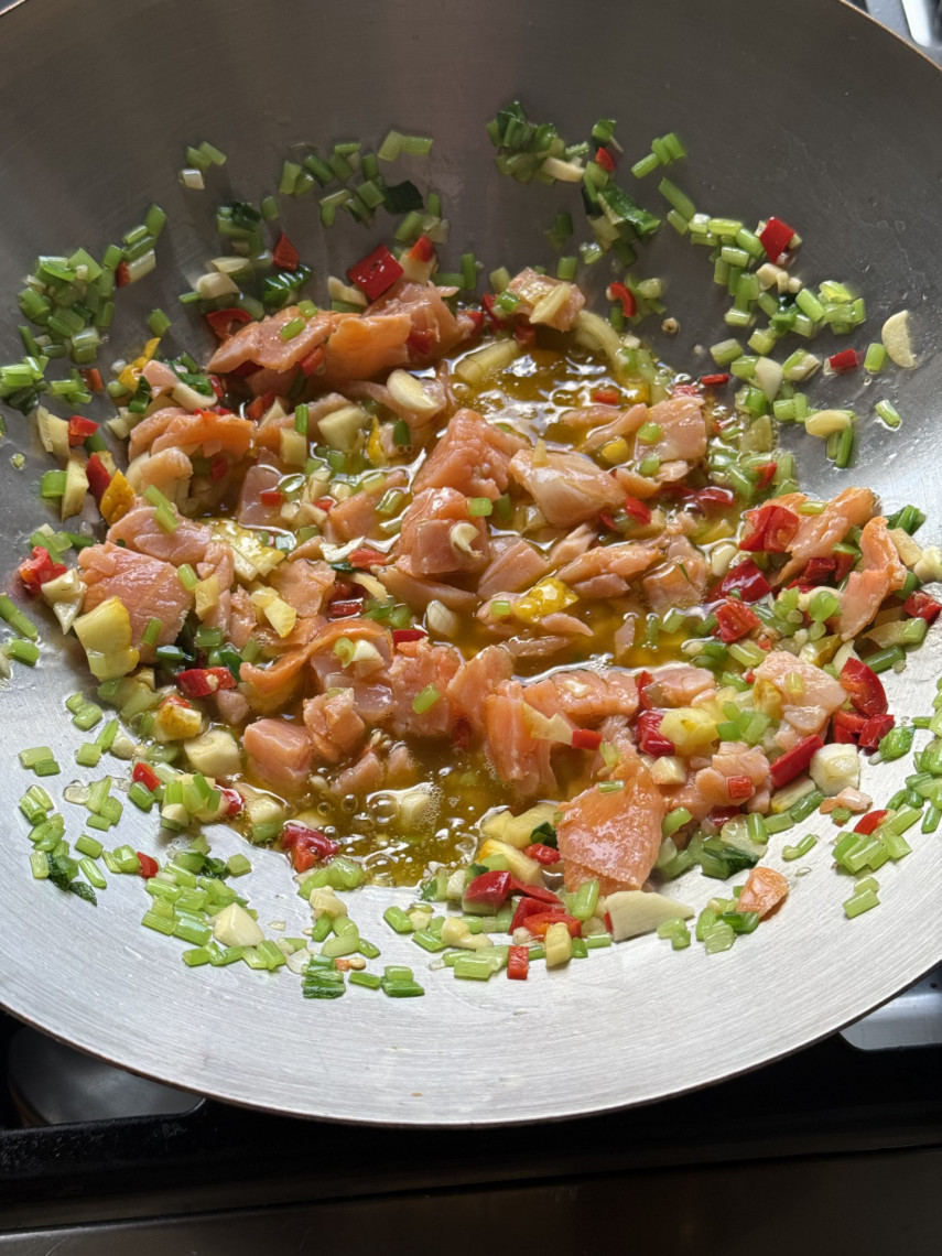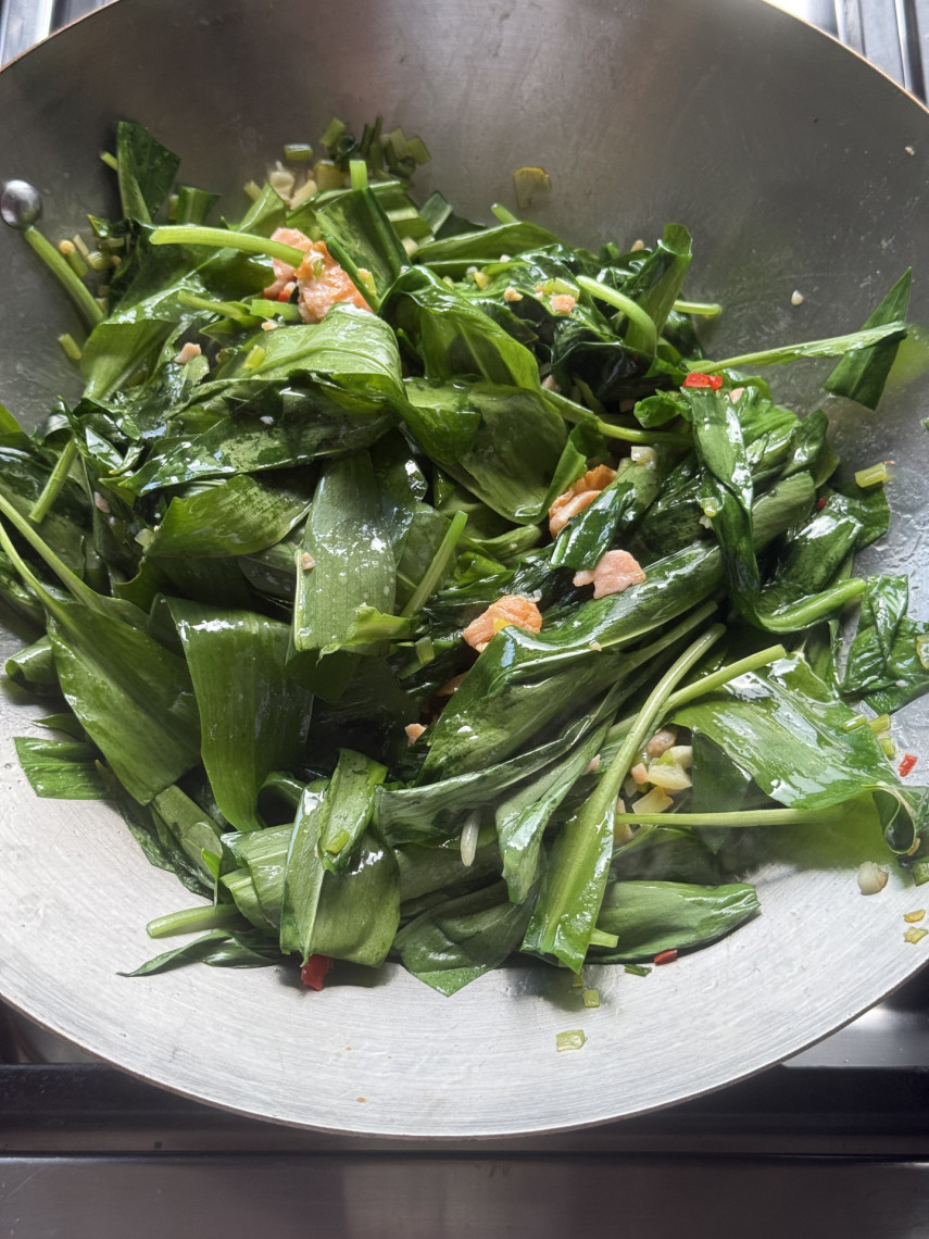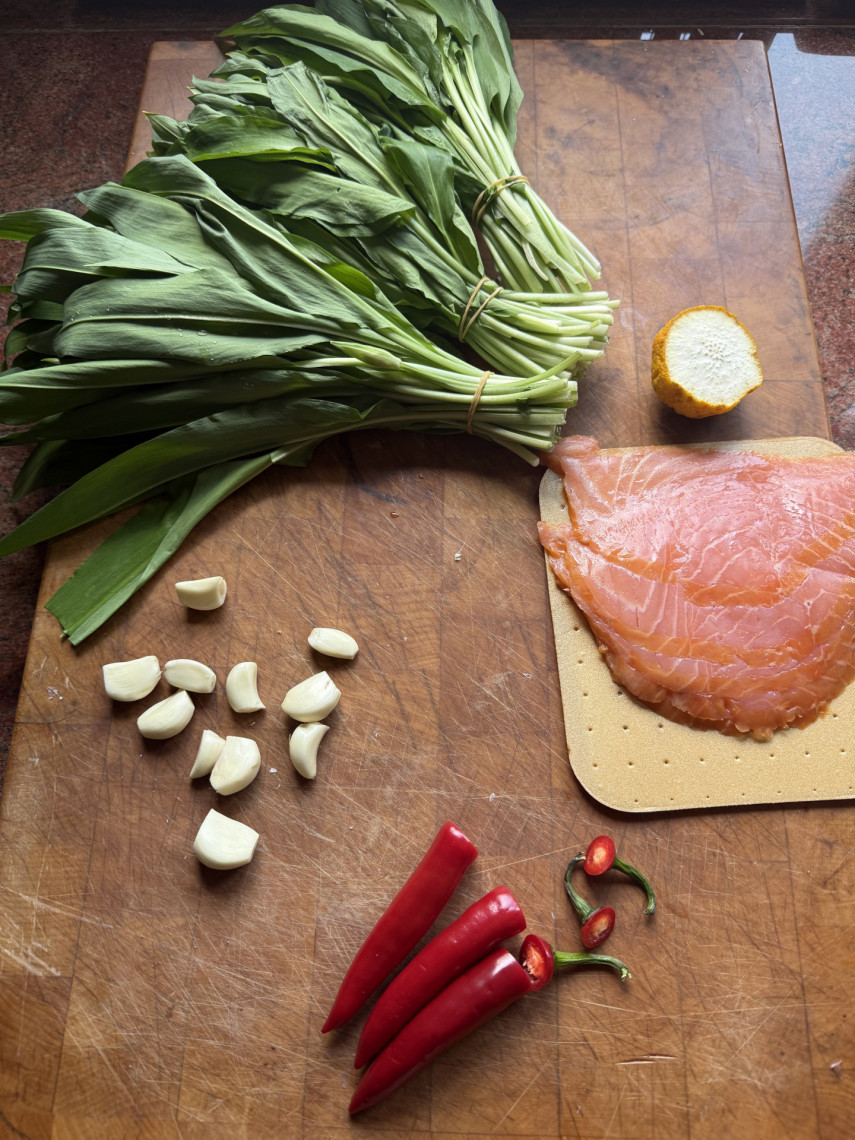 Zubereitung: Klein geschnittene Cedri-Zitrone, Knoblauch, Stengel vom Baerlauch und Peperoni im Wok im Olivenöl 5 Minuten dünsten, dann den geschnitttenen Baerlauch und den klein geschnittenen Räucherlachs hinzugeben, salzen und mit Deckel dünsten, mehrfach wenden und servieren.