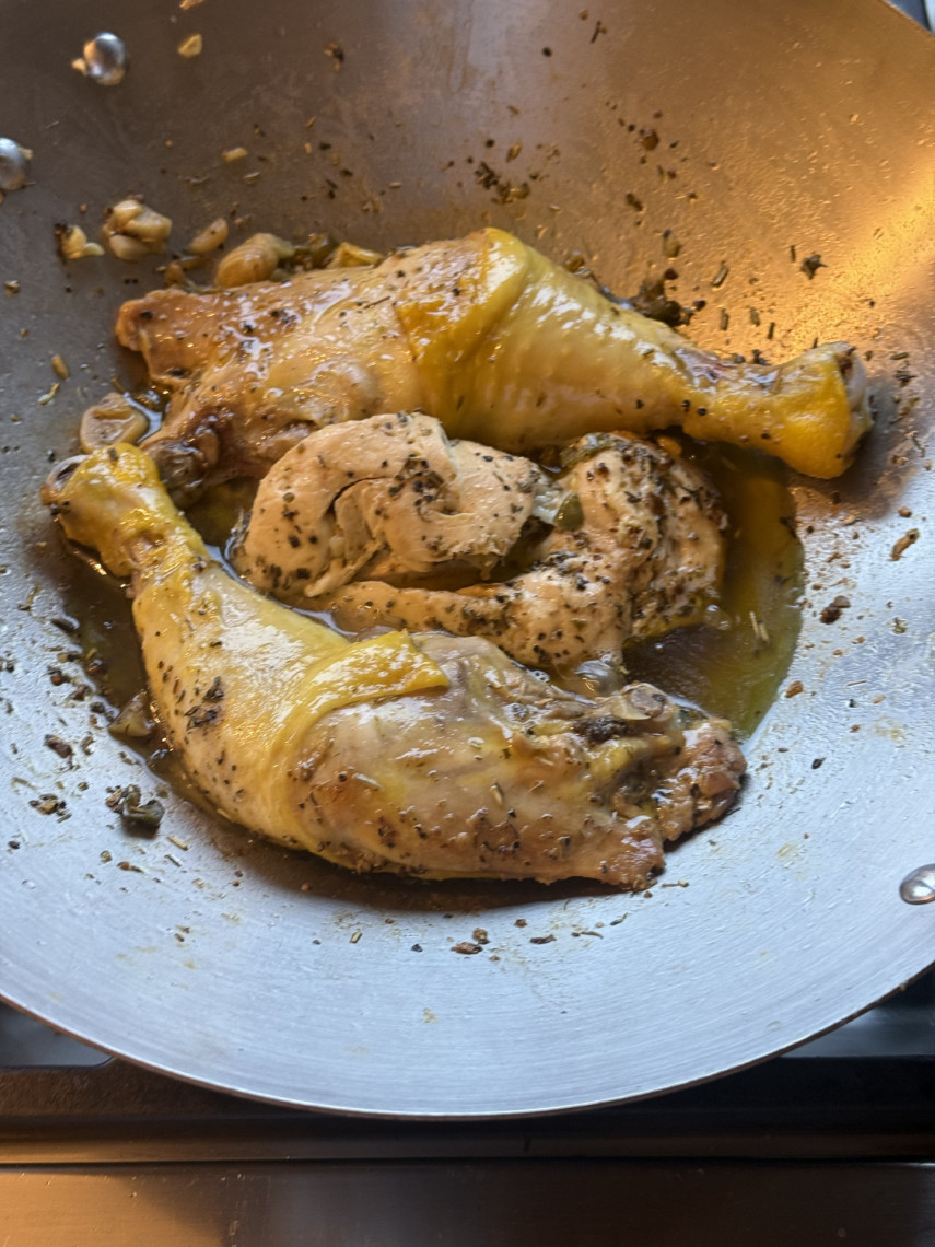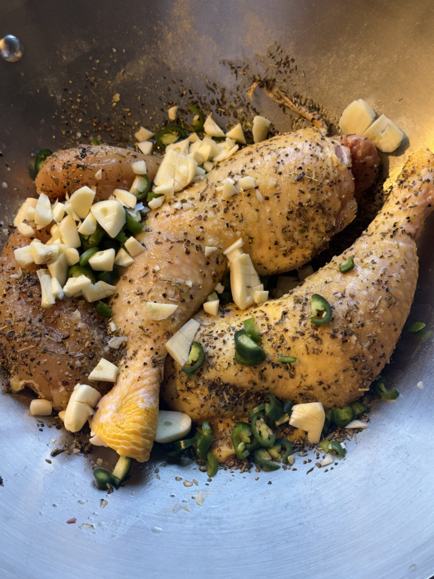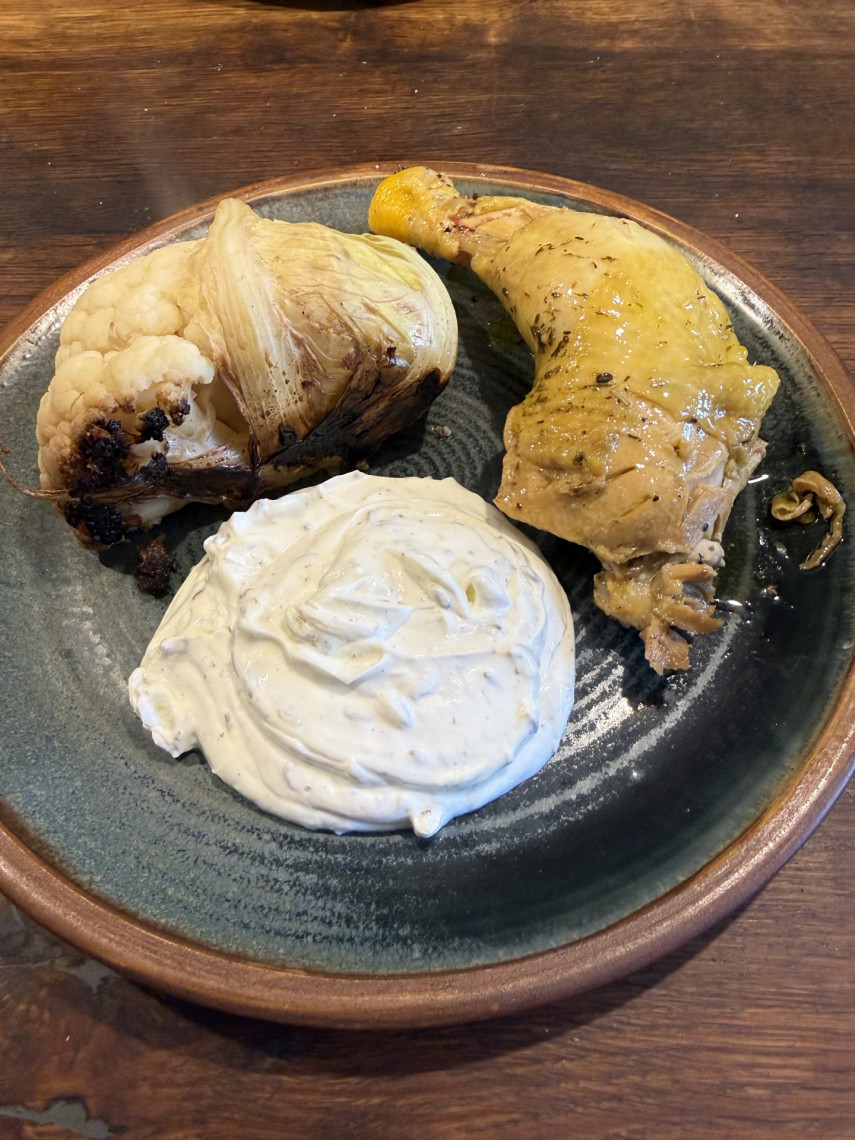Zutaten für 3 Personen 2 Kiko-Schenkel und 1 Kikok-Brust, 1 Blumenkohl, 300 g Joghurt 10%, Olivenöl, 1 Knoblauchknolle, 1 Zitrone, 2 scharfe Peperoni, Kräuter, Meersalz, Fenchelsaat, Olivenöl mit Orange