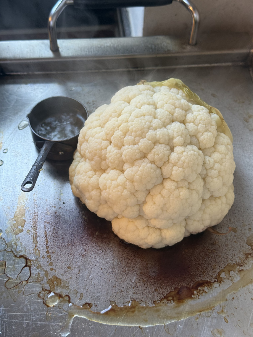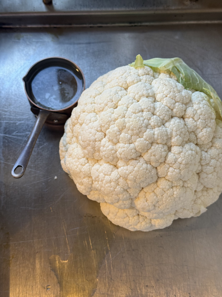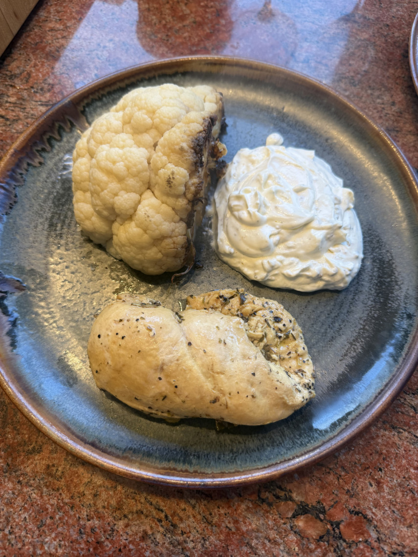 Zubereitung: Kikok-Schenkel und Kikok-Brust in Olivenöl mit Knoblauch, Meersalz, Kräutern, Saft einer halben Zitrone und 2 Peperoni in einer Pfanne oder einem Wok teils mit und teils ohne Deckel dünsten. Blumenkohl auf dem Teppaniaky mit Dampfspender 45 Minuten mit Dampfglocke garen. Servieren mit Creme aus Joghurt, Olivenöl, Meersalz, Saft einer halben Zitrone und gemörserte Fenchelsaat. Beim Servieren die Kikok-Brust und Schenkel mit Orangenöl übergießen.