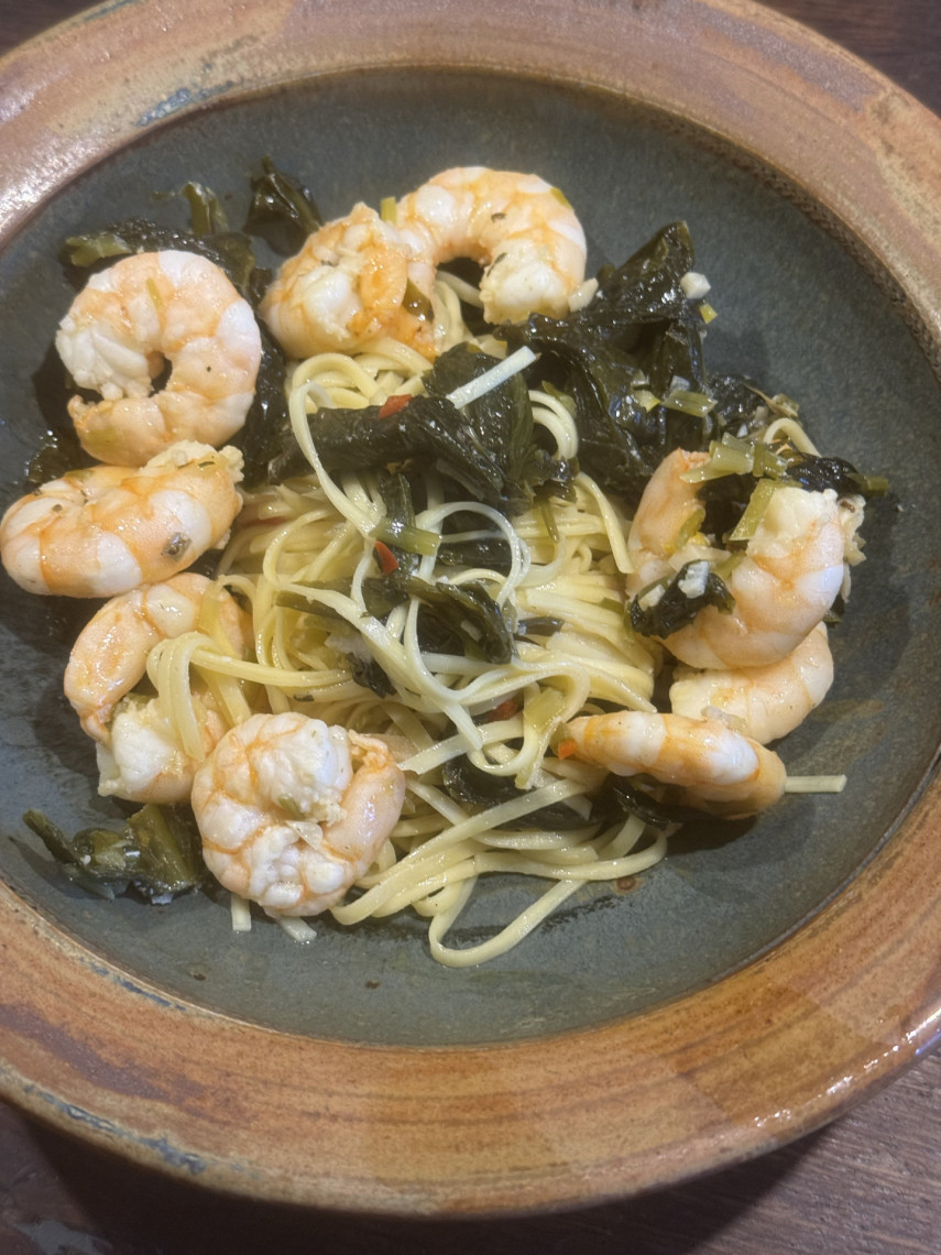 Zutaten für 2 Personen: 120gr. Spaghetti, 460 gr. White Tiger Garnelen (TK-Ware), 1 klein gehackte Knoblauchknolle, 300 g Baerlauch, 2 kleingeschnittene Peperoni, 1 TL Beifuss, grobes Meersalz, Saft einer halben Zitrone, 70 ml Olivenöl,.