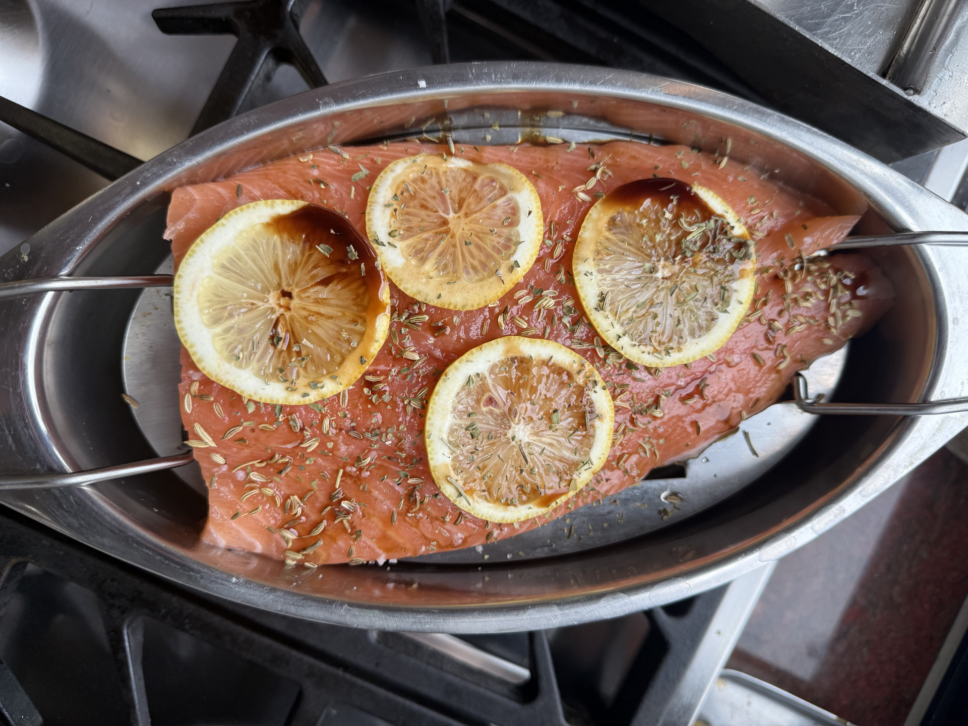 Zutaten: Lachsfilet, Drillinge, Brokkoli, Zitrone, Kräuter der Provence, Meersalz.